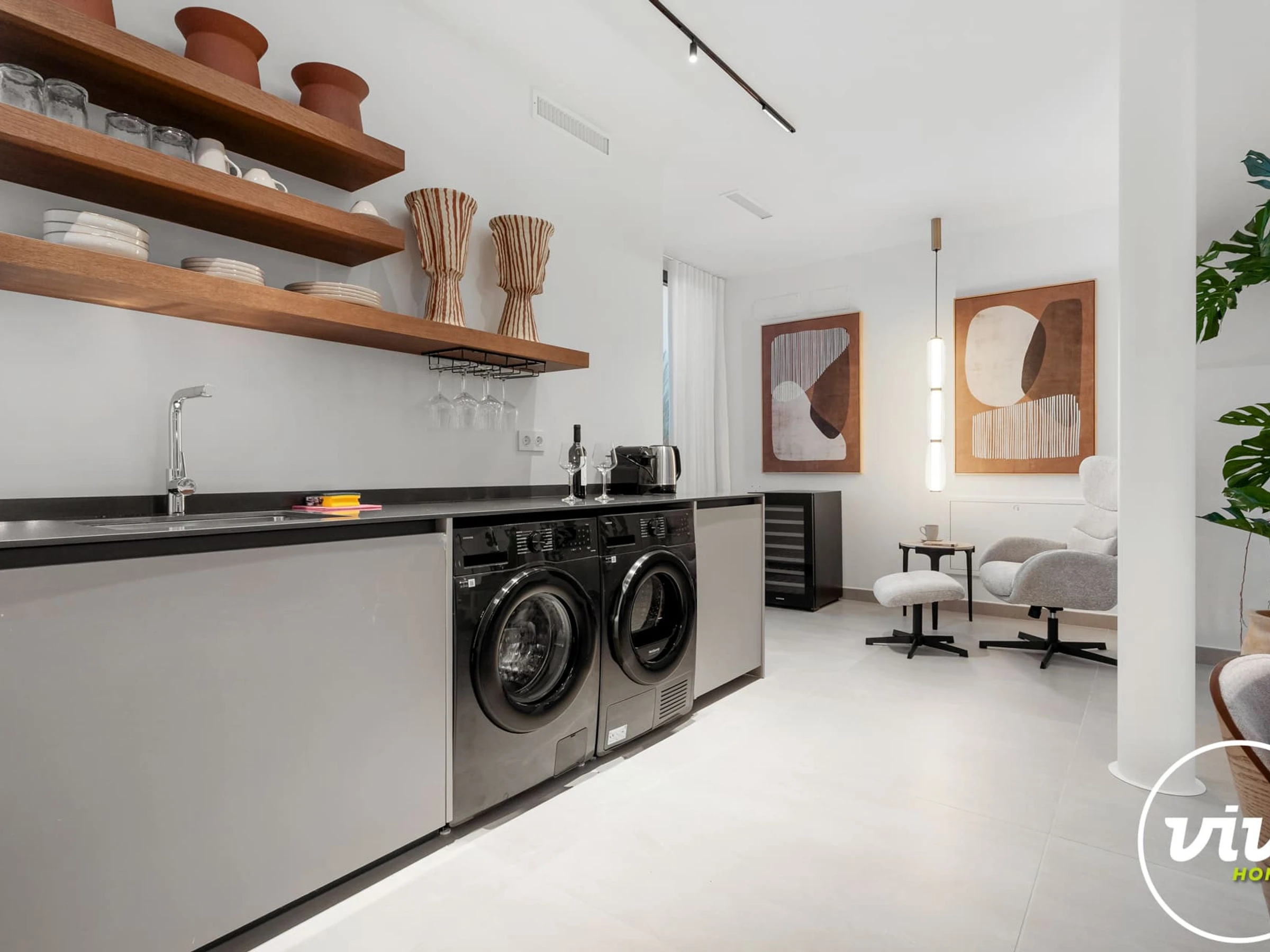 Elle dispose de jardin, mobilier de jardin, clôture, 150 m² de terrasse, lave-linge, sèche-linge, barbecue, fer à repasser, coffre-fort, accès internet (wifi), sèche-cheveux, balcon, chauffage central, climatisation dans tout le logement, piscine privée, parking couvert bâtiment proche, 2 Télévisions.