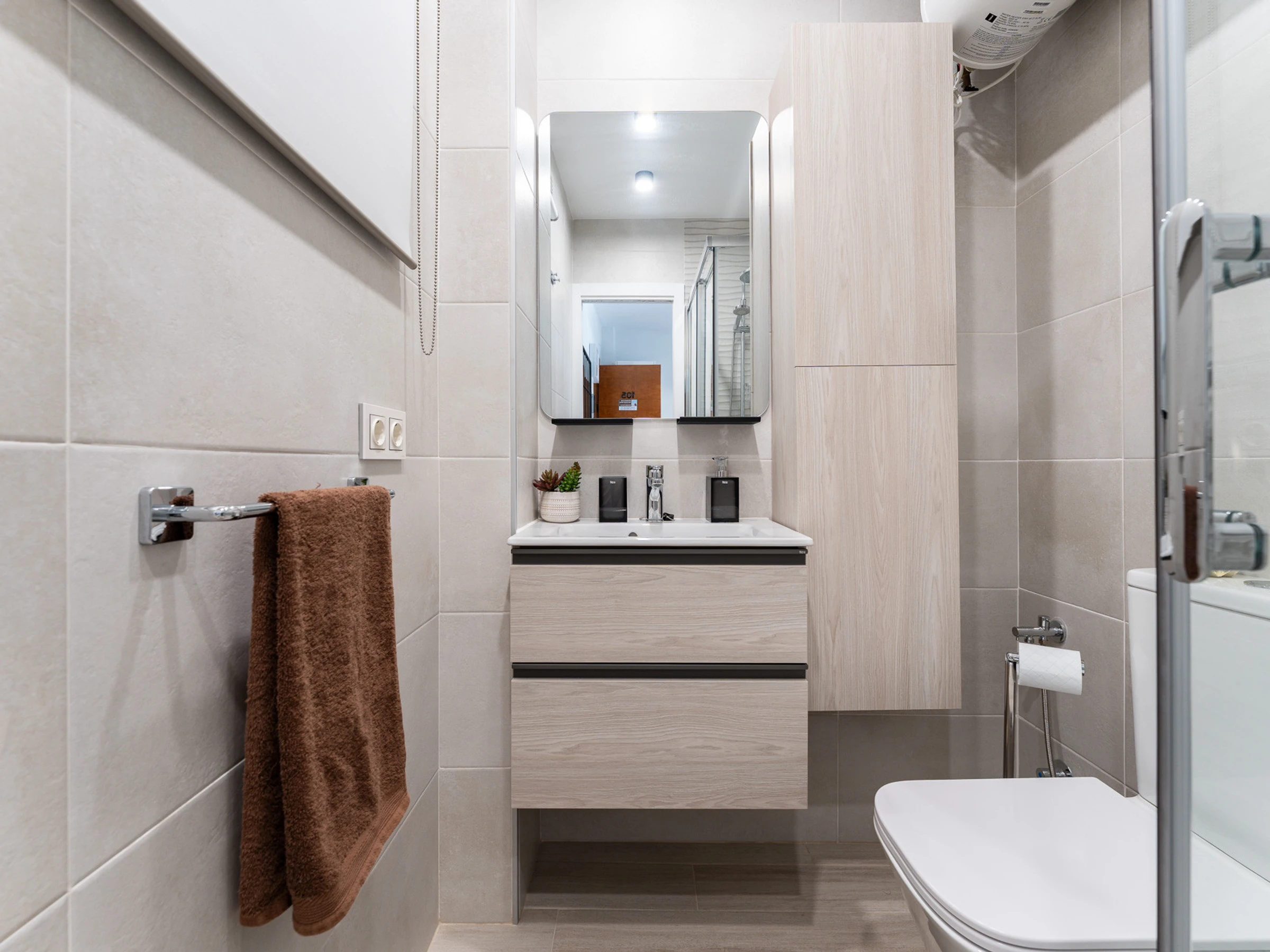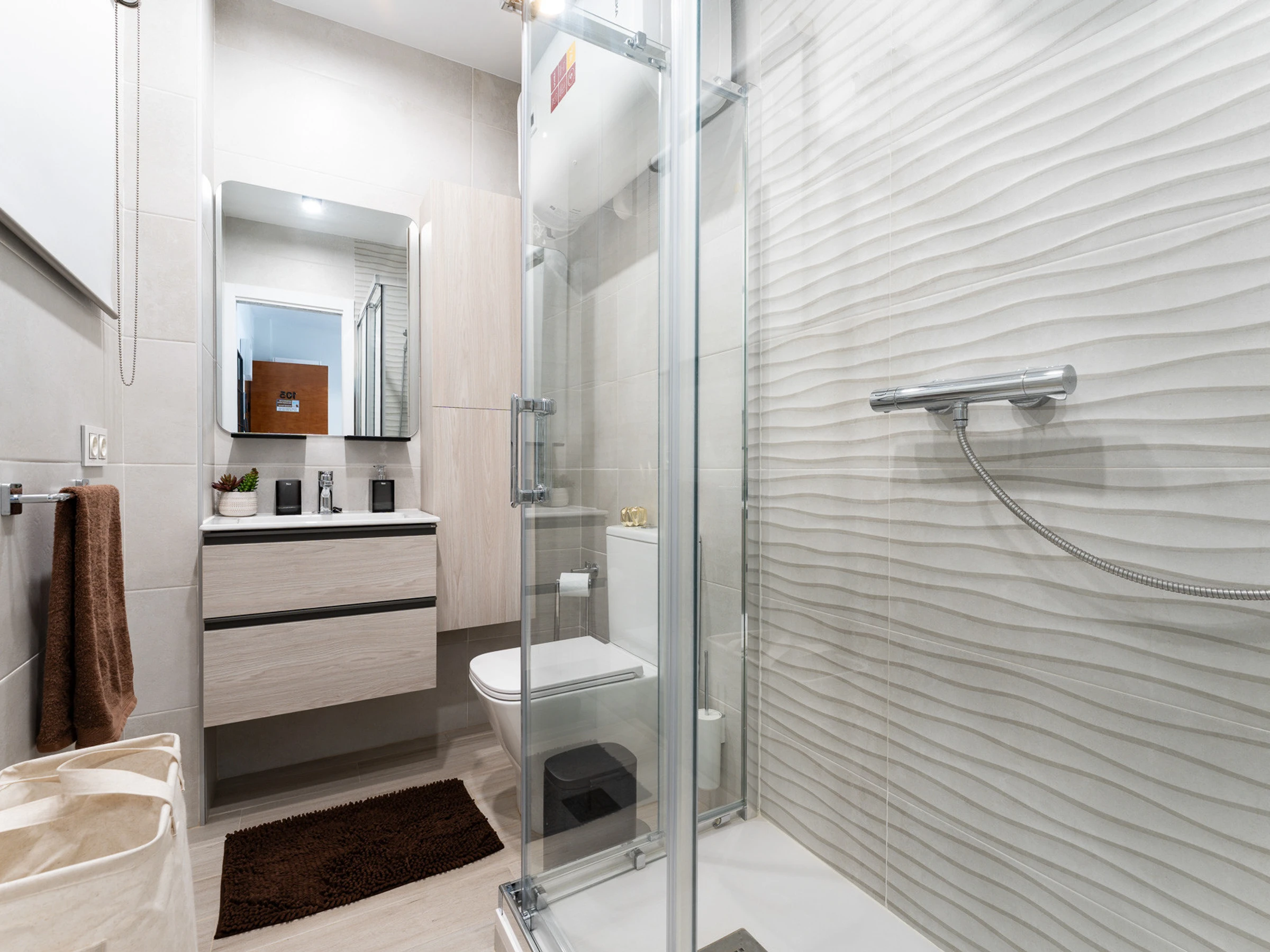 L'appartement dispose d'une chambre principale avec un lit double, parfait pour se reposer après une journée d'exploration. Il comprend une salle de bain complète avec douche, la climatisation et le chauffage par pompe à chaleur pour garantir votre confort à toute époque de l'année.