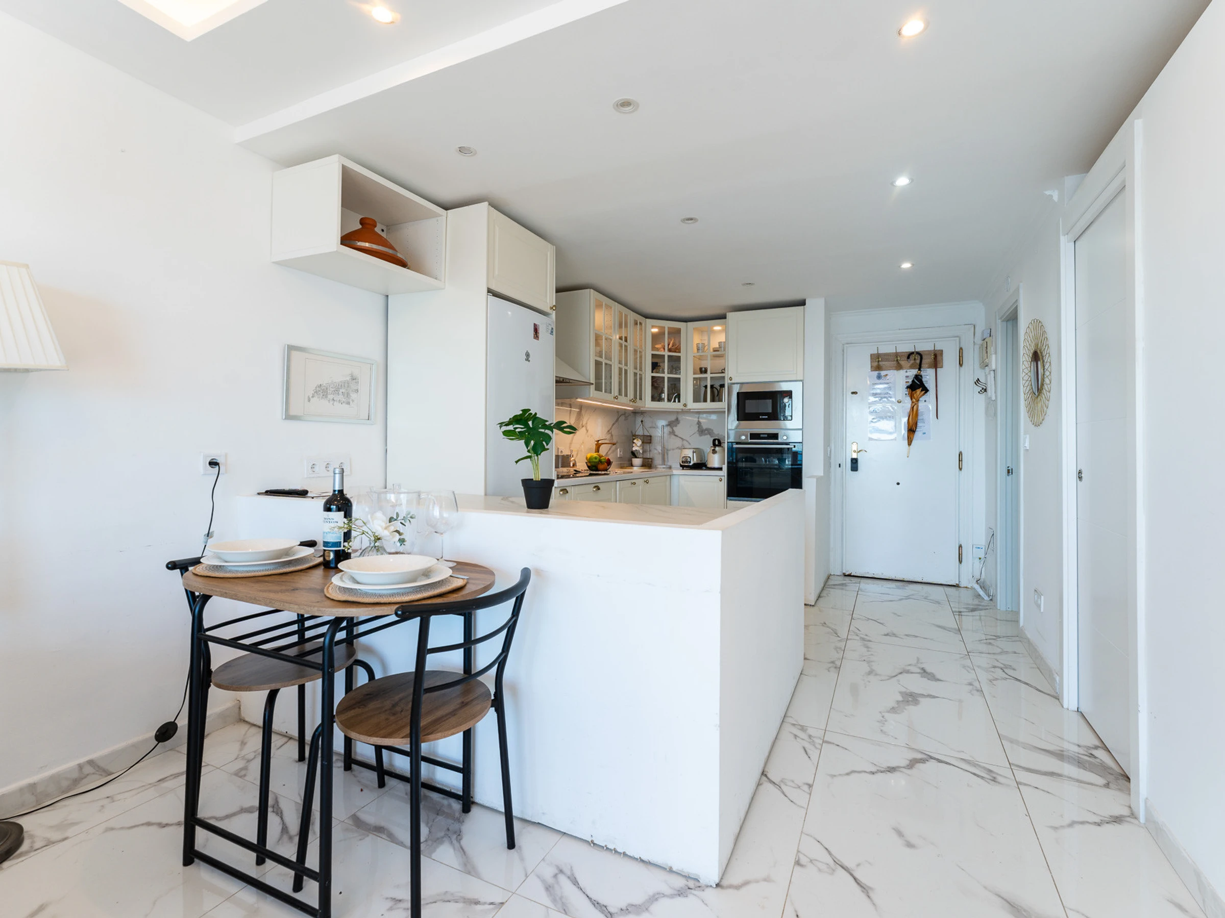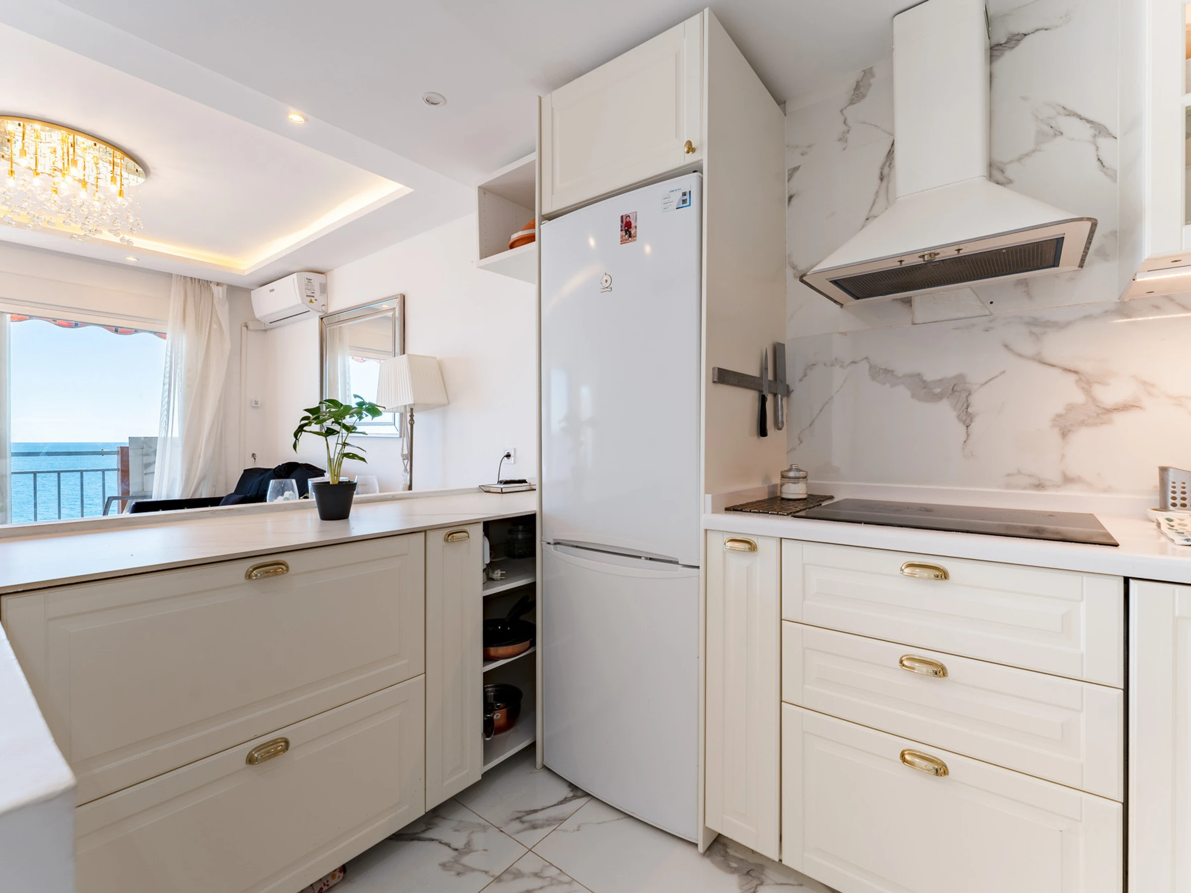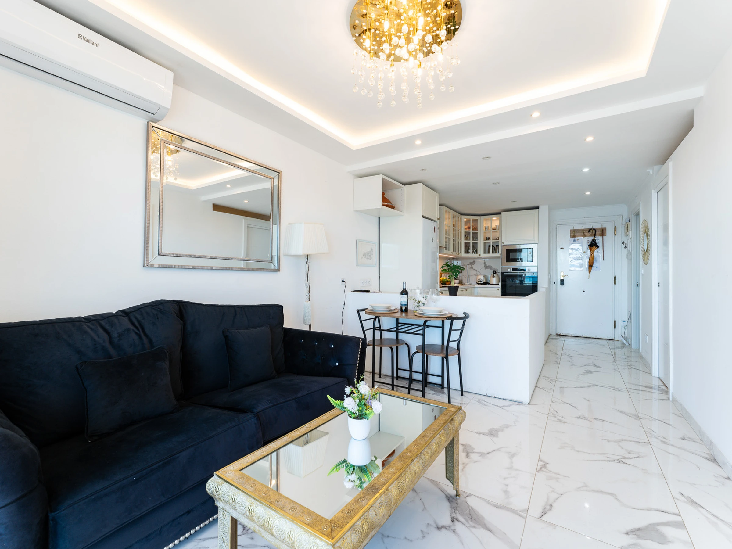 L'appartement est très ensoleillé et dispose d'un salon-salle à manger intégré à la cuisine, ce qui apporte une grande sensation d'espace et de luminosité. Il est équipé de la climatisation dans le salon et d'une cuisine entièrement équipée avec tout le nécessaire.