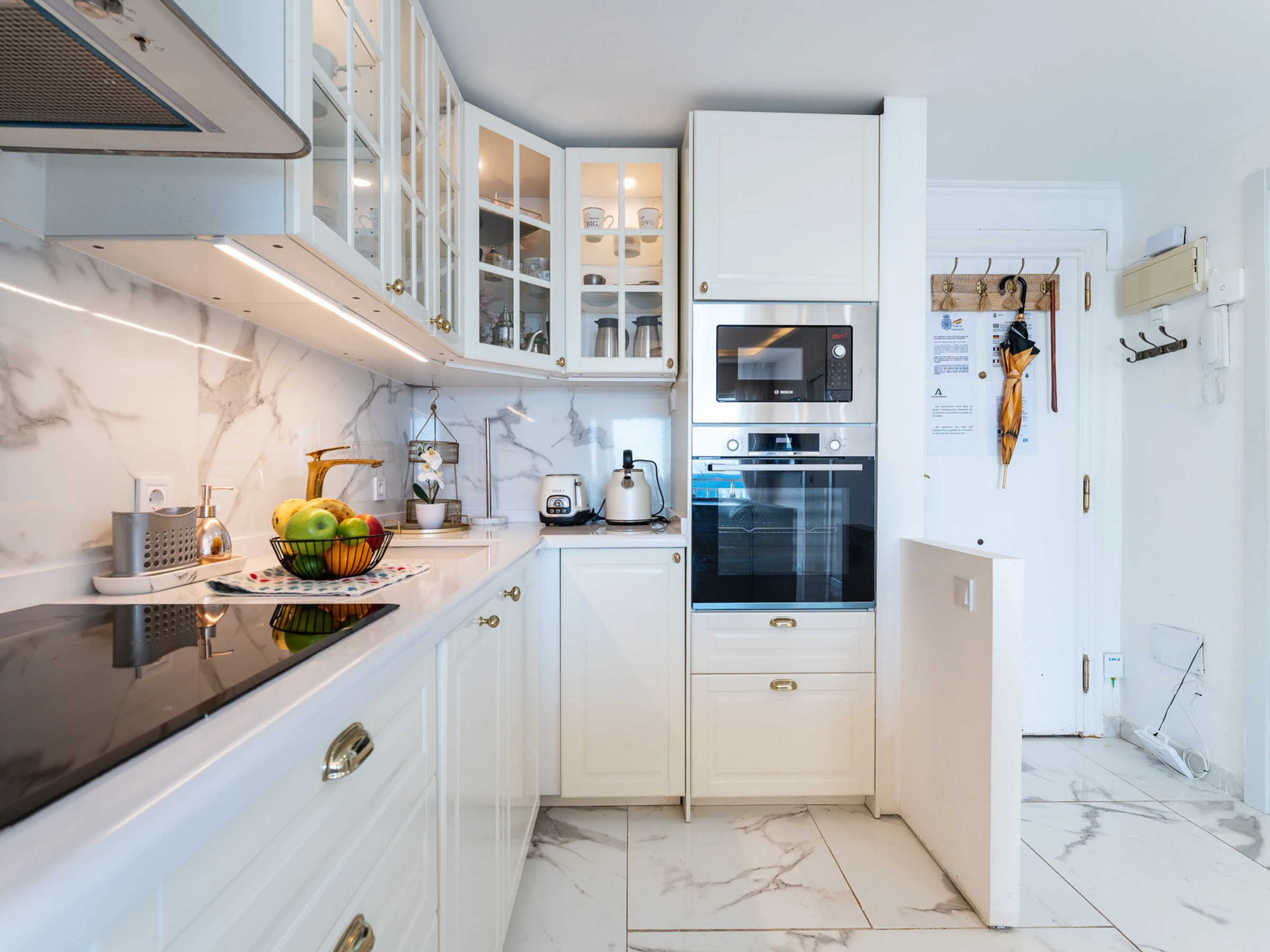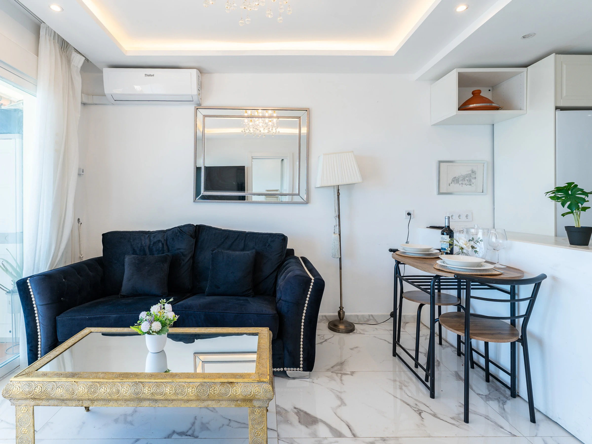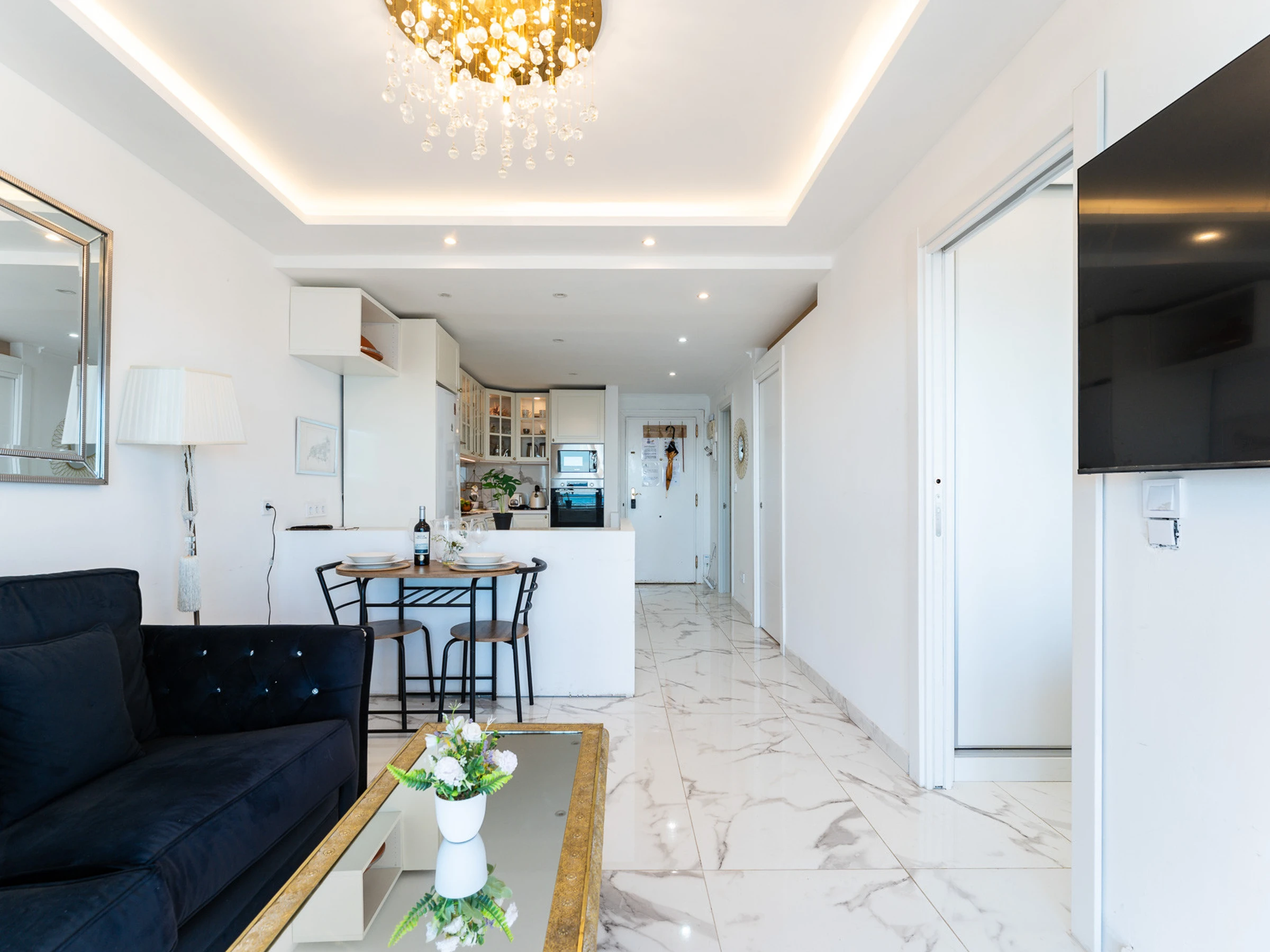 L'appartement est très ensoleillé et dispose d'un salon-salle à manger intégré à la cuisine, ce qui apporte une grande sensation d'espace et de luminosité. Il est équipé de la climatisation dans le salon et d'une cuisine entièrement équipée avec tout le nécessaire.