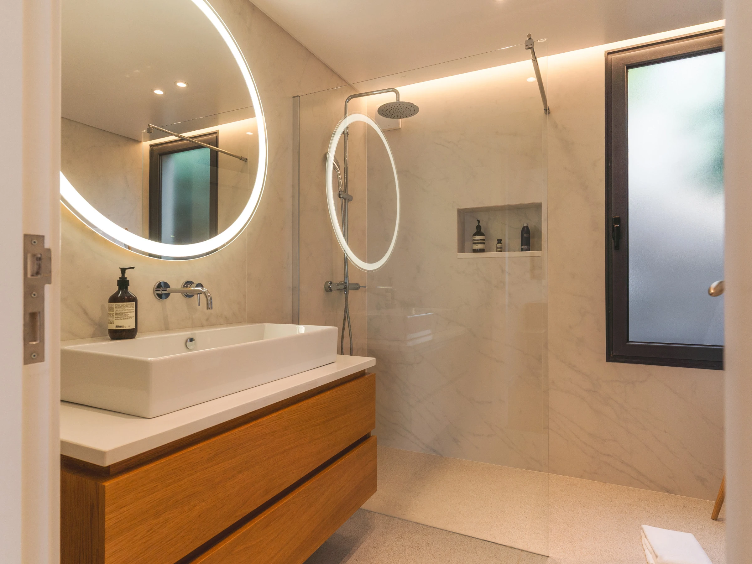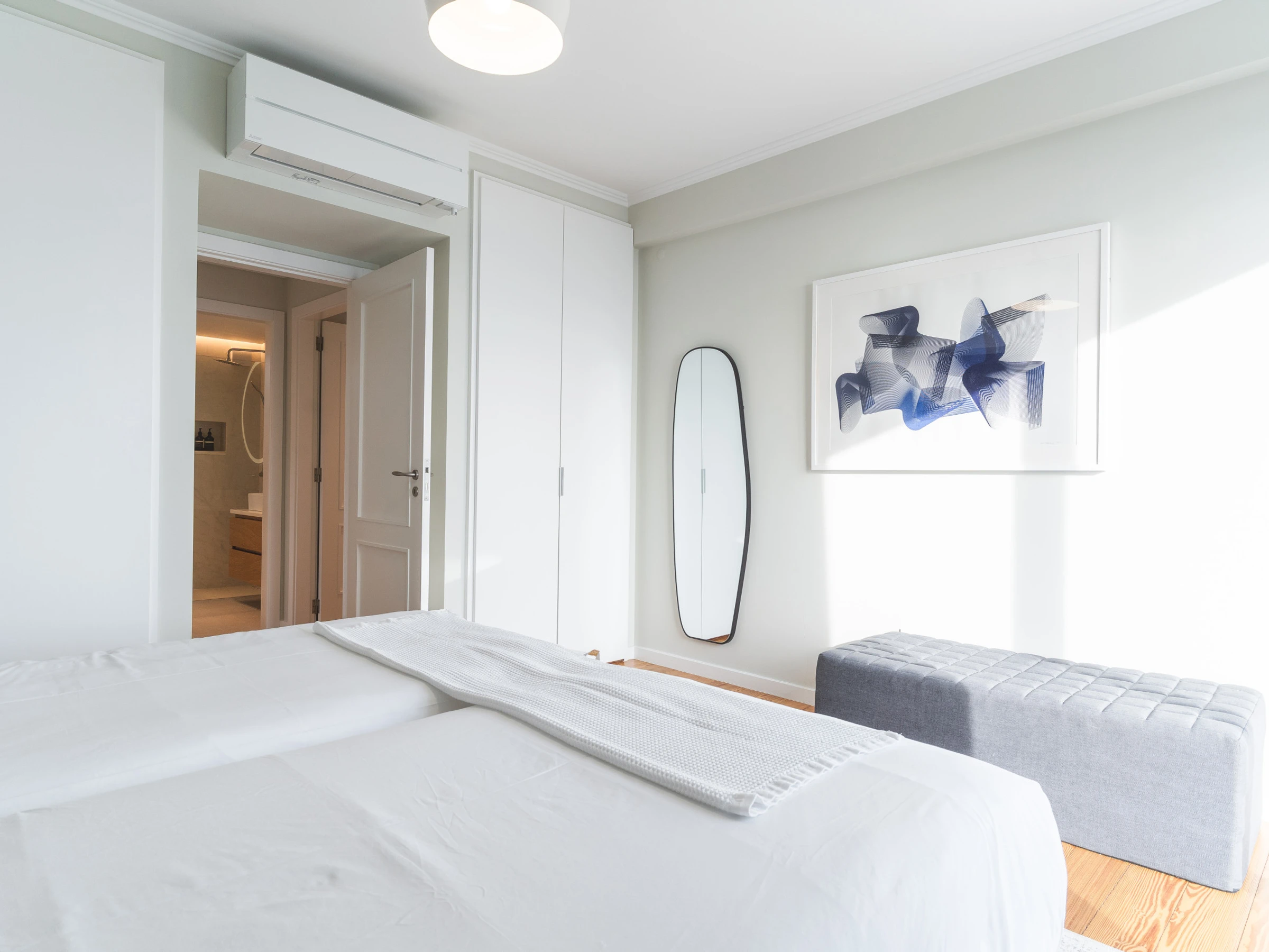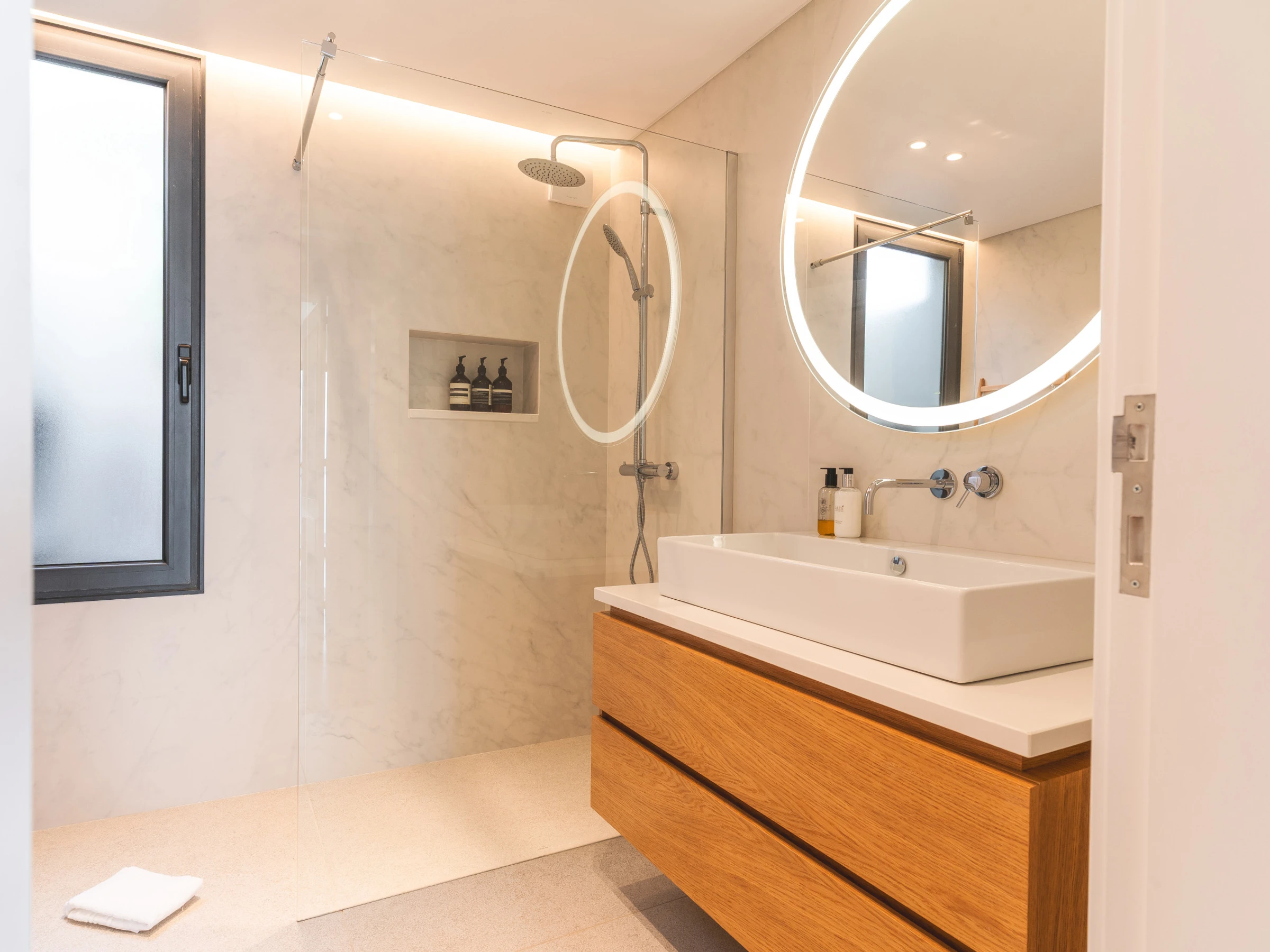 La villa dispose de trois chambres, dont deux avec des lits queen size et une avec deux lits simples. Un canapé-lit supplémentaire est disponible dans l'espace bureau. Il y a trois salles de bains avec douches, dont une en suite dans la chambre principale, plus des toilettes d'invités supplémentaires.