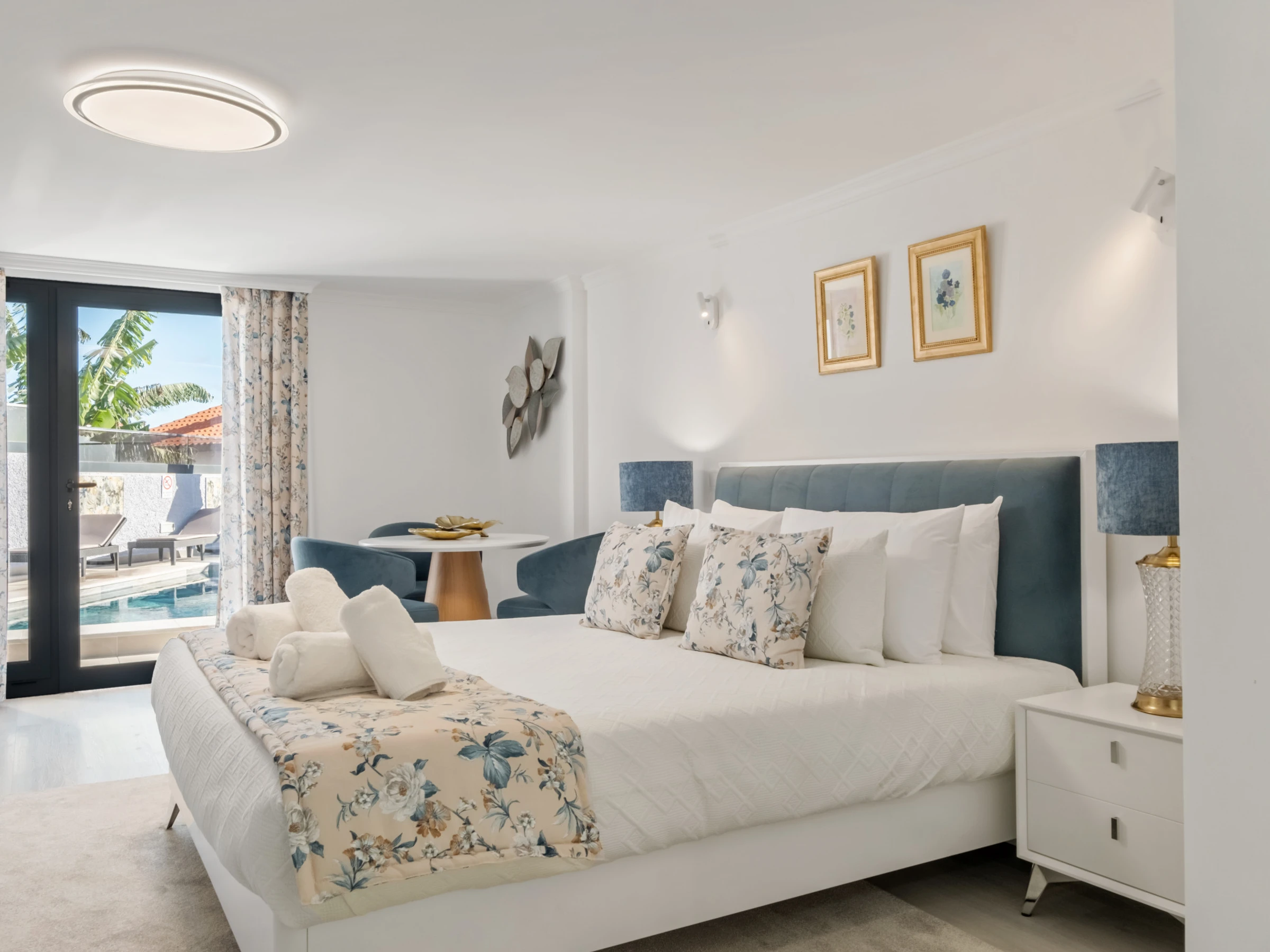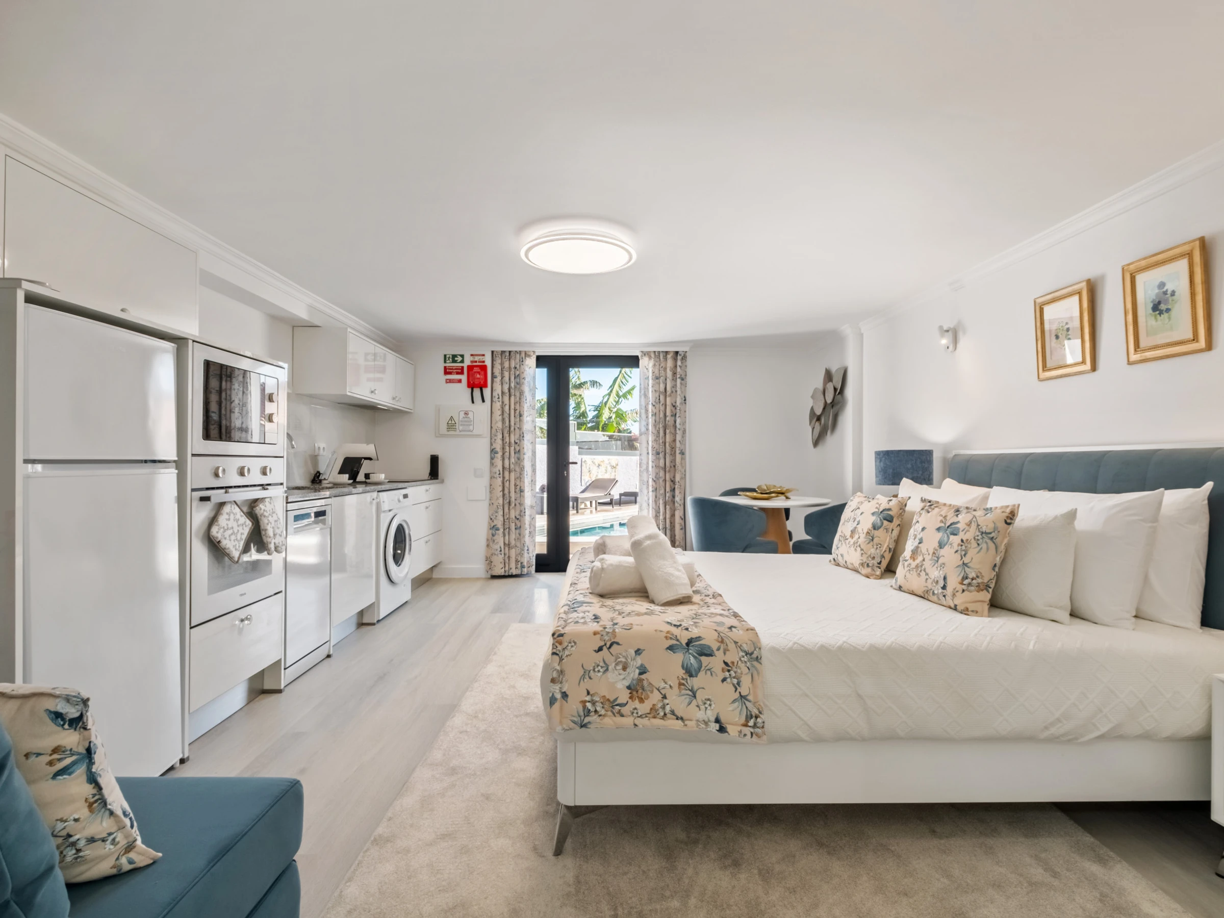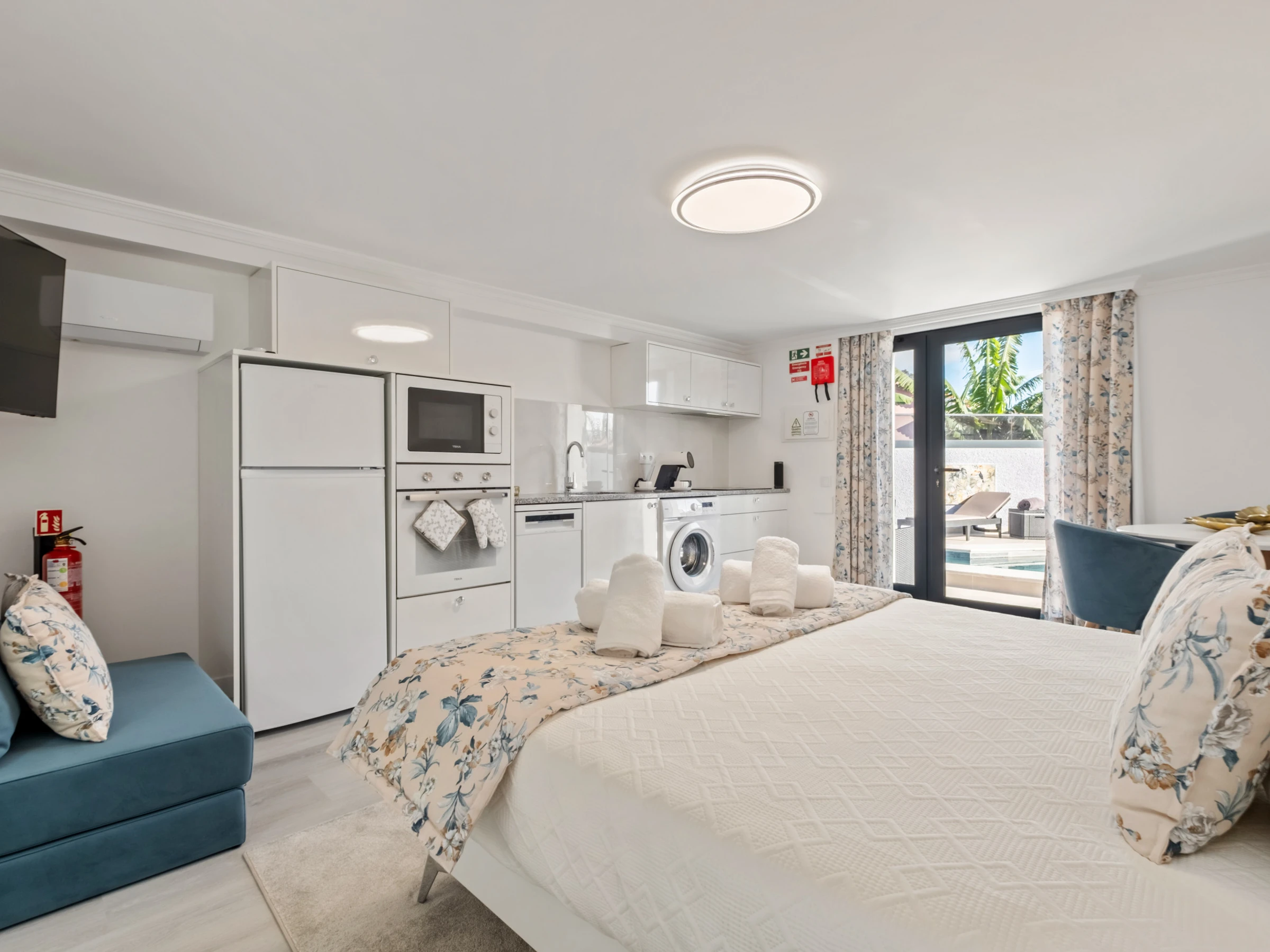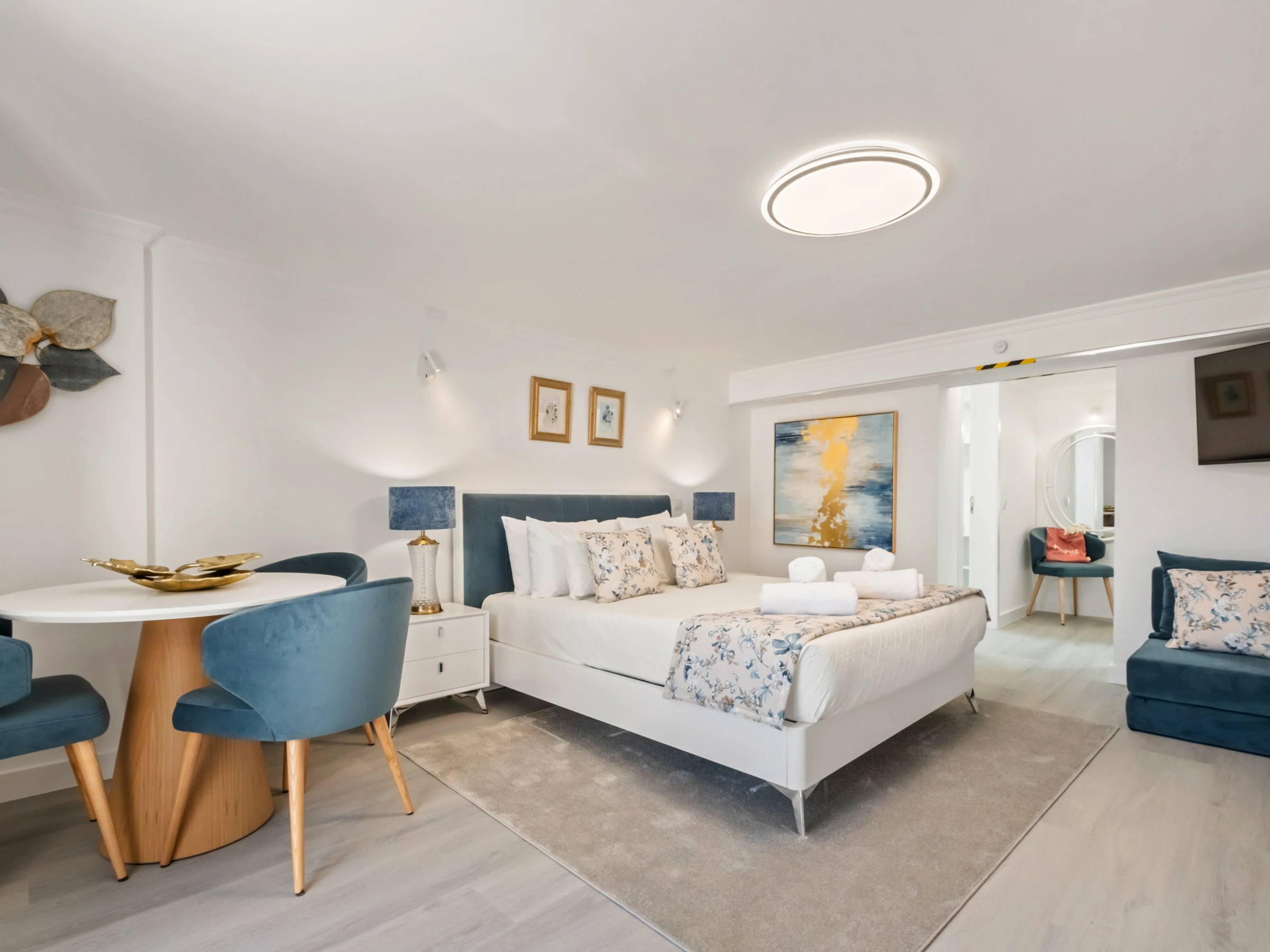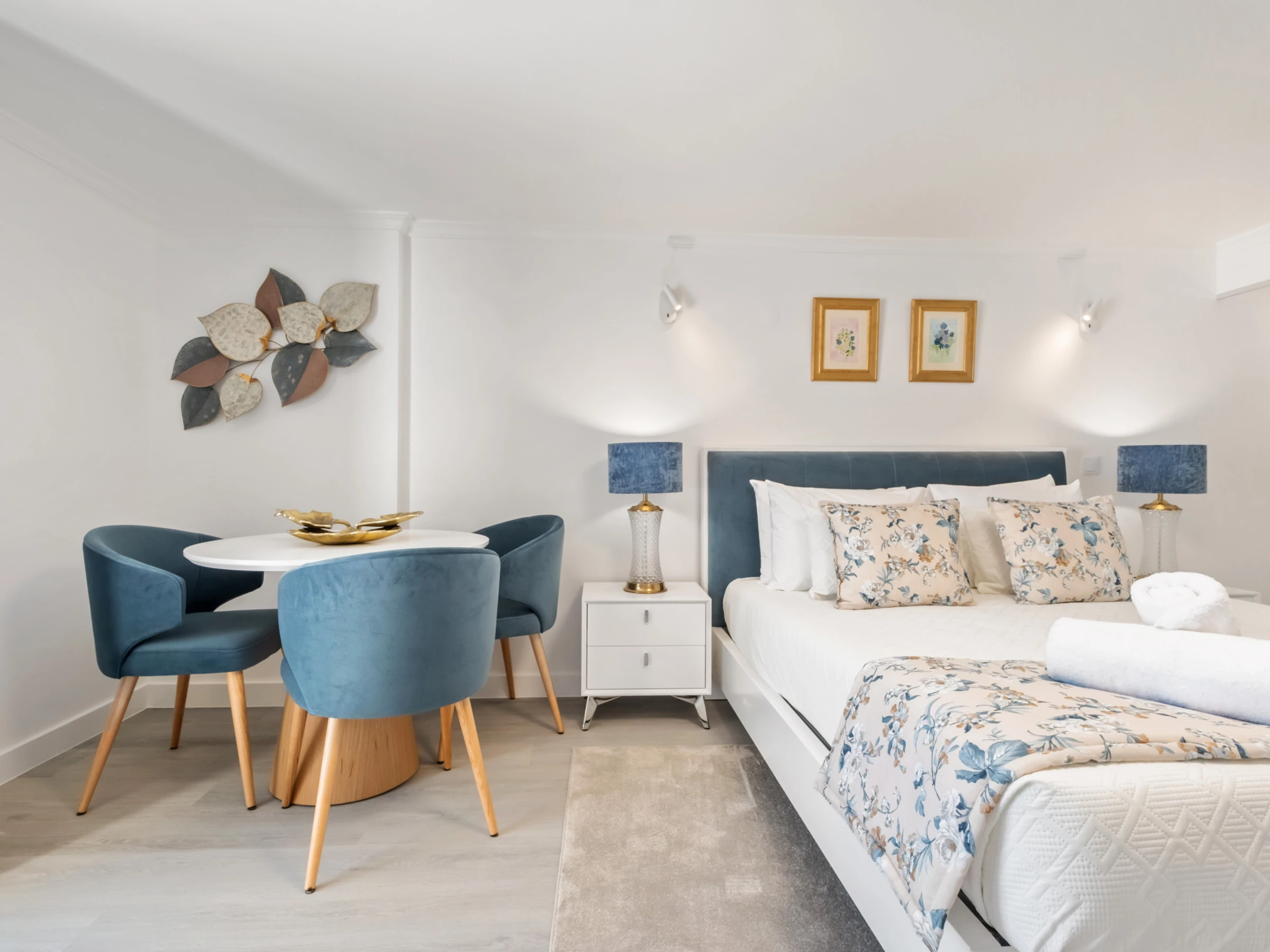 La Blue Room est idéale pour les couples qui recherchent du repos et de la sérénité. Avec des tons de bleu et de blanc, le studio transmet la tranquillité, l'harmonie et une atmosphère relaxante, parfaite pour ralentir et profiter de Madère avec calme.