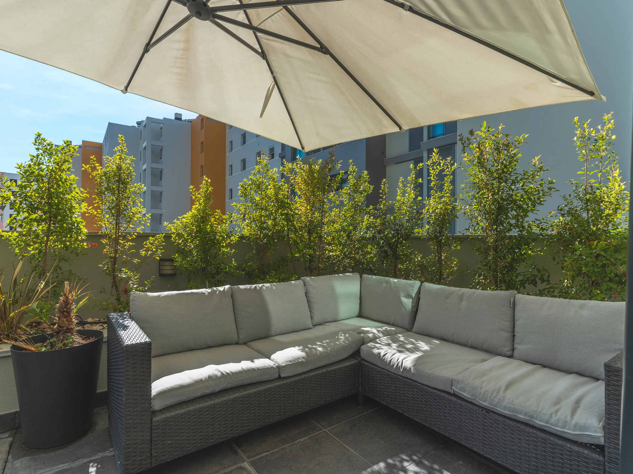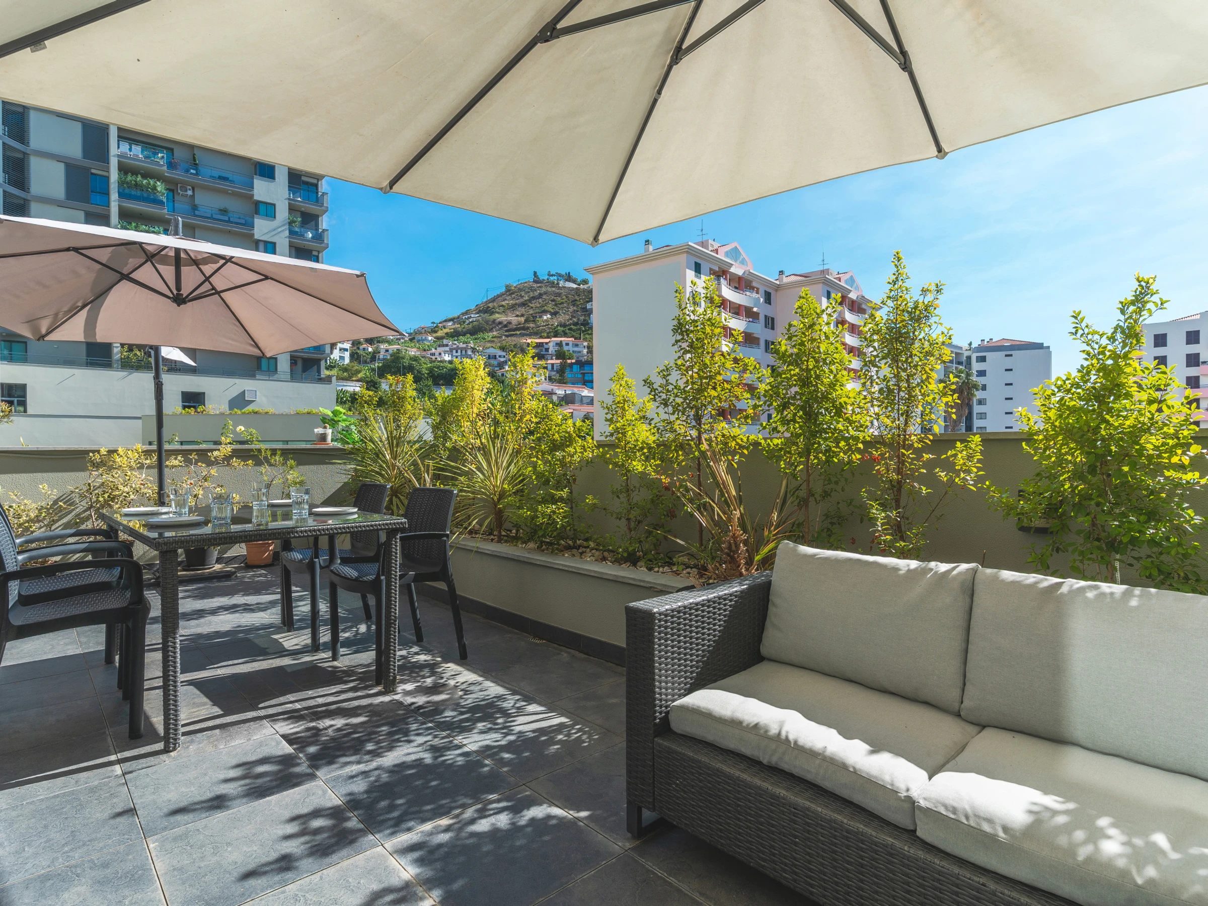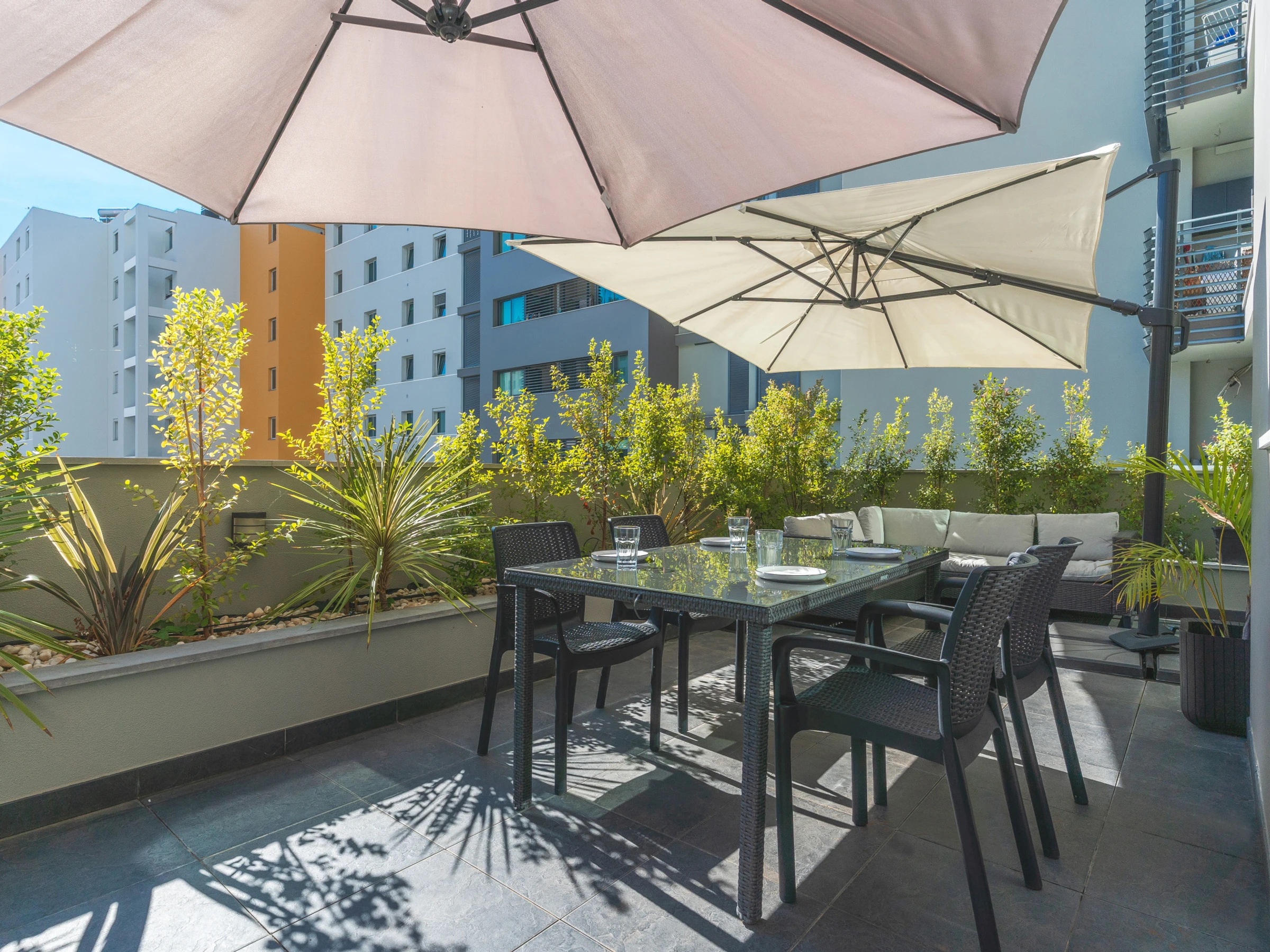L'appartement Terrace est un appartement moderne et confortable. Il se compose d'une chambre avec un lit double et d'une grande armoire. Le salon dispose d'une Smart TV moderne, d'une box avec plusieurs chaines TV à votre disposition, du Wi-Fi rapide avec 200Mbps, d'un balcon côté salon et d'une terrasse côté cuisine.