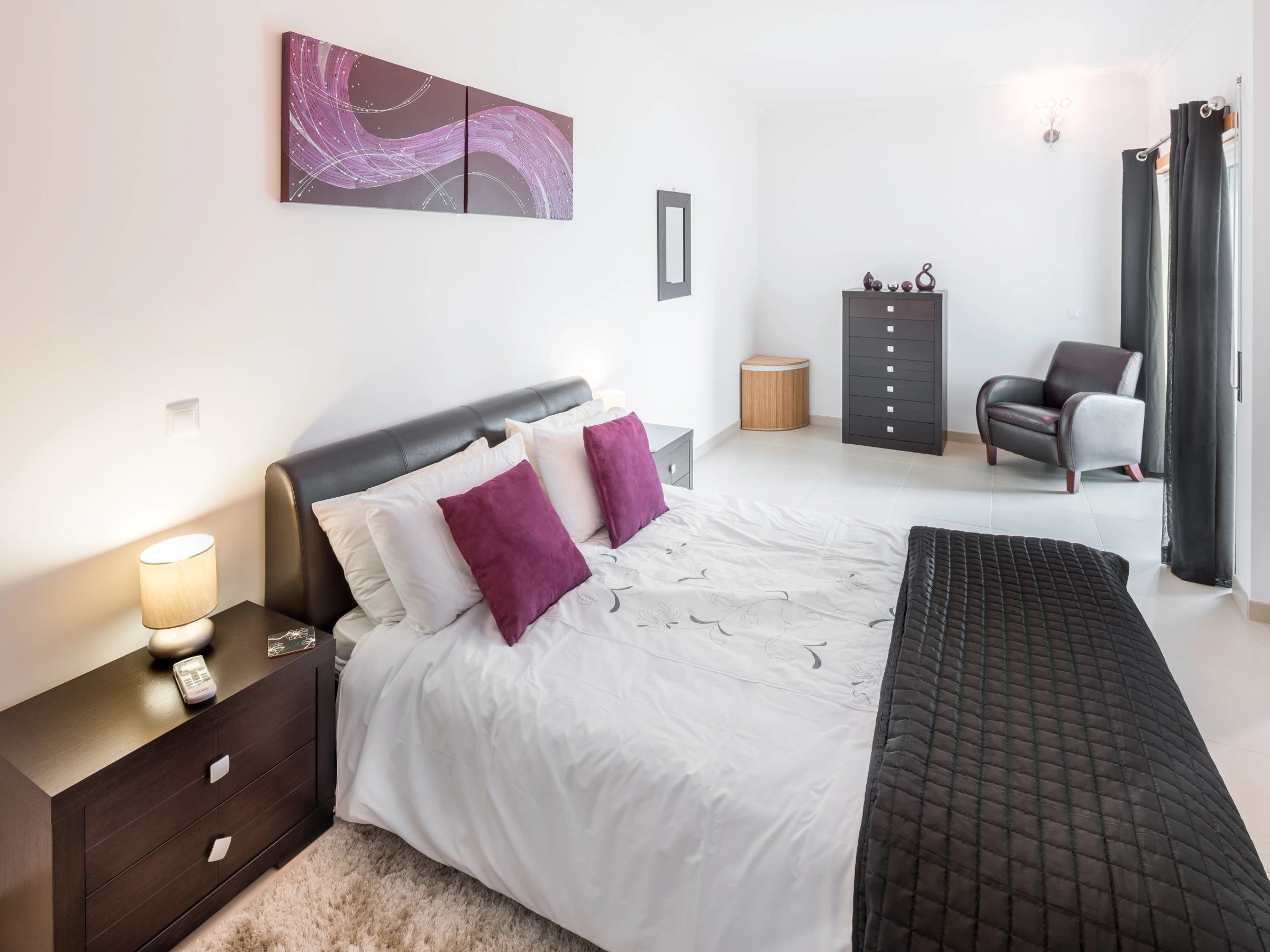 o Chambre principale avec un lit king-size, salle de bain attenante (cabine de douche) et ample espace de rangement.