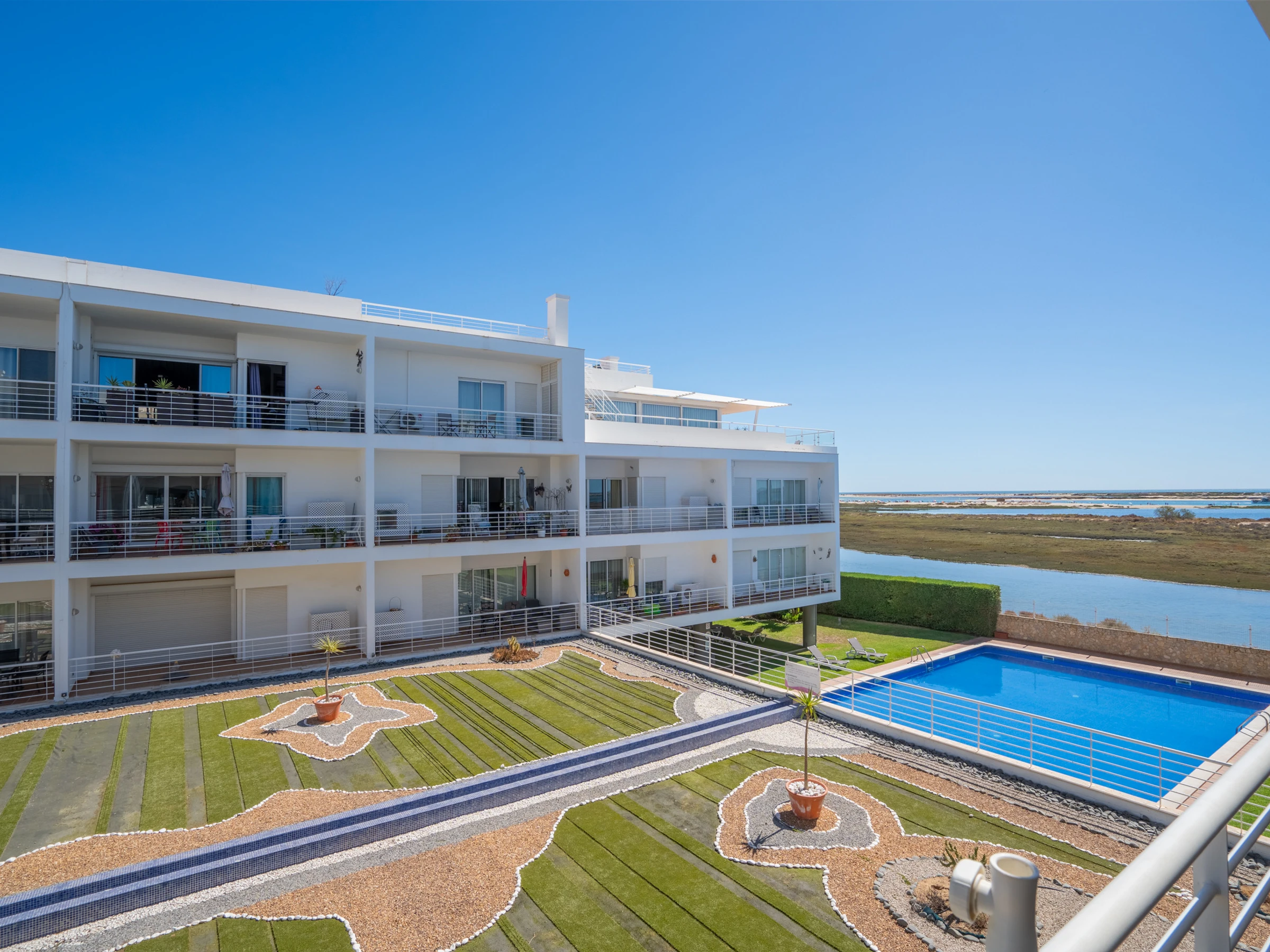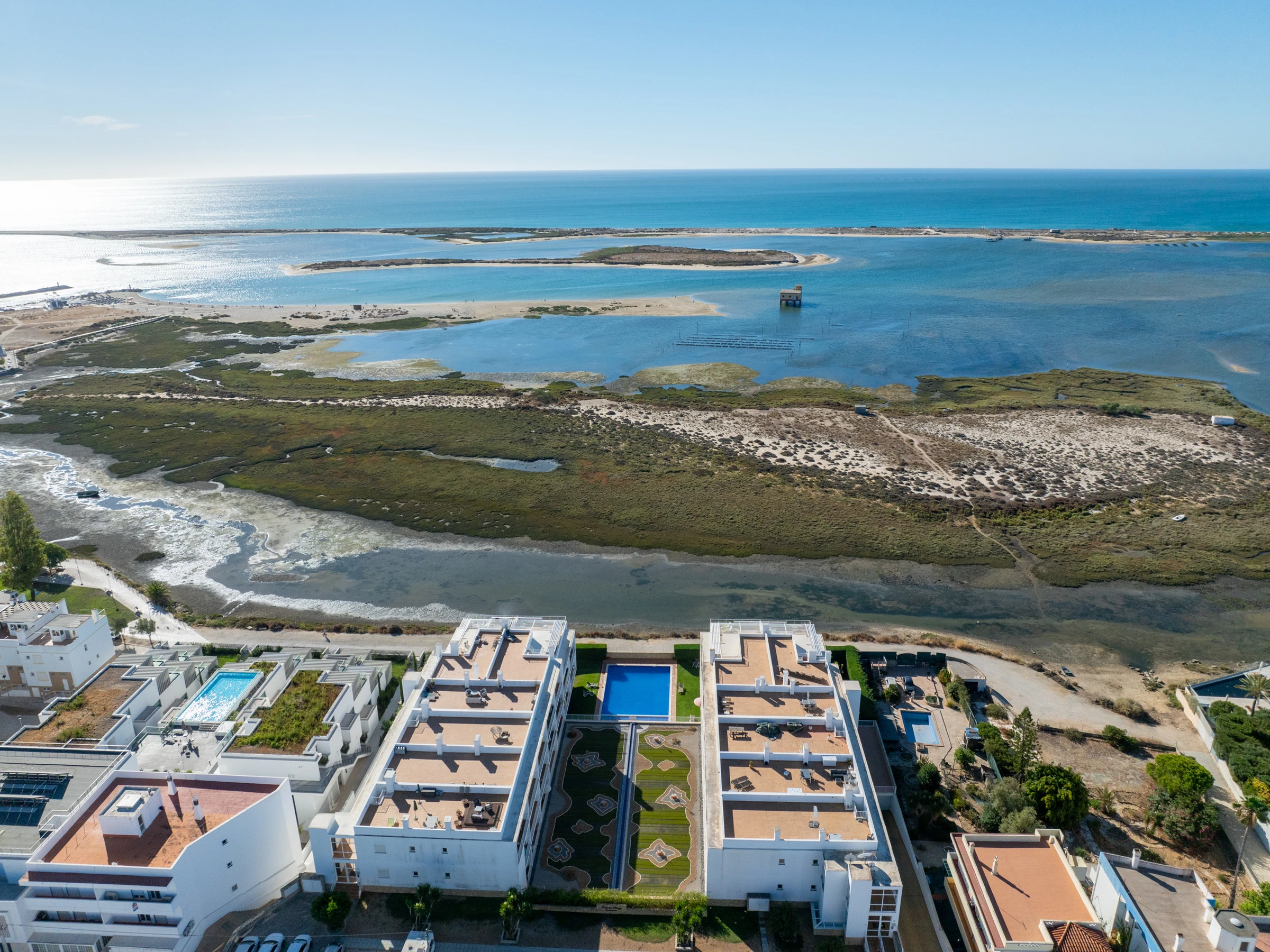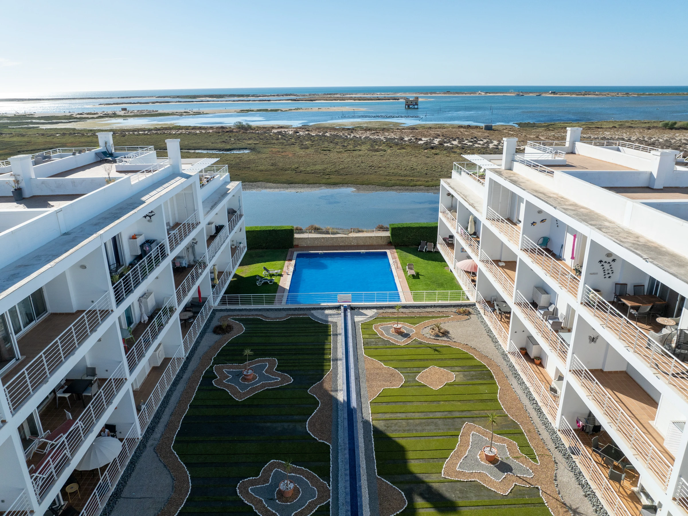 Ce magnifique appartement du premier étage offre une vue splendide sur la lagune de Ria Formosa en direction de l'océan Atlantique. Au cœur de celui-ci se trouve un espace de vie lumineux et ouvert qui combine un salon élégant avec vue sur la mer, une cuisine entièrement équipée et un coin repas idéal pour des repas décontractés ou des réceptions.