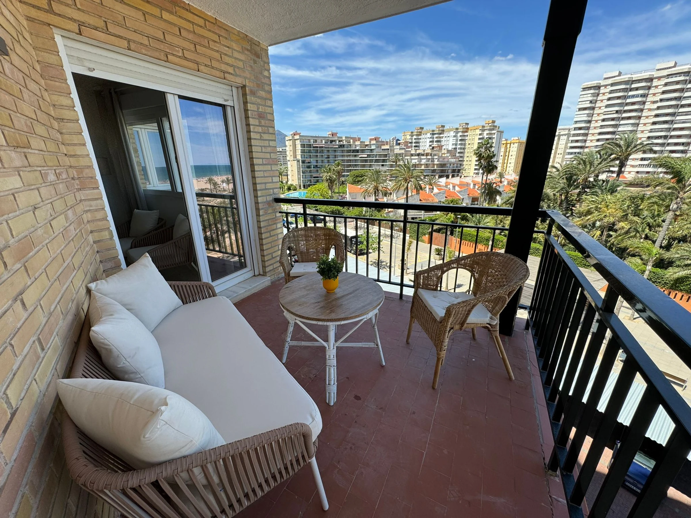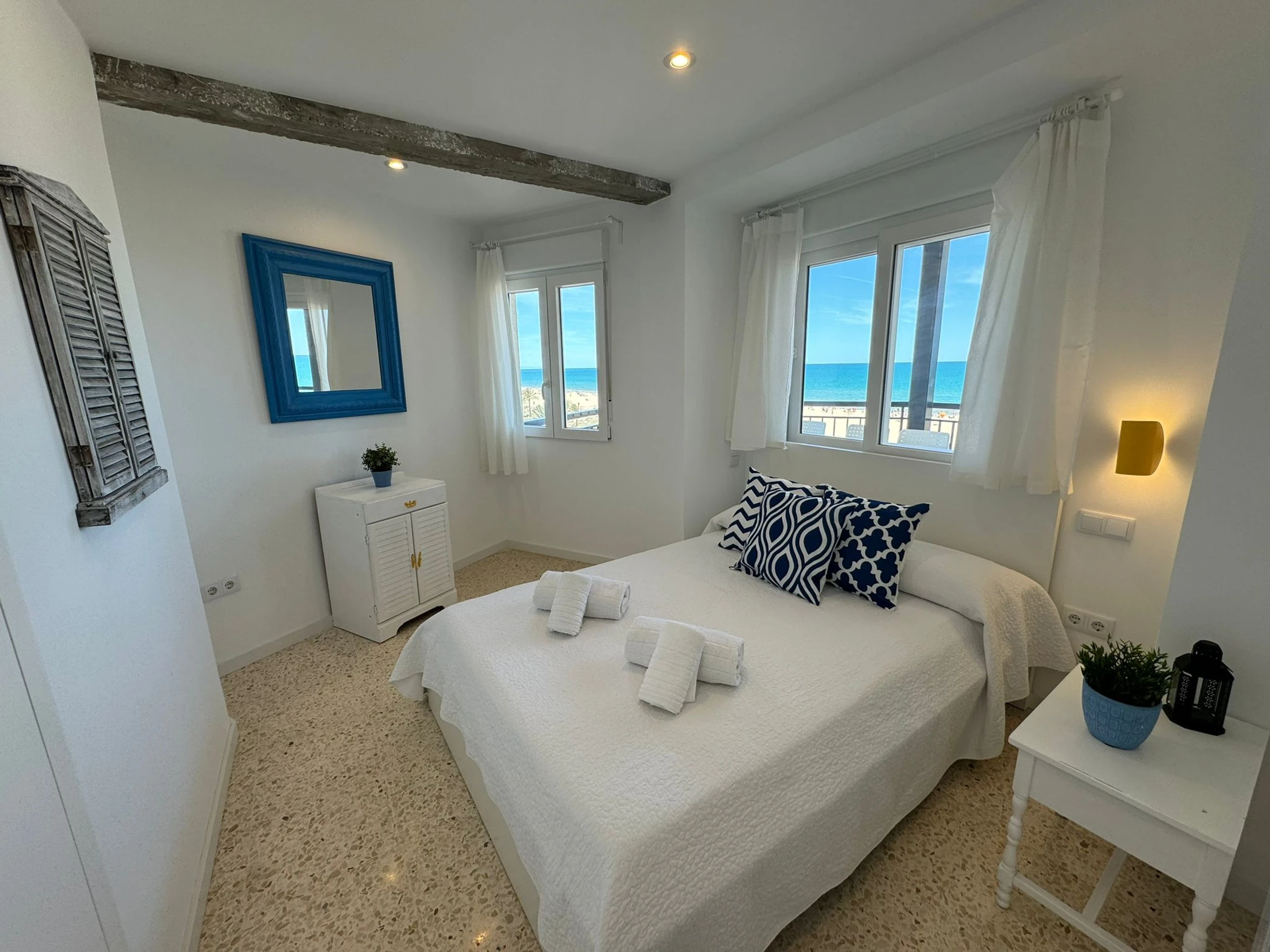 Logement de 100 m² meublé avec goût et totalement équipé, situé en front de plage, avec vue sur la mer et la montagne.