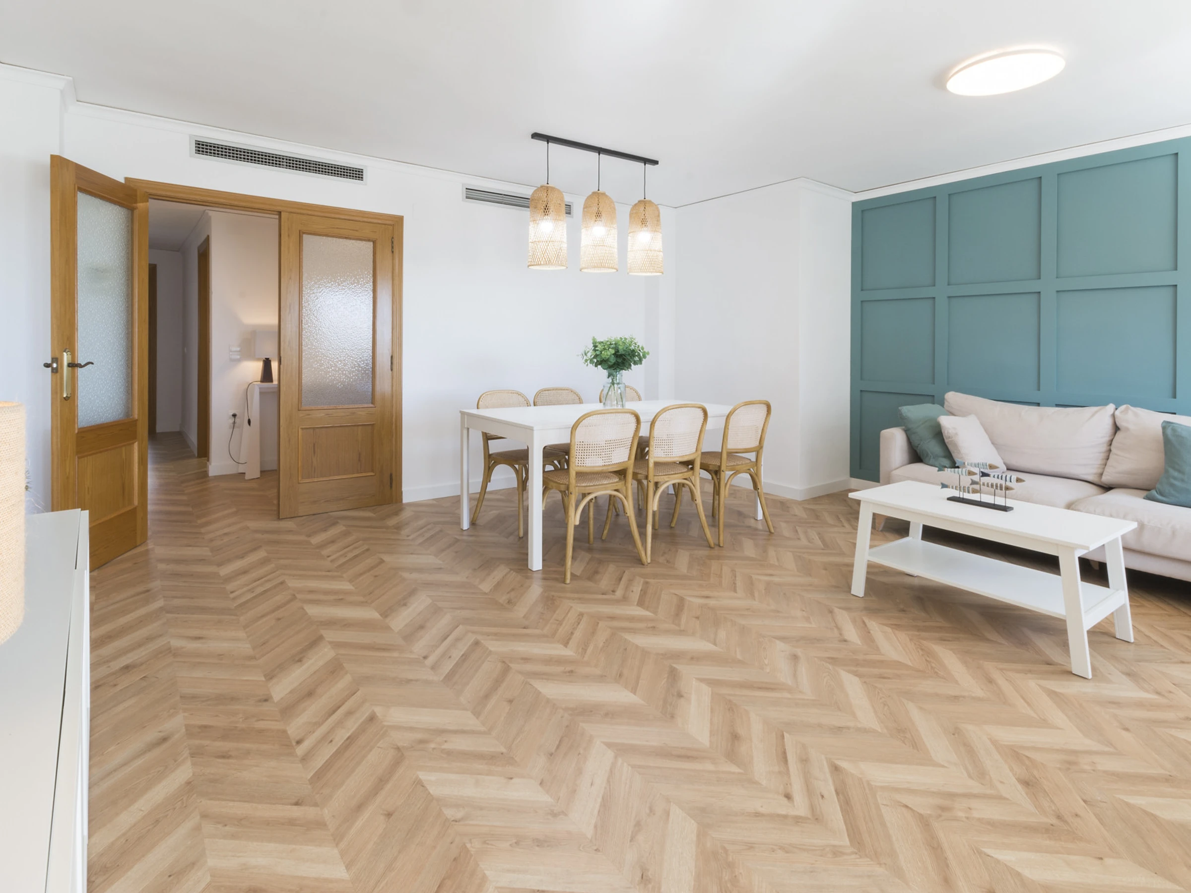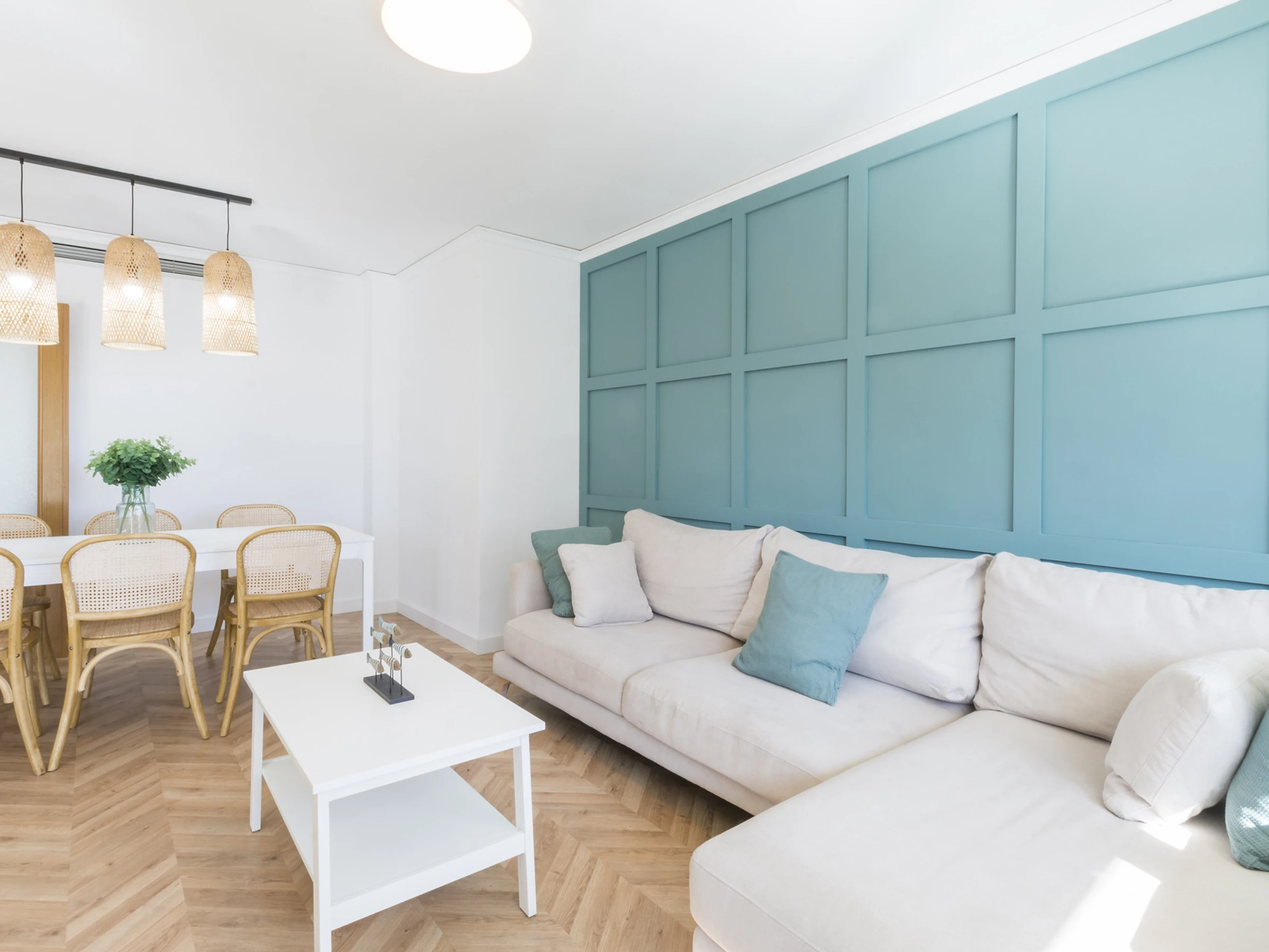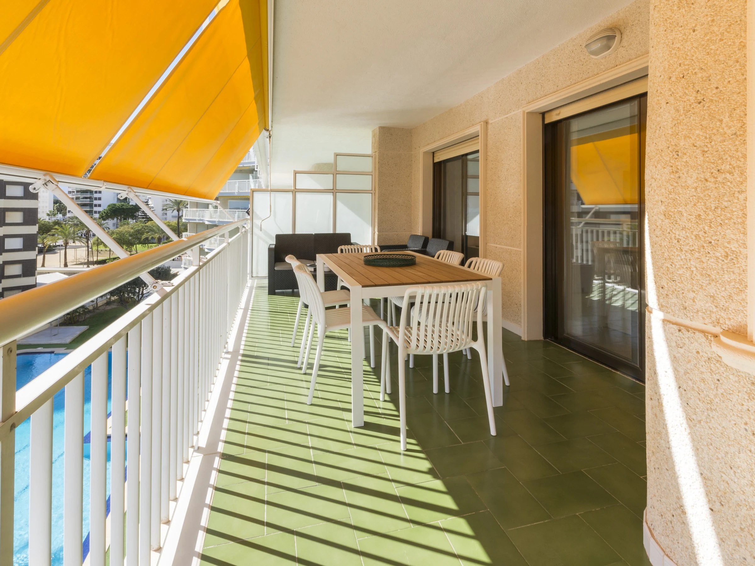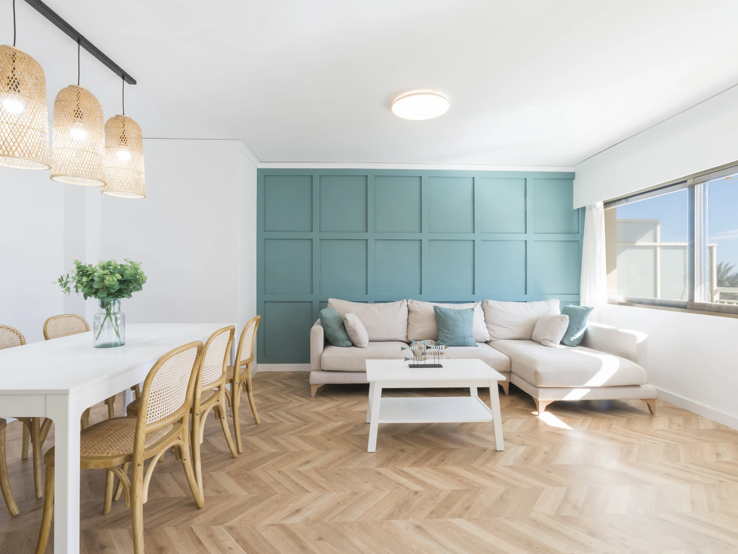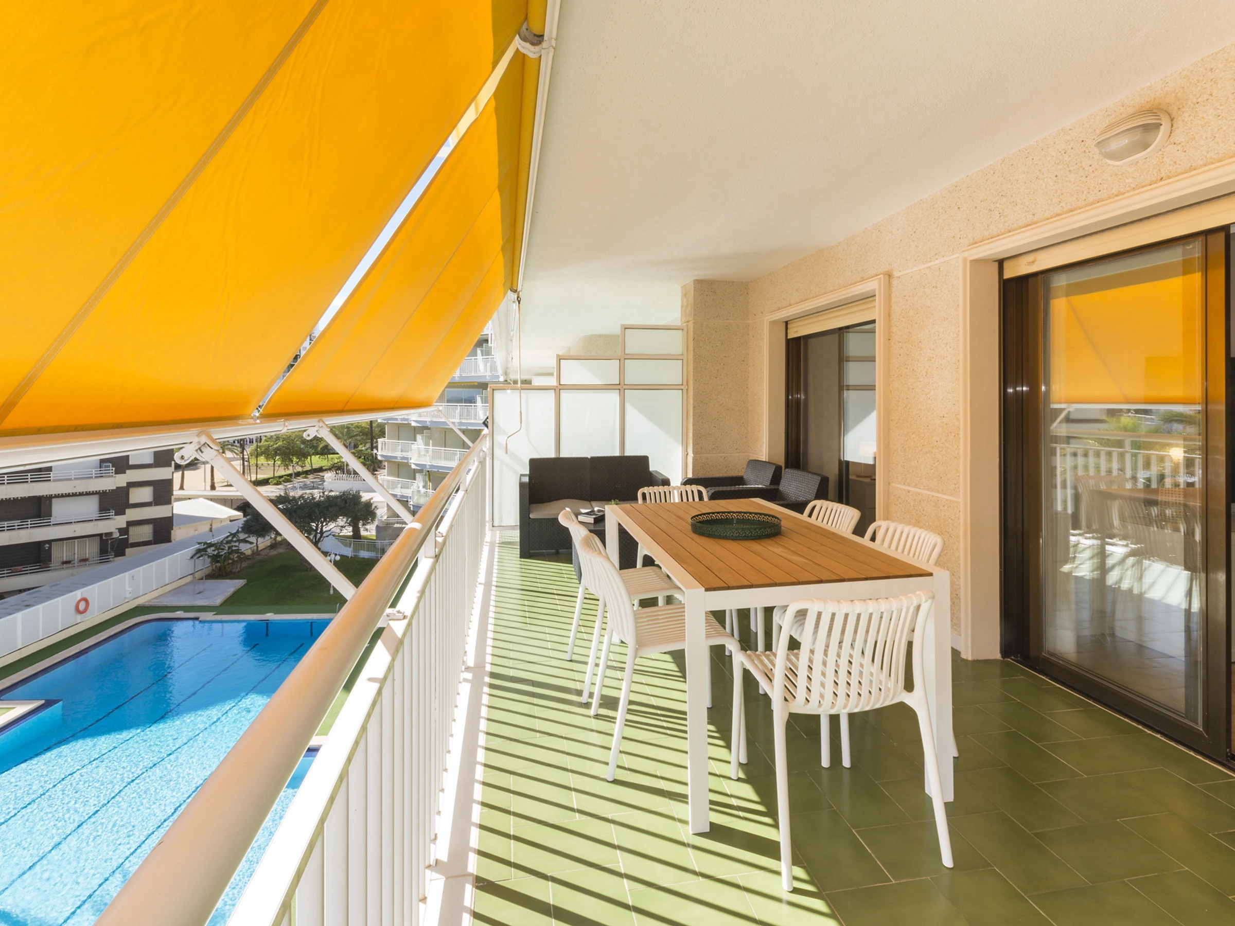 Imaginez ceci : vous entrez et une agréable fraîcheur vous entoure grâce à la climatisation qui vous accueille. Le salon est l'endroit idéal pour se détendre, avec une Smart TV prête pour des séries marathons à côté de la brise marine qui passe par la fenêtre.