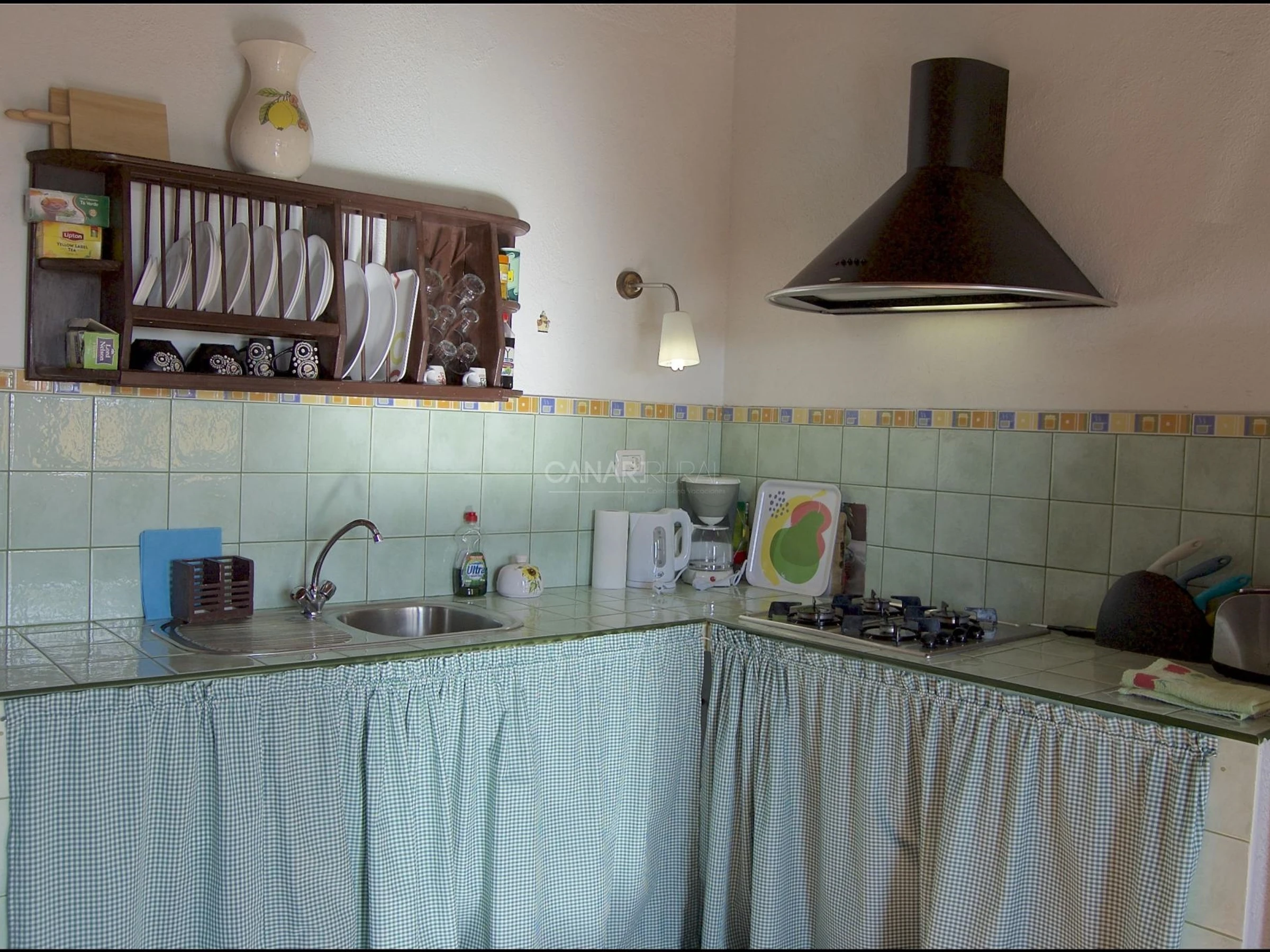 * Cuisine – salon totalement équipée avec cuisine à gaz, micro-ondes, frigo-congélateur, machine à café, théière, grille-pain et machine à laver.