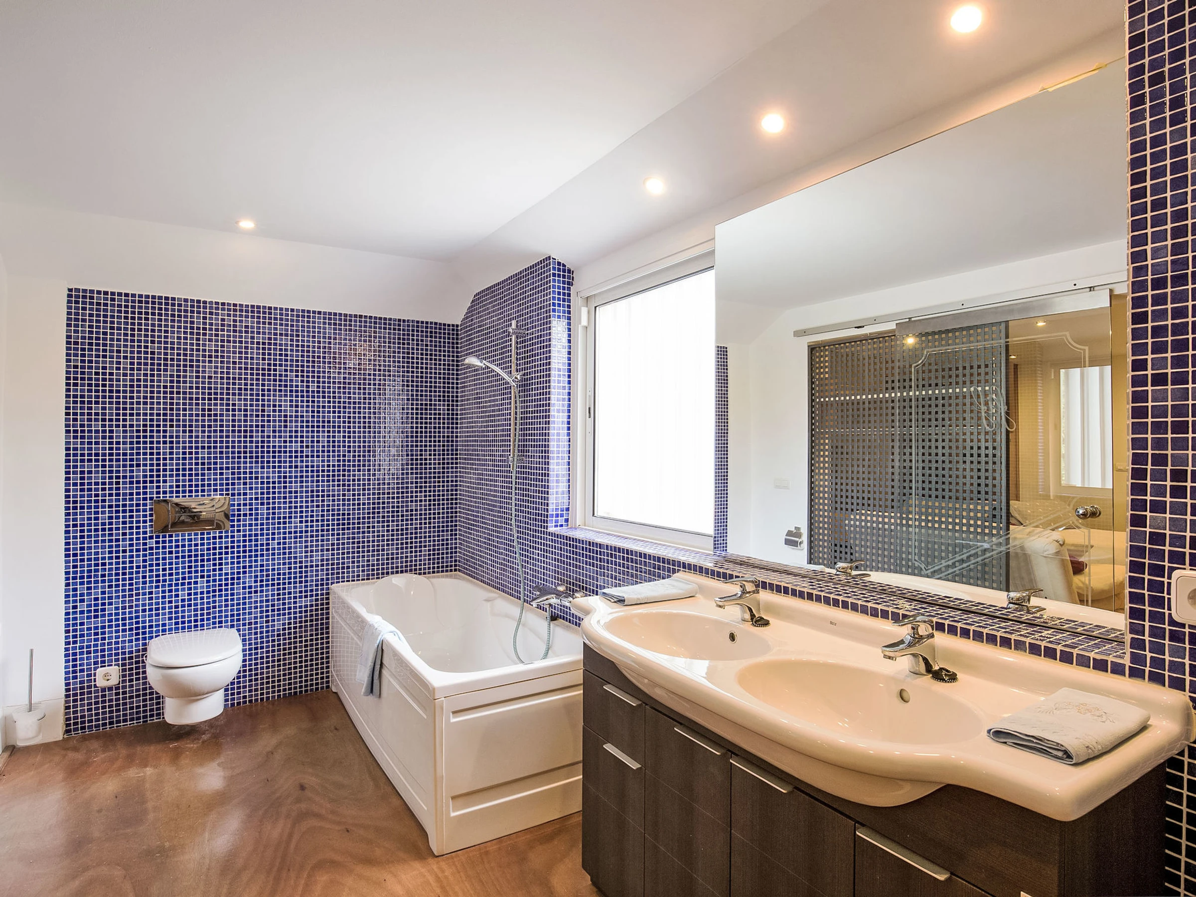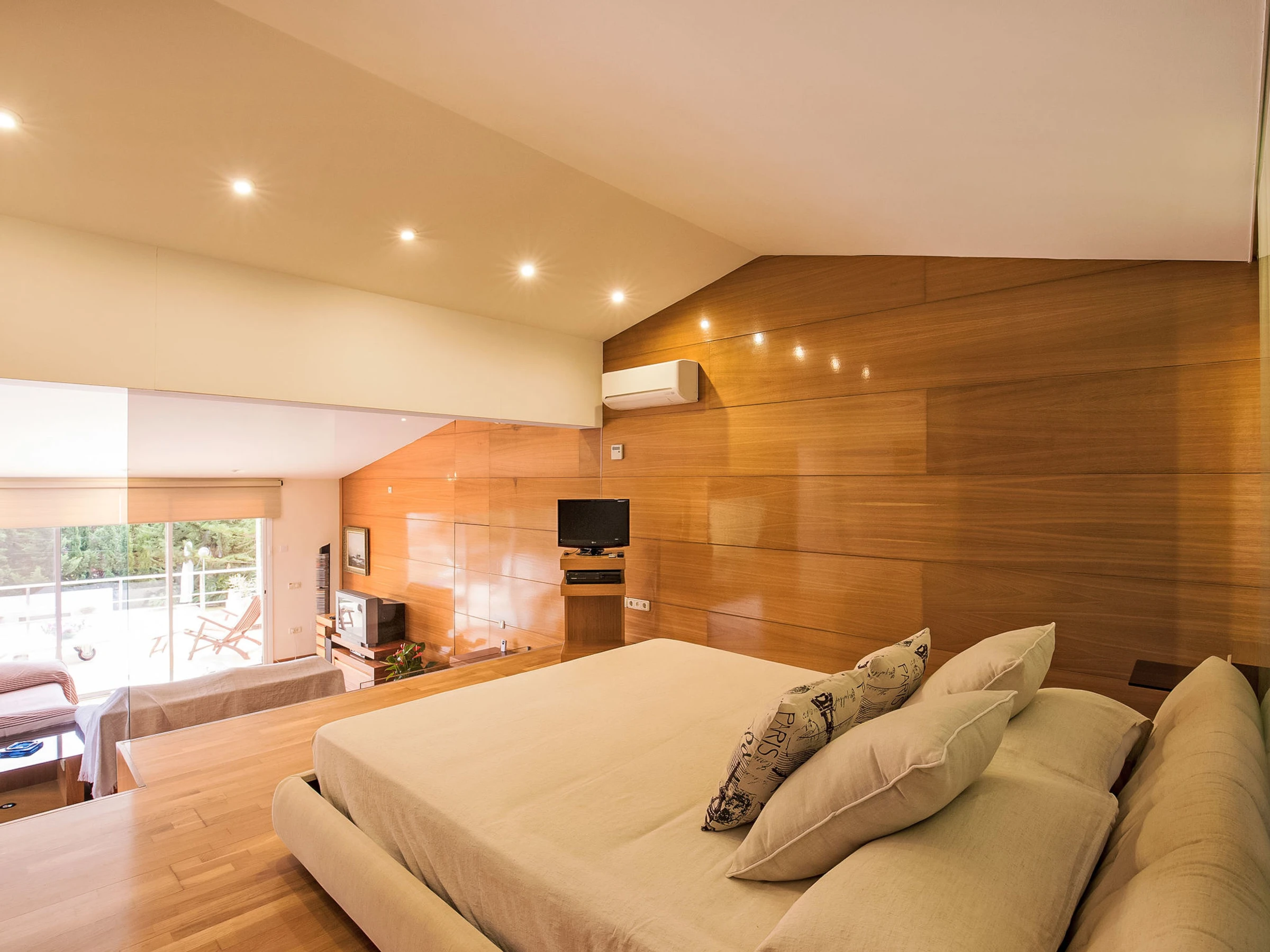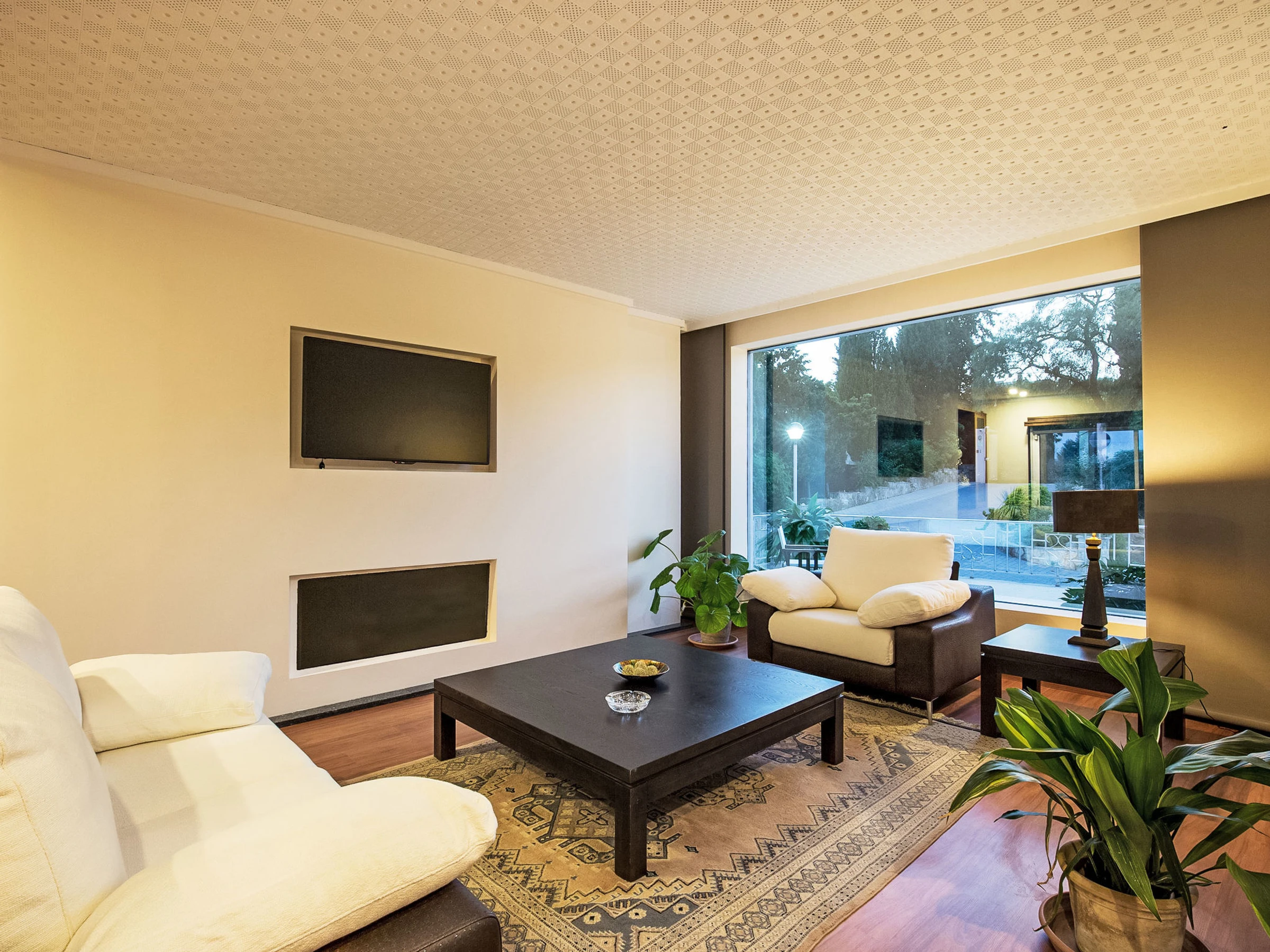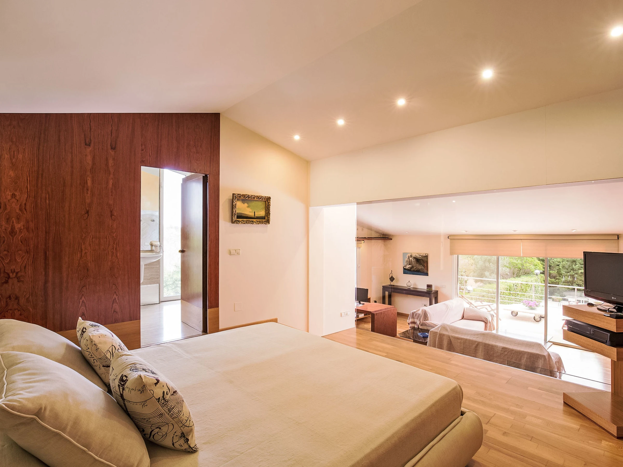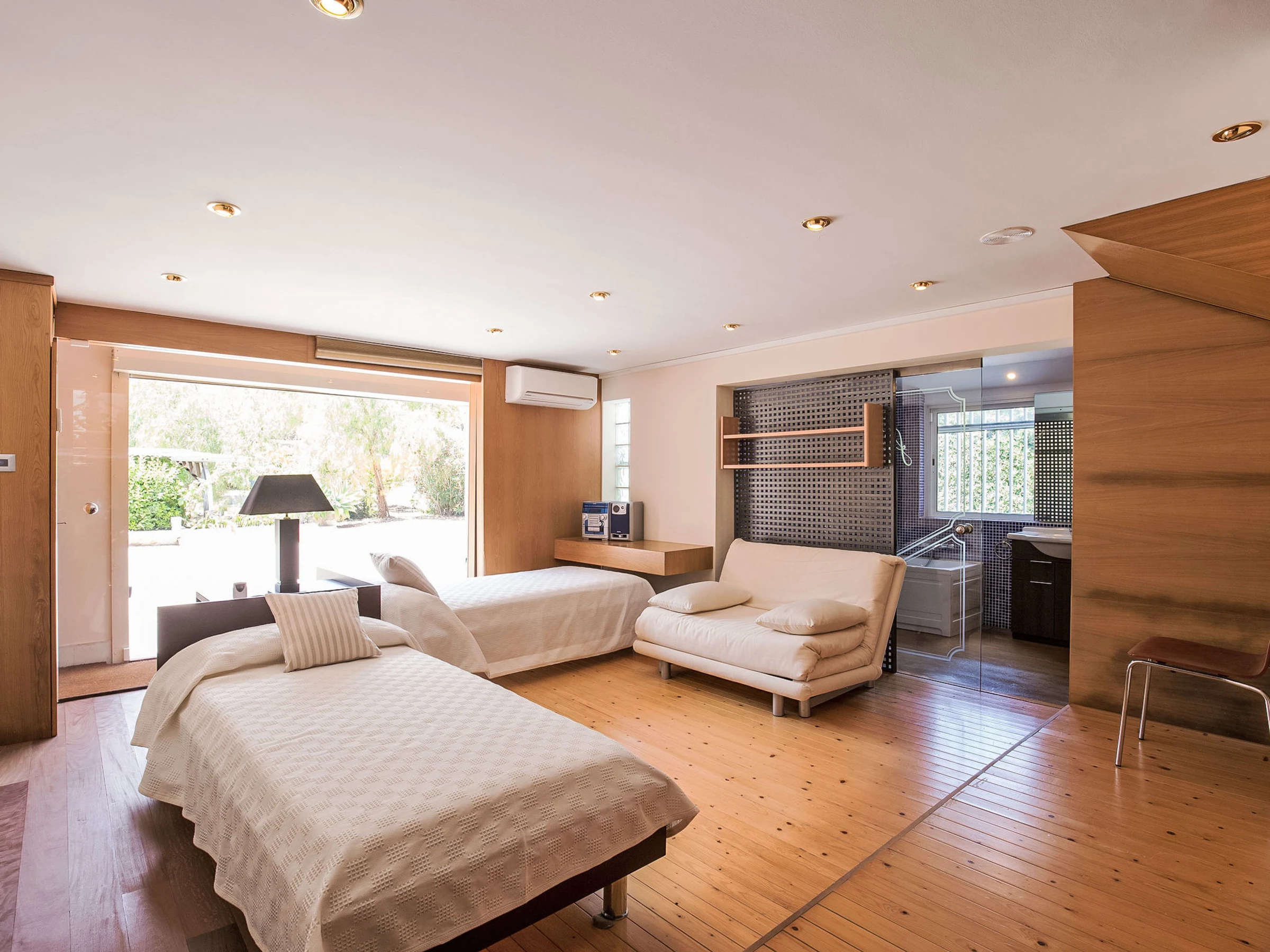 "Can Pedro", villa 9 pièces 600 m2 sur 2 niveaux. Logement idéal pour 10 adultes. Spacieux et clair, complètement rénovée, aménagement très moderne et de style: grand séjour ouvert avec porte coulissante, baie vitrée avec TV (satellite), Télévision numérique, écran plat, air-conditionné et chauffage à air chaud. Sortie sur le jardinet. 1 grande chambre double avec porte coulissante, baie vitrée Dressing avec 1 grand-lit (180 cm), douche/bidet/WC, air-conditionné et chauffage à air chaud. Sortie sur le jardinet. 1 grande chambre double avec baie vitrée avec 2 lits (90 cm), bain/bidet/WC, double vasque, air-conditionné et chauffage à air chaud. Sortie sur le jardinet. 1 grande chambre double avec baie vitrée avec 2 lits (90 cm), air-conditionné et chauffage à air chaud. 1 grande chambre double avec baie vitrée avec 1 grand-lit (150 cm), douche/WC, air-conditionné et chauffage à air chaud. 1 grande chambre double avec baie vitrée avec 2 lits (90 cm), air-conditionné et chauffage à air chaud. Grand bureau ouvert avec baie vitrée avec air-conditionné et chauffage à air chaud. Sortie sur le jardinet. Douche/WC. À l'étage inférieur: (échelle) grande salle à manger ouverte avec porte coulissante, baie vitrée avec air-conditionné et chauffage à air chaud. Sortie sur le jardinet, sur la piscine. 1 chambre double avec porte coulissante, baie vitrée avec 2 lits (90 cm), douche/WC, air-conditionné et chauffage à air chaud. Sortie sur le jardinet, sur la piscine. Cuisine/séjour (four, lave-vaisselle, 4 plaques à induction, grille-pain, bouilloire électrique, micro-ondes, congélateur, cafetière électrique, ilot de cuisine) avec table pour les repas. WC séparé. Grand jardinet, pelouse. Meubles de terrasse, mobilier de balcon, barbecue, chaises longues. Très belle vue sur les montagnes et les alentours. A disposition: lave-linge, fer à repasser, chaise haute pour enfant, lit bébé, sèche-cheveux. Internet (Connexion WIFI, gratuit). Place de parking (couvert). [hidden] // Reg. Nr.: ESFCTU[hidden][hidden][hidden]00[hidden]7