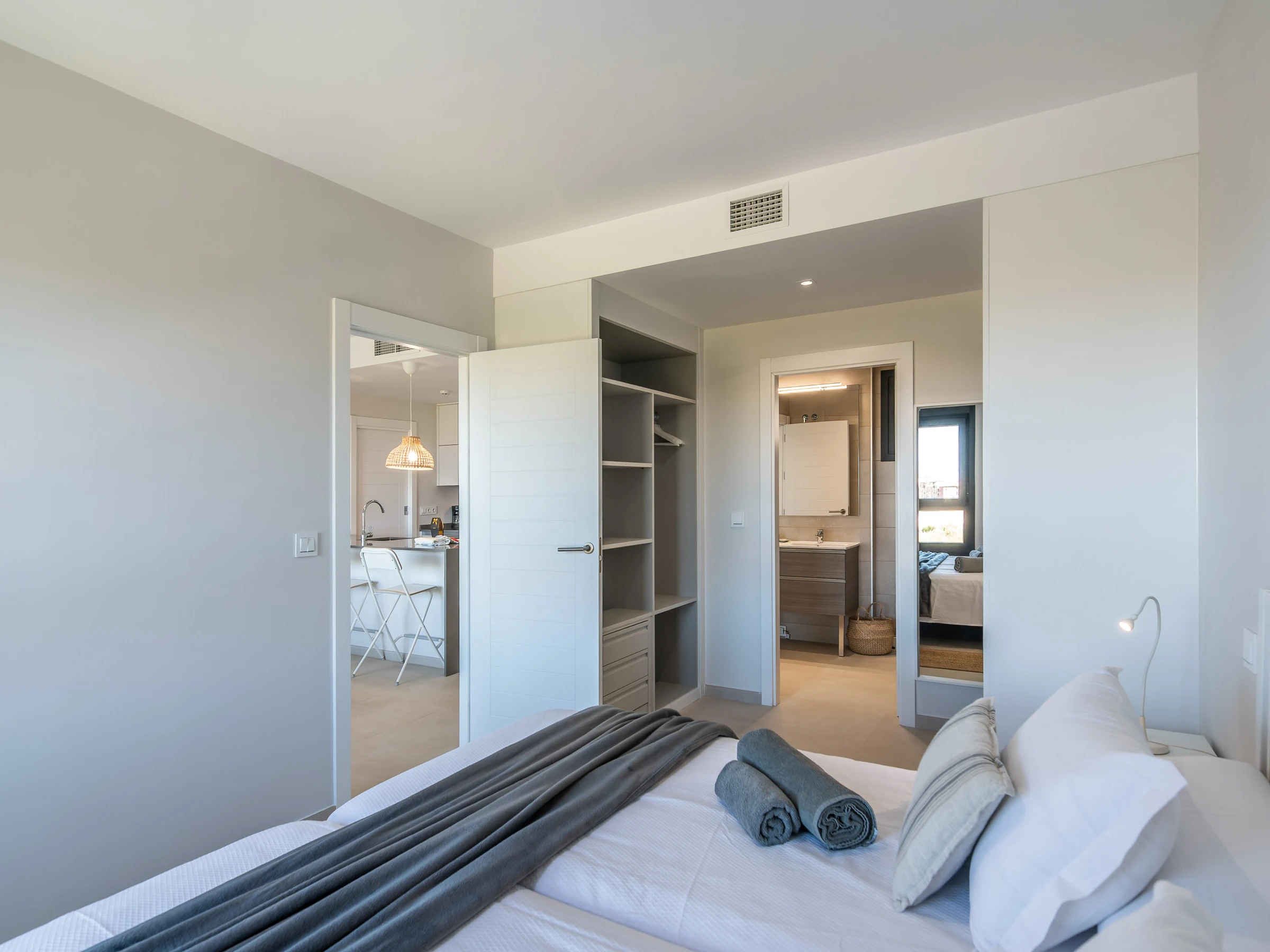 La cuisine américaine, à vitrocéramique, est équipée avec réfrigérateur, micro-ondes, four, congélateur, lave-vaisselle, vaisselle/couverts, ustensiles/cuisine, cafetière, grille pain et presse-agrumes.