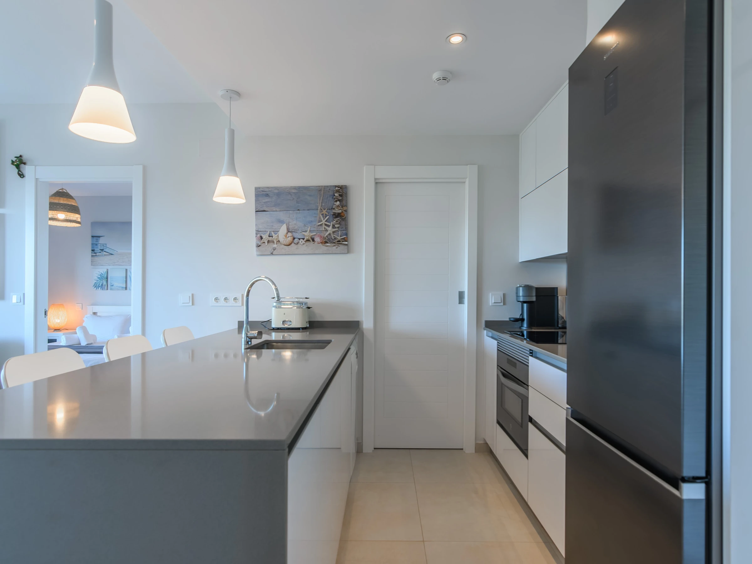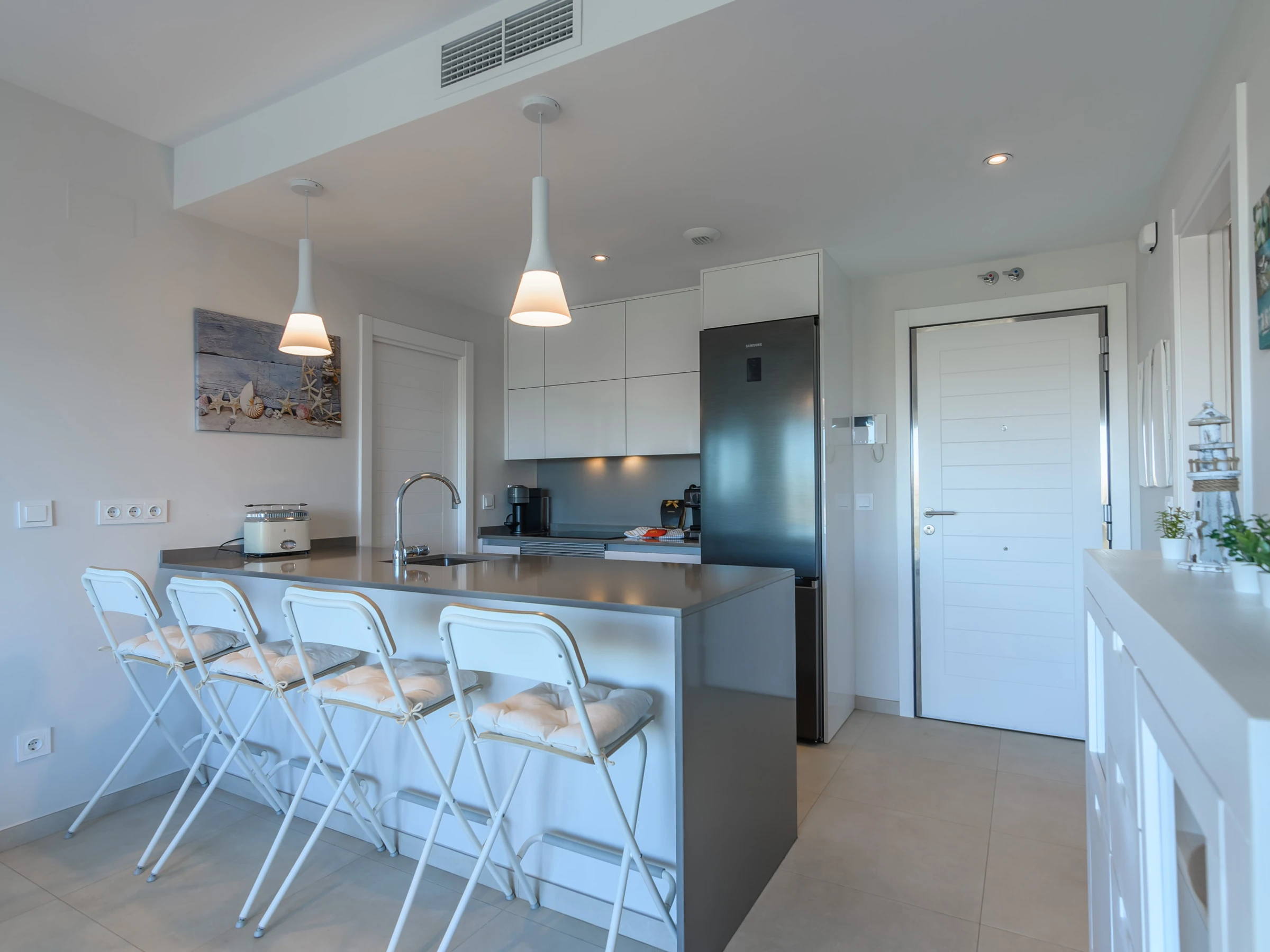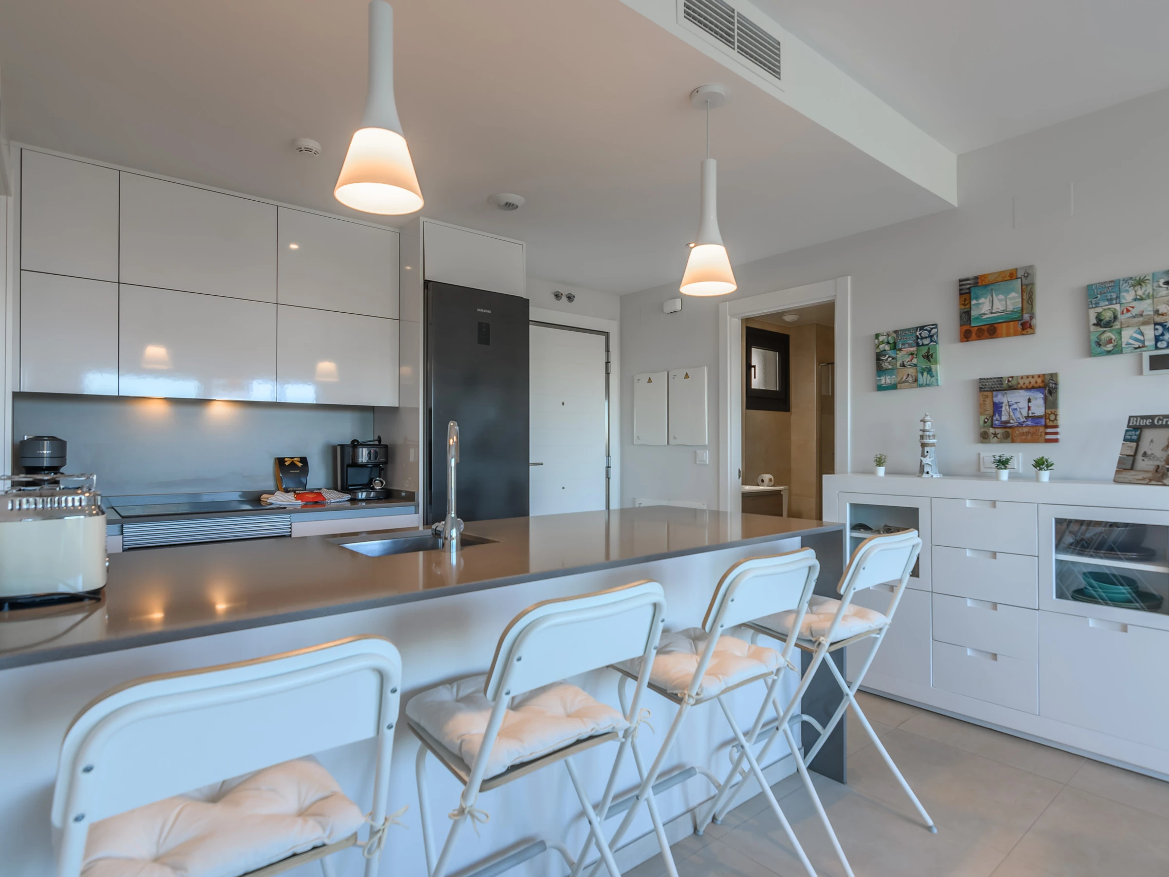 La cuisine américaine, est équipée avec réfrigérateur, micro-ondes, four, congélateur, lave-vaisselle, vaisselle/couverts, ustensiles/cuisine, cafetière, grille pain, bouilloire et presse-agrumes.