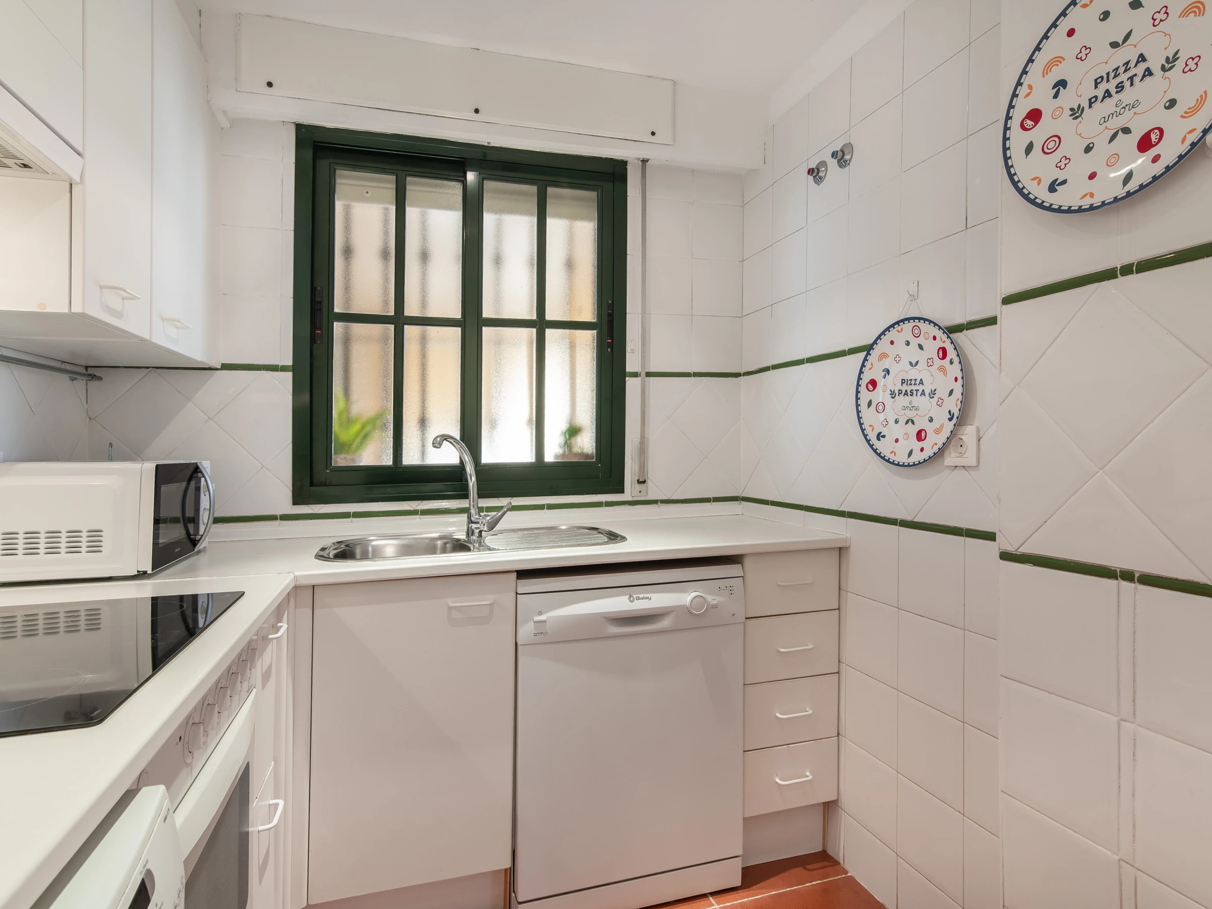 La cuisine indépendante, à vitrocéramique, est équipée avec réfrigérateur, micro-ondes, four, congélateur, lave-vaisselle, vaisselle/couverts, ustensiles/cuisine, cafetière, grille pain et presse-agrumes.