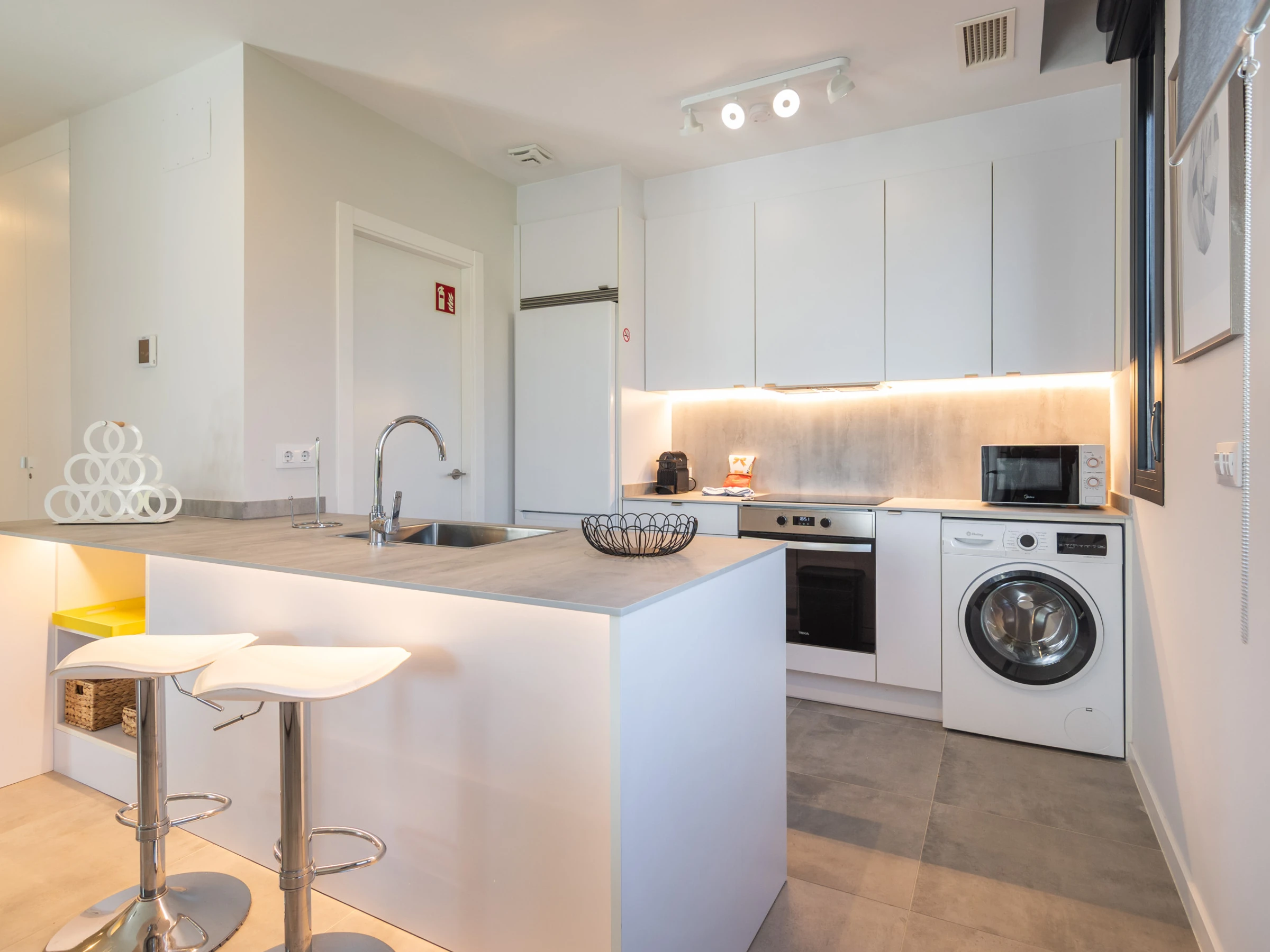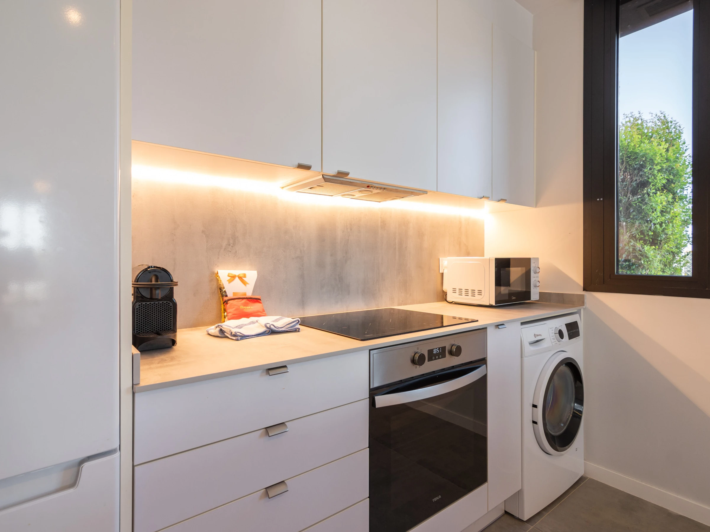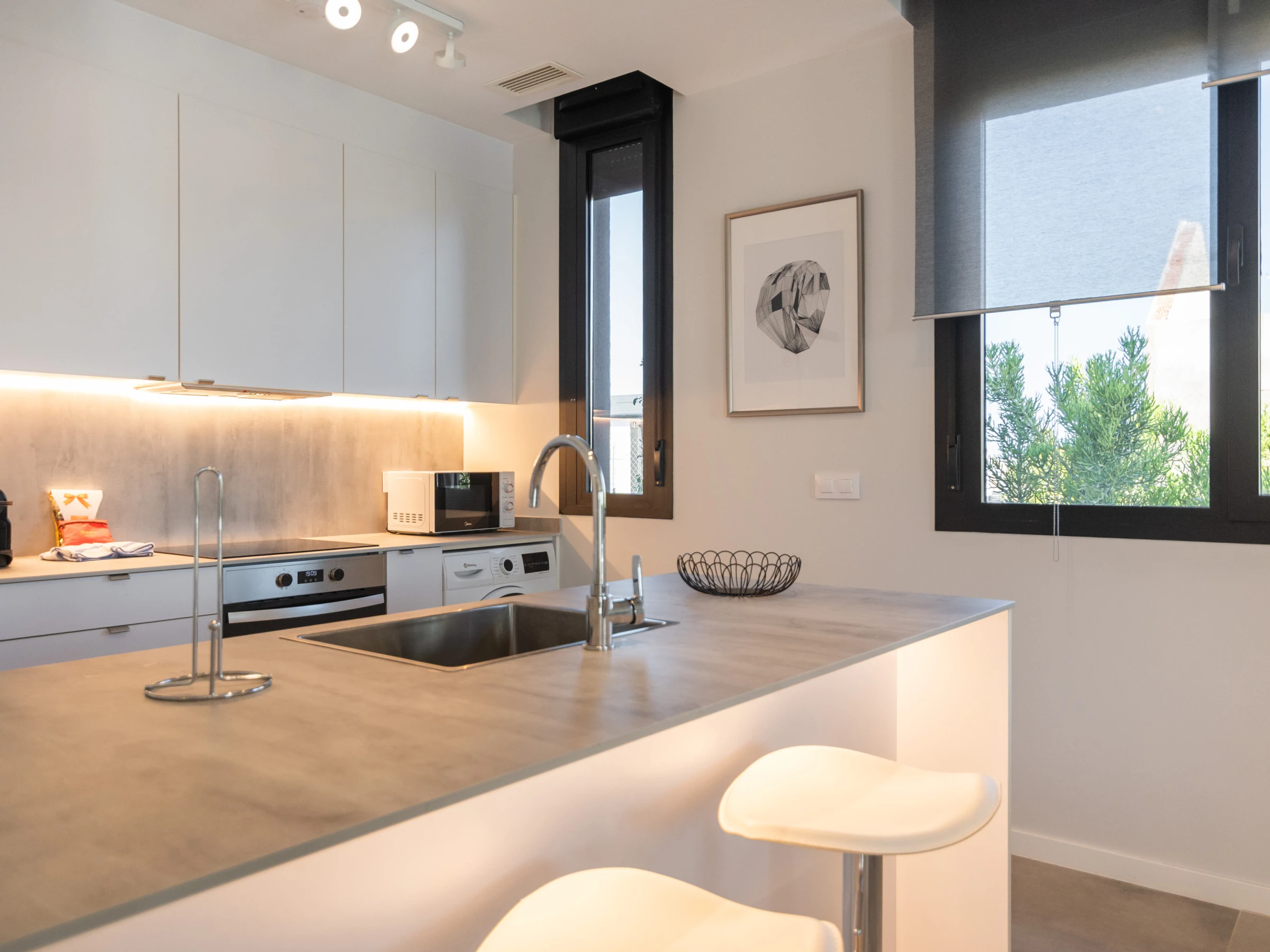 La cuisine américaine, à vitrocéramique, est équipée avec réfrigérateur, micro-ondes, four, congélateur, lave-vaisselle, vaisselle/couverts, ustensiles/cuisine, cafetière, grille pain, bouilloire et presse-agrumes.