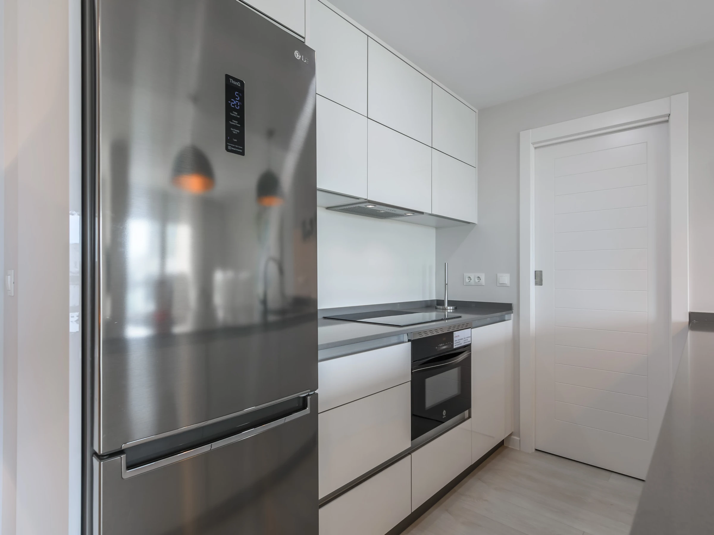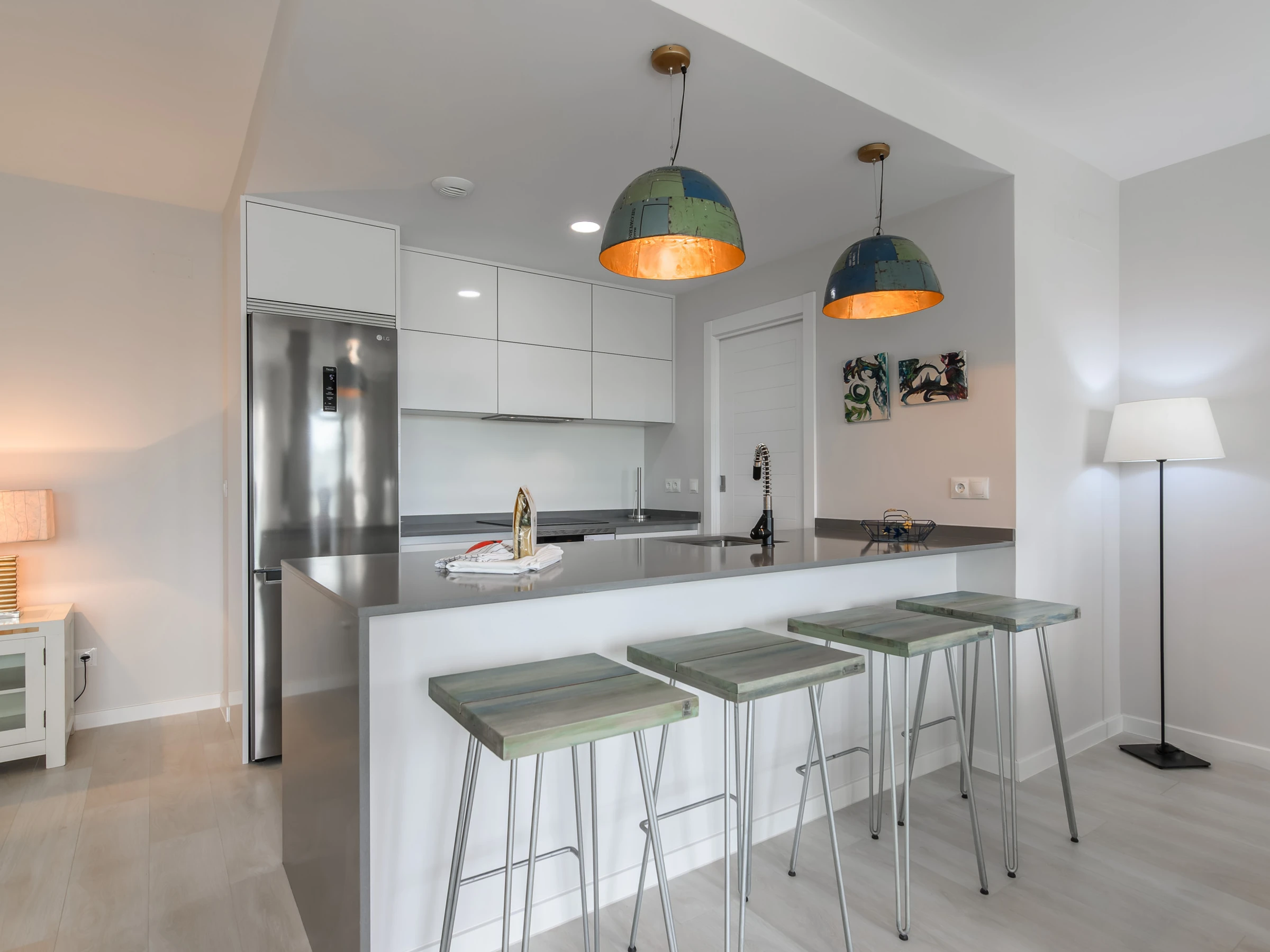 La cuisine américaine, à vitrocéramique, est équipée avec réfrigérateur, micro-ondes, four, congélateur, lave-vaisselle, vaisselle/couverts, ustensiles/cuisine, cafetière, grille pain, bouilloire et presse-agrumes.