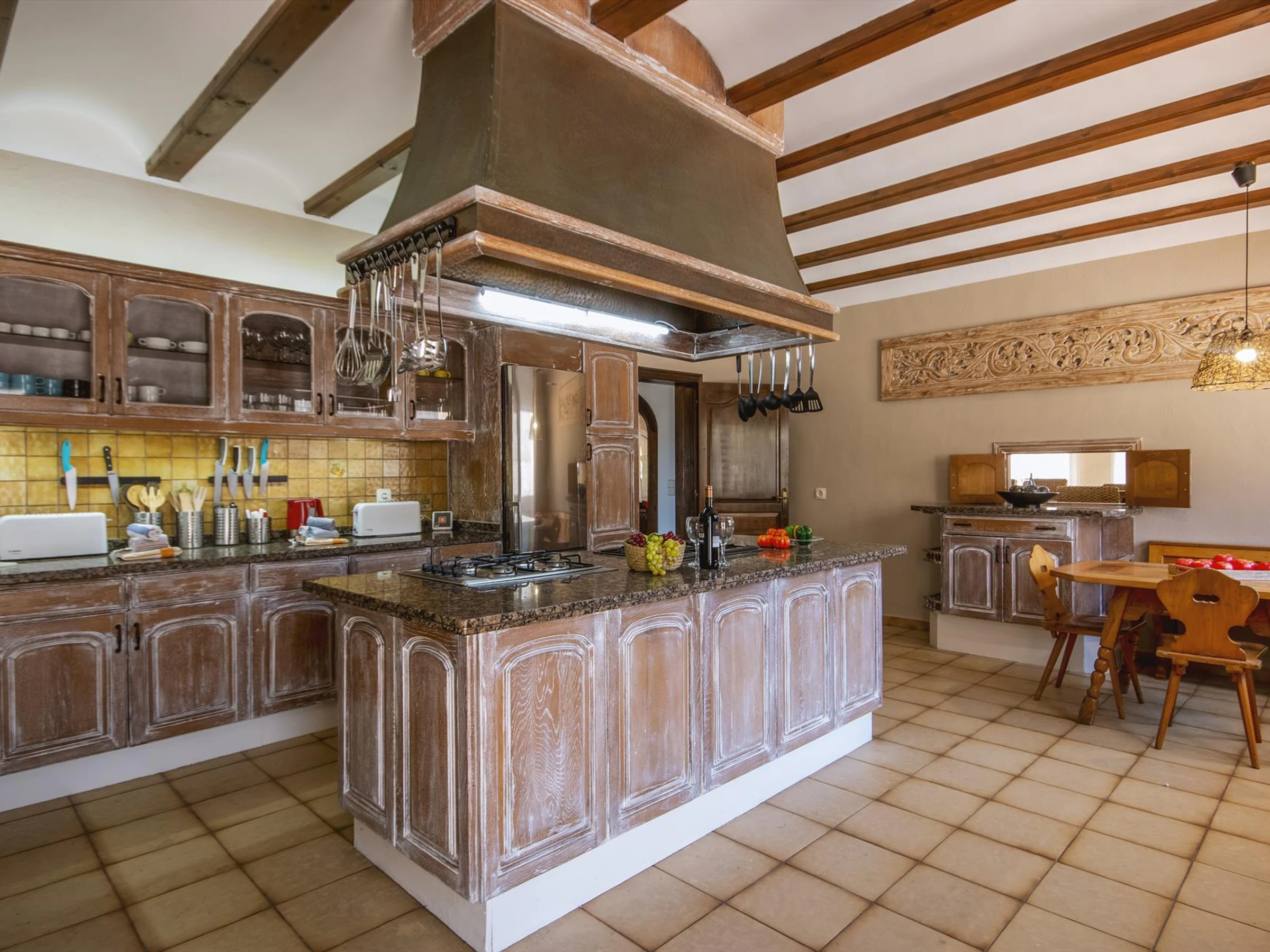 La cuisine, est équipée avec micro-ondes, four, congélateur, lave-vaisselle, cafetière et grille pain.