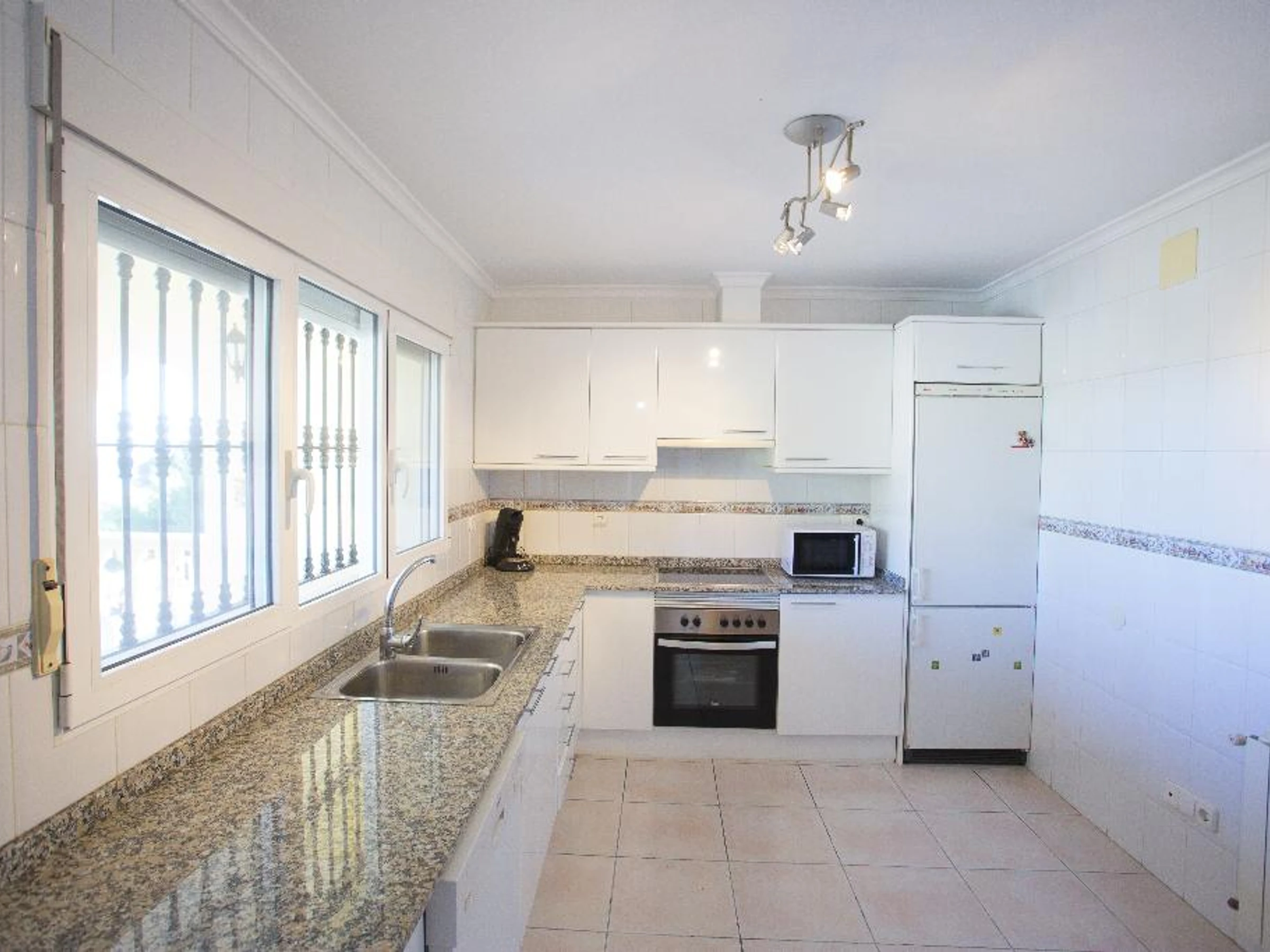 La cuisine, est équipée avec micro-ondes, four, congélateur, lave-vaisselle, cafetière et grille pain.