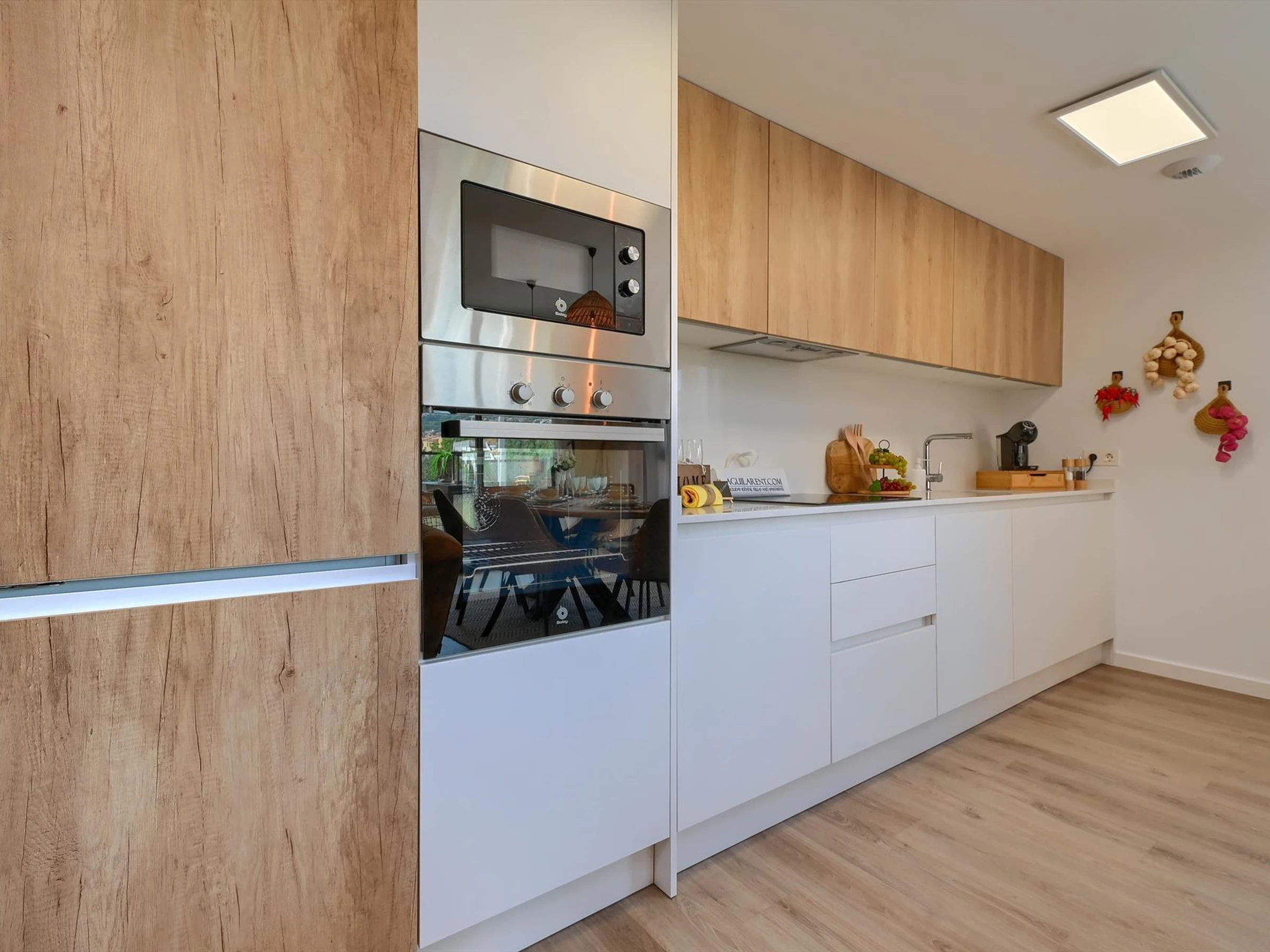 La cuisine, est équipée avec micro-ondes, four, congélateur, lave-vaisselle, cafetière et grille pain.