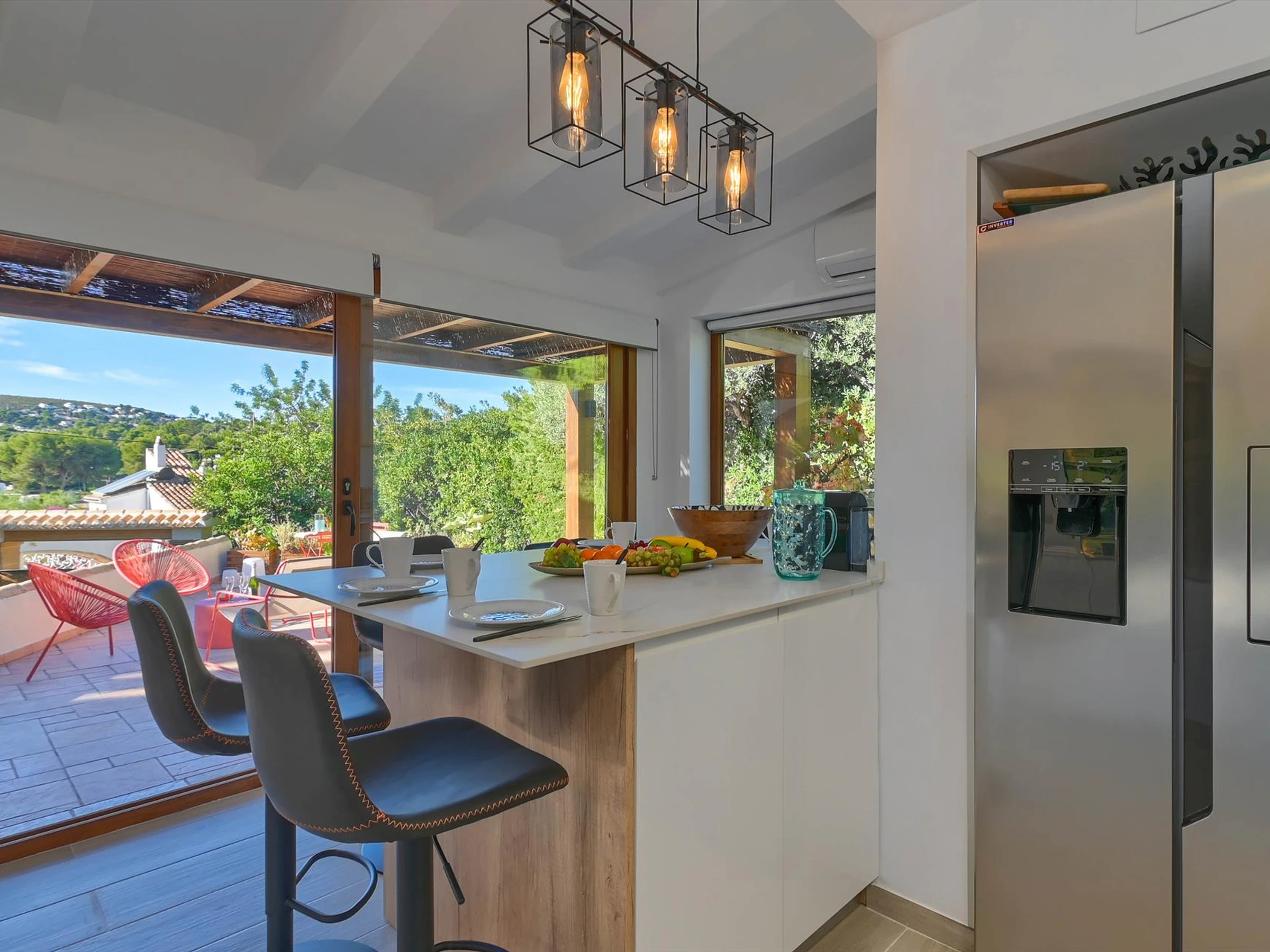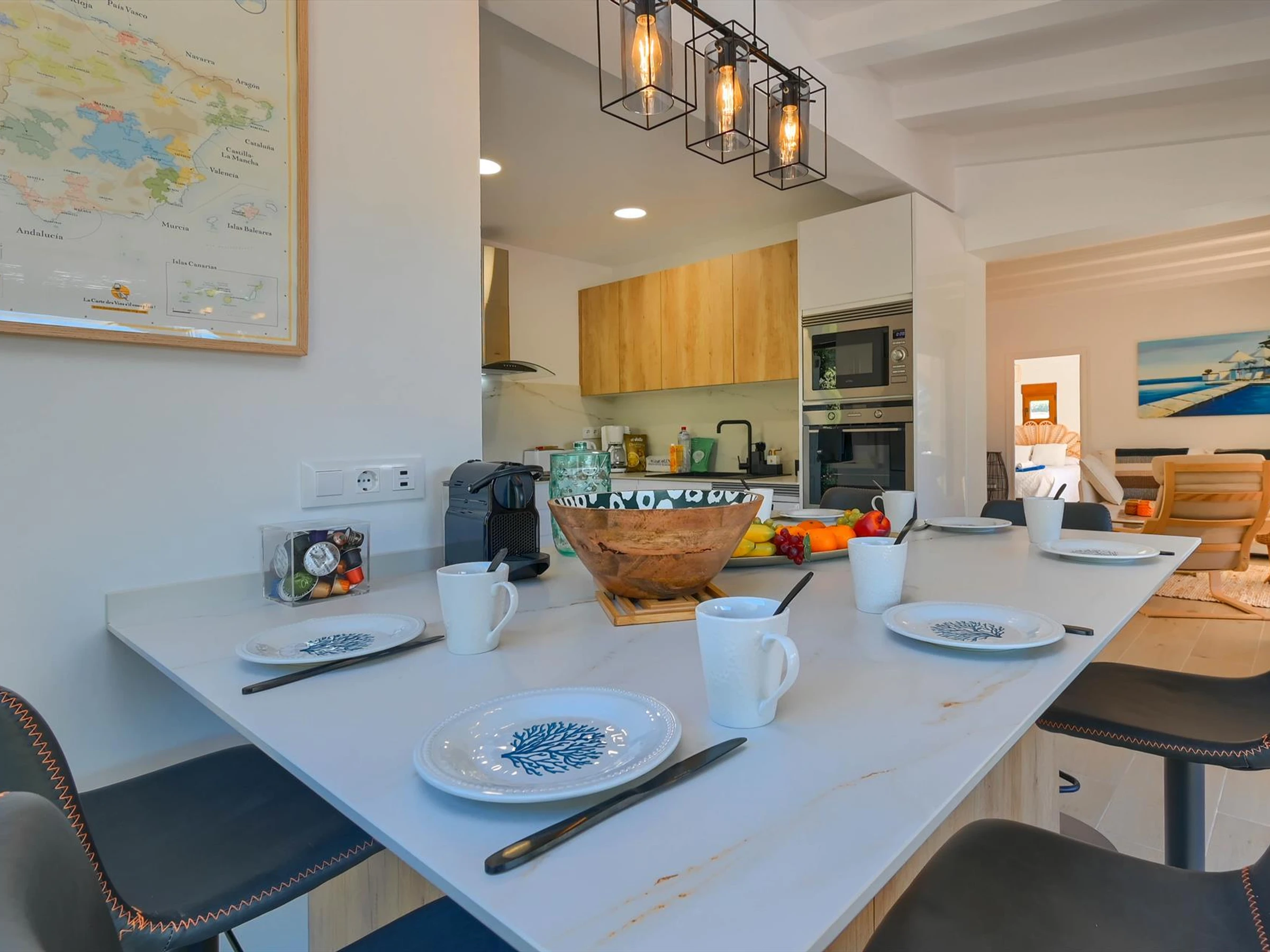 La cuisine, est équipée avec micro-ondes, four, congélateur, lave-vaisselle, cafetière et grille pain.
