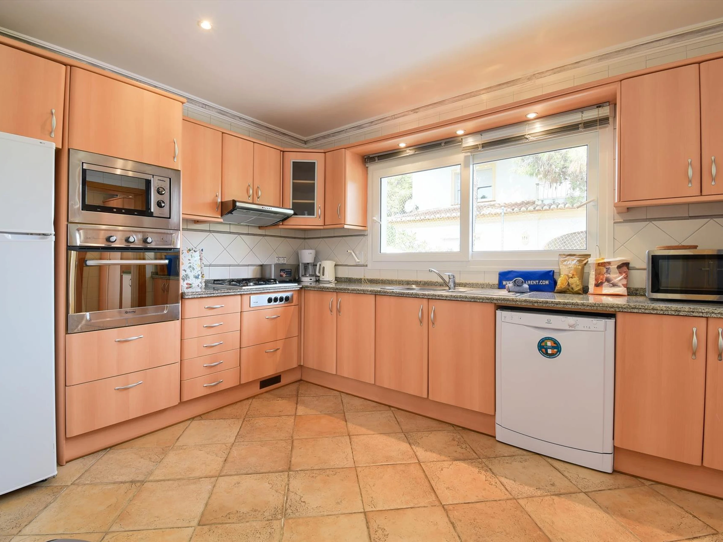 La cuisine, est équipée avec micro-ondes, four, congélateur, lave-vaisselle, cafetière et grille pain.