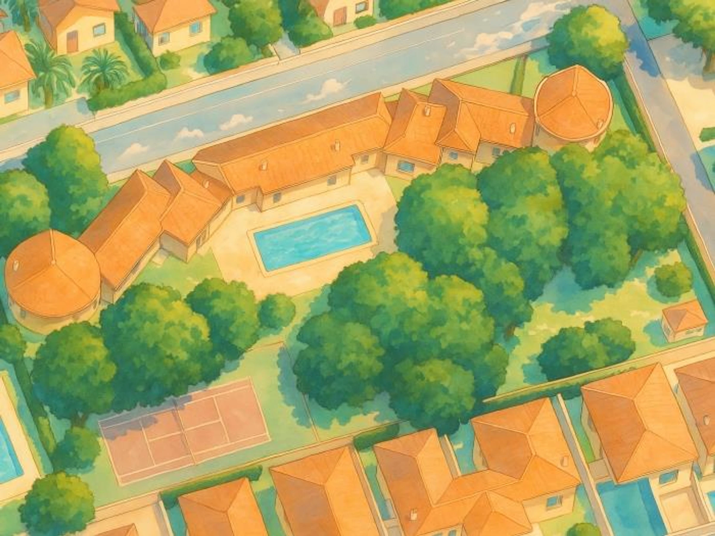 Maison confortable avec un grand espace verdoyant à côté de la piscine communautaire et du court de tennis.