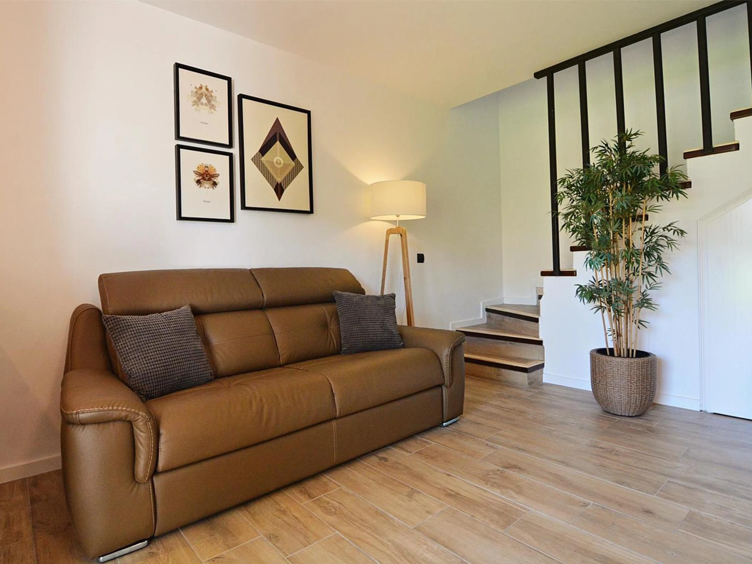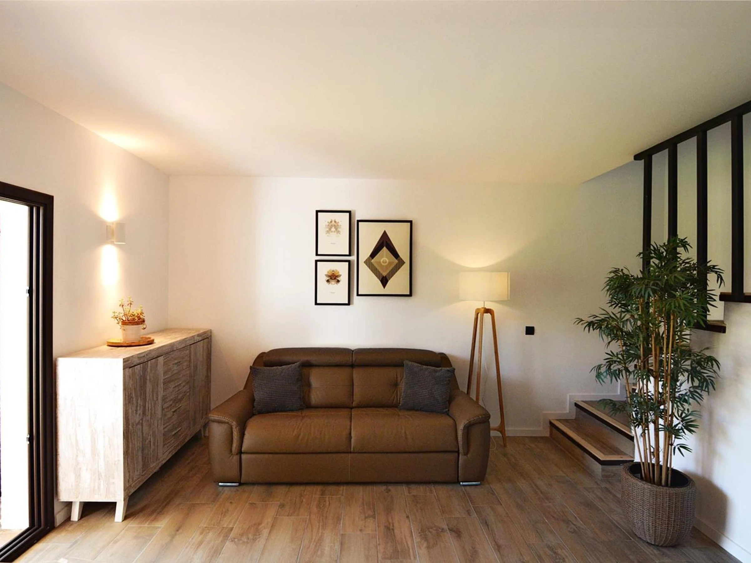 La maison est répartie sur deux étages. Au rez-de-chaussée se trouve la salle à manger avec cuisine ouverte et accès direct au jardin où vous pourrez prendre vos repas pendant que les enfants profitent de la piscine.
