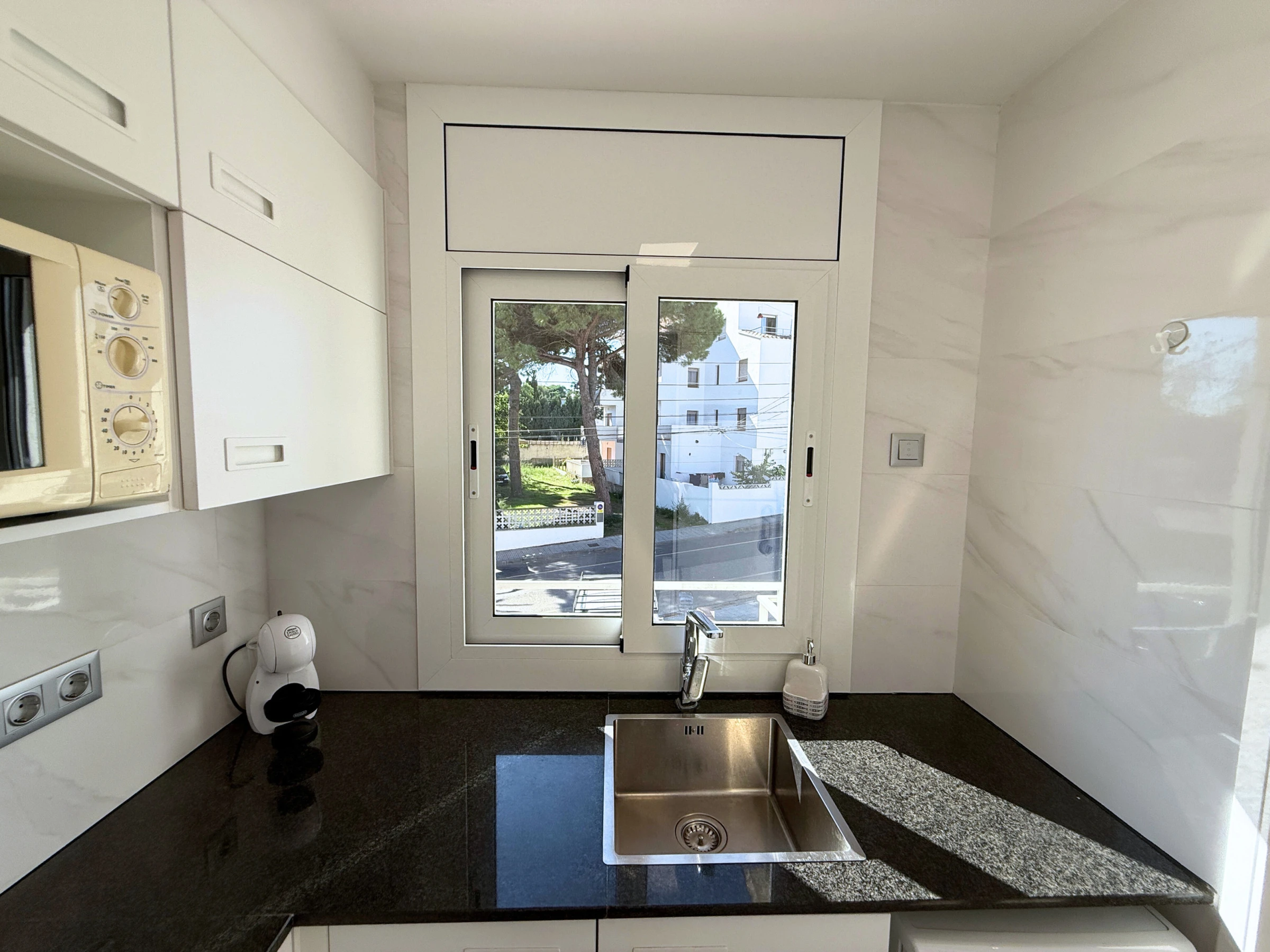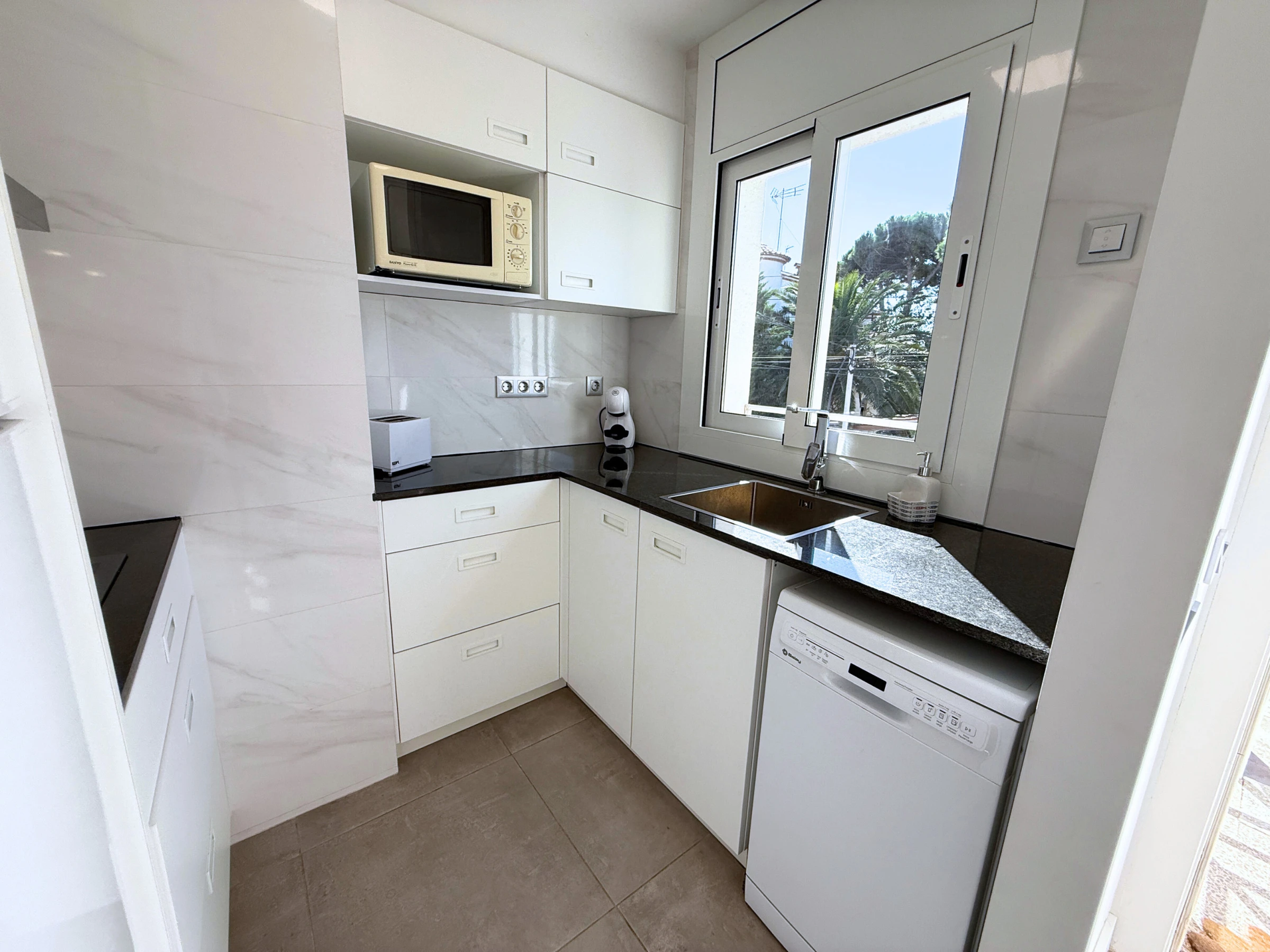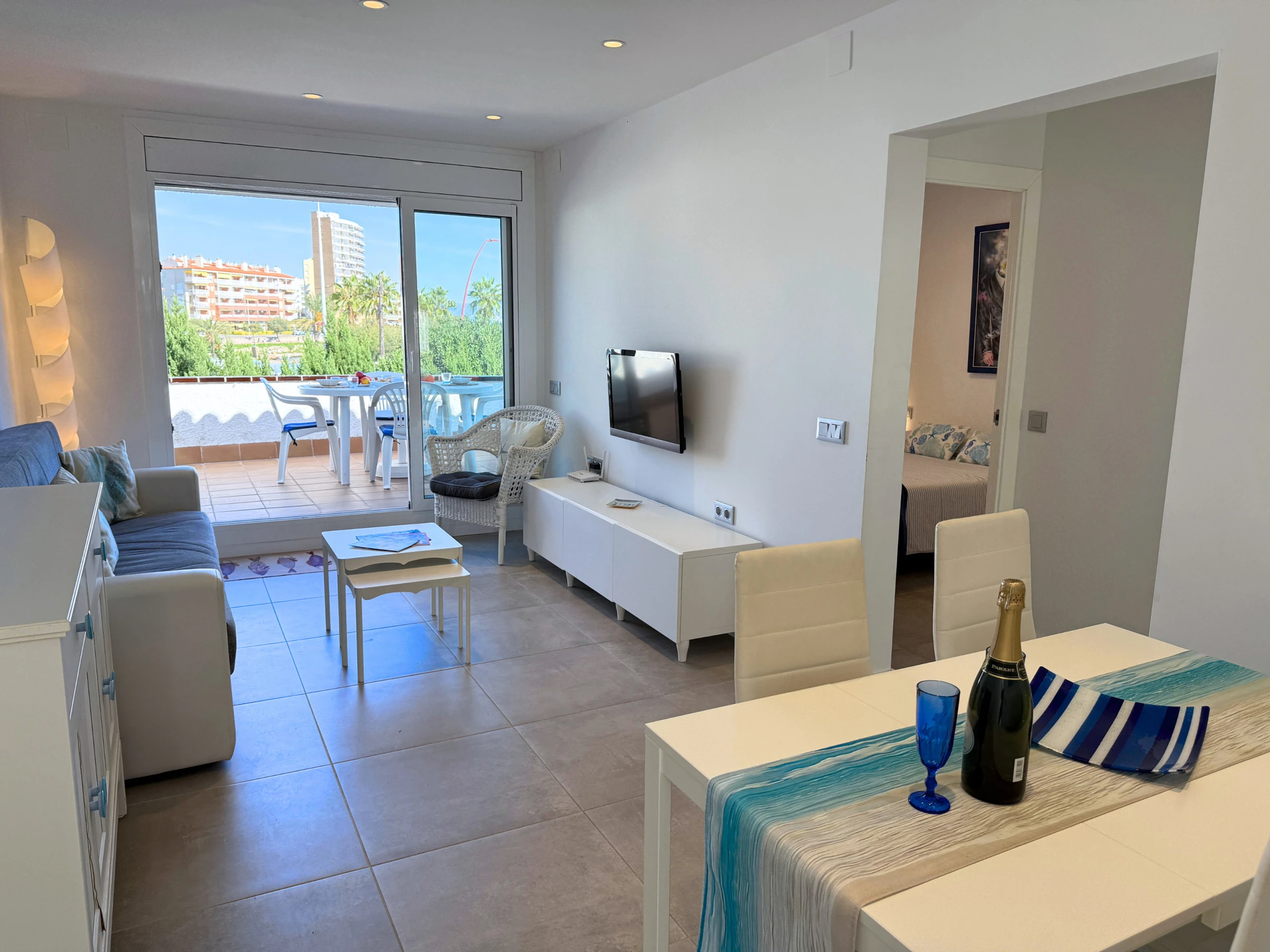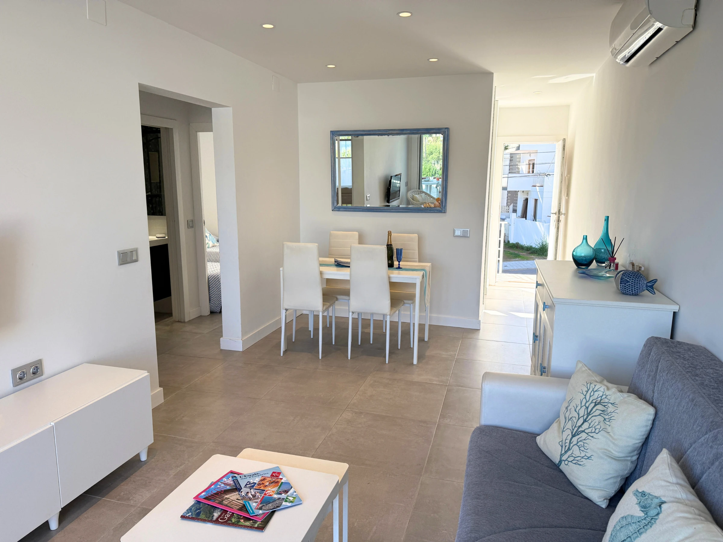 Le salon-salle à manger lumineux est relié à une cuisine indépendante entièrement équipée, idéale pour préparer facilement petits-déjeuners et dîners en famille. De là, vous accédez à la terrasse aménagée, l’endroit parfait pour se détendre, profiter de la brise marine et contempler de magnifiques couchers de soleil sur la Méditerranée.
