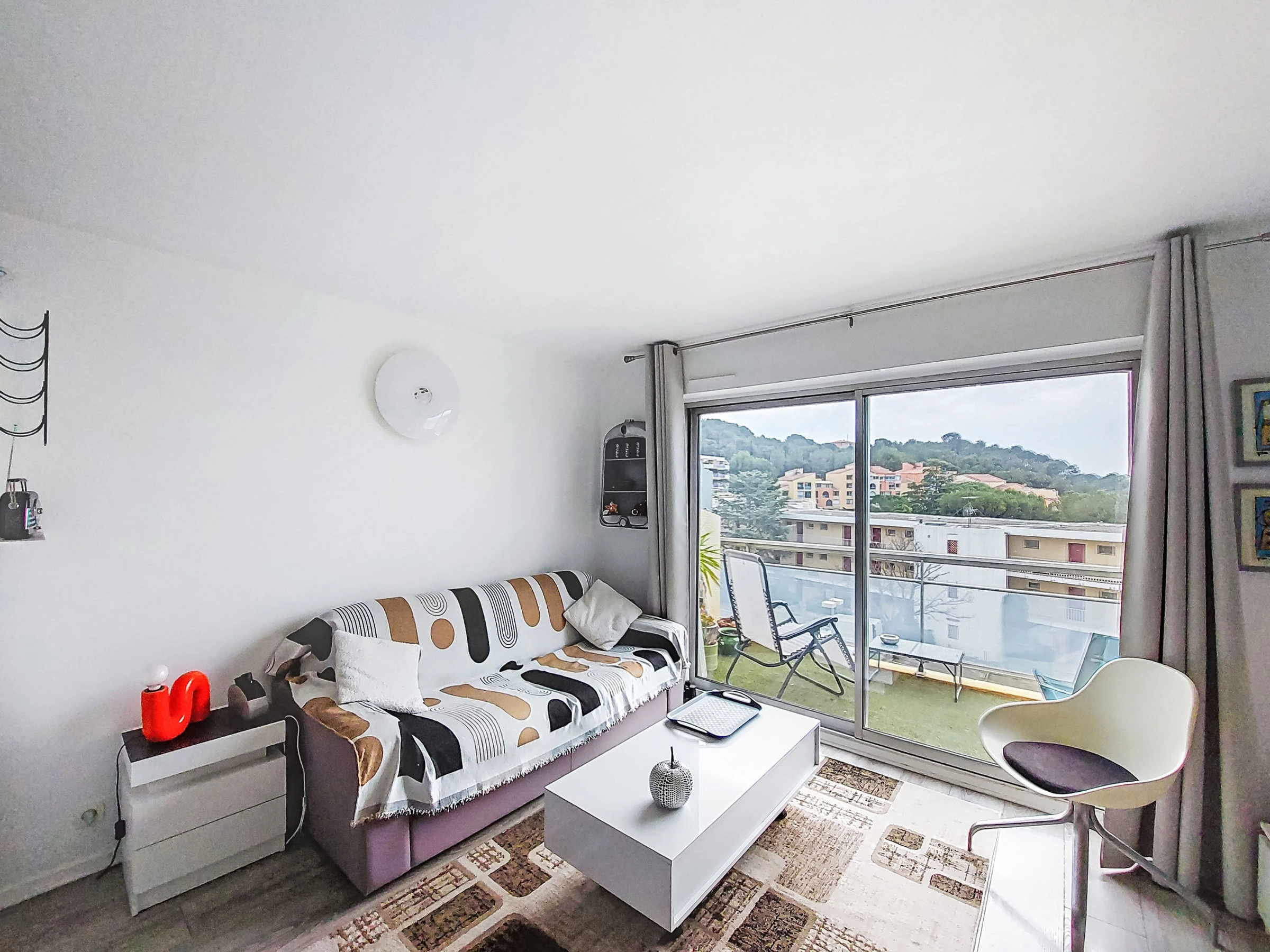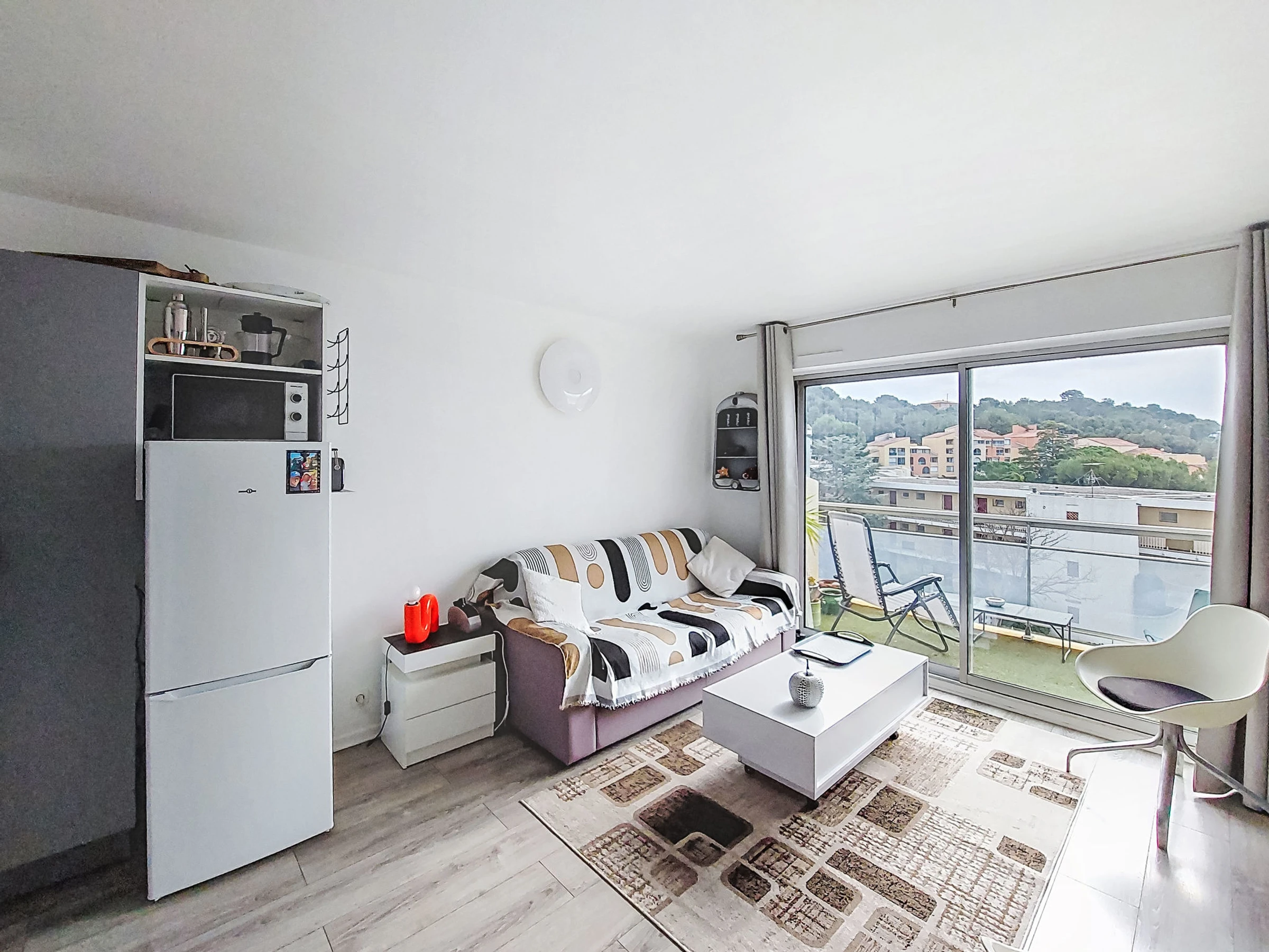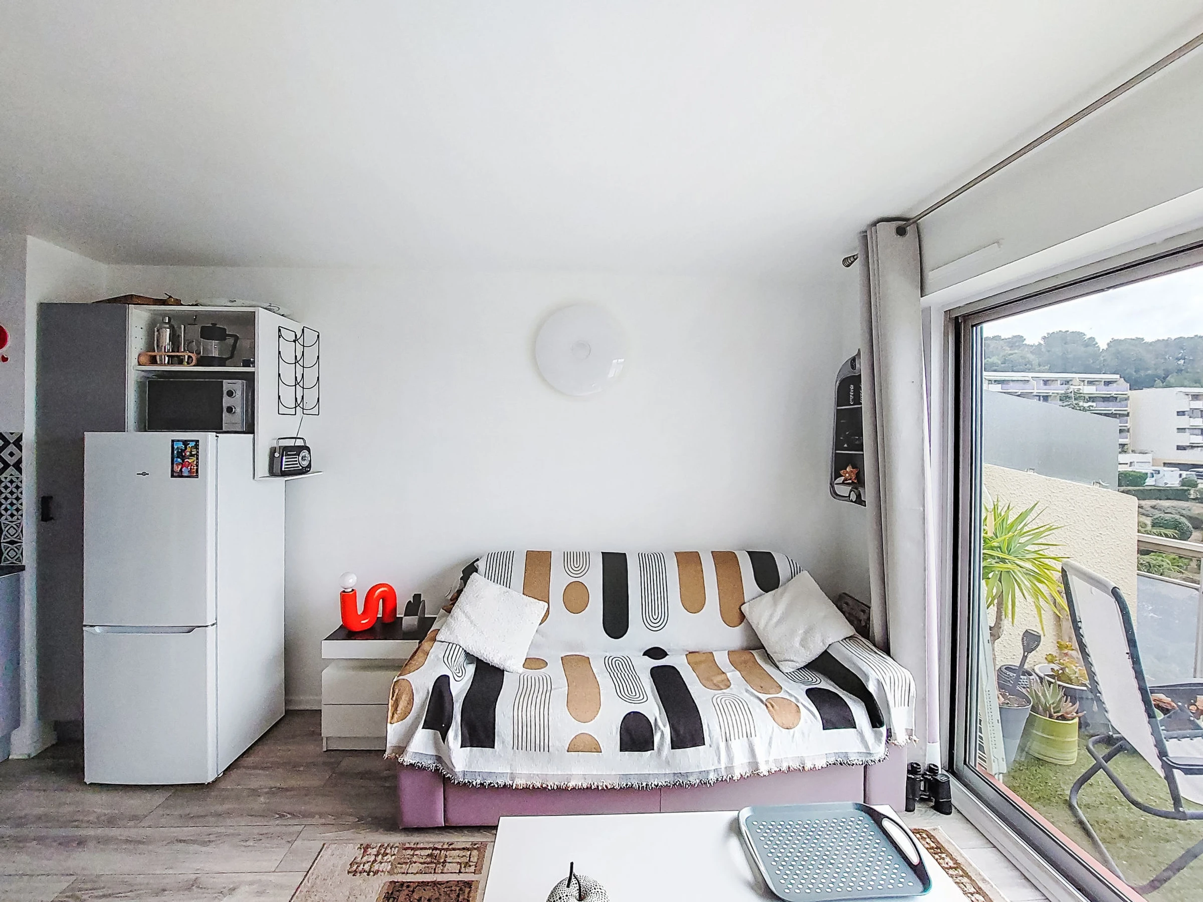 Studio 26 m2 au 3ème étage. Aménagement confortable et agréable: séjour/salle à manger avec 1 divan-lit double (160 cm, longueur 190 cm), TV (écran plat), air-conditionné. Sortie sur la terrasse. Coin cuisine (four, 4 plaques vitrocéramiques, grille-pain, micro-ondes, cafetière électrique). Douche/WC. Chauffage à air chaud. Terrasse 7 m2. Meubles de terrasse. Vue sur la mer. A disposition: lave-linge. Internet (Connexion WIFI, en sus). Place de parking No 694. Veuillez noter: TV seulement FR. Détecteur de fumée. Annonce d'un particulier (art 155, IV du CGI). [hidden]