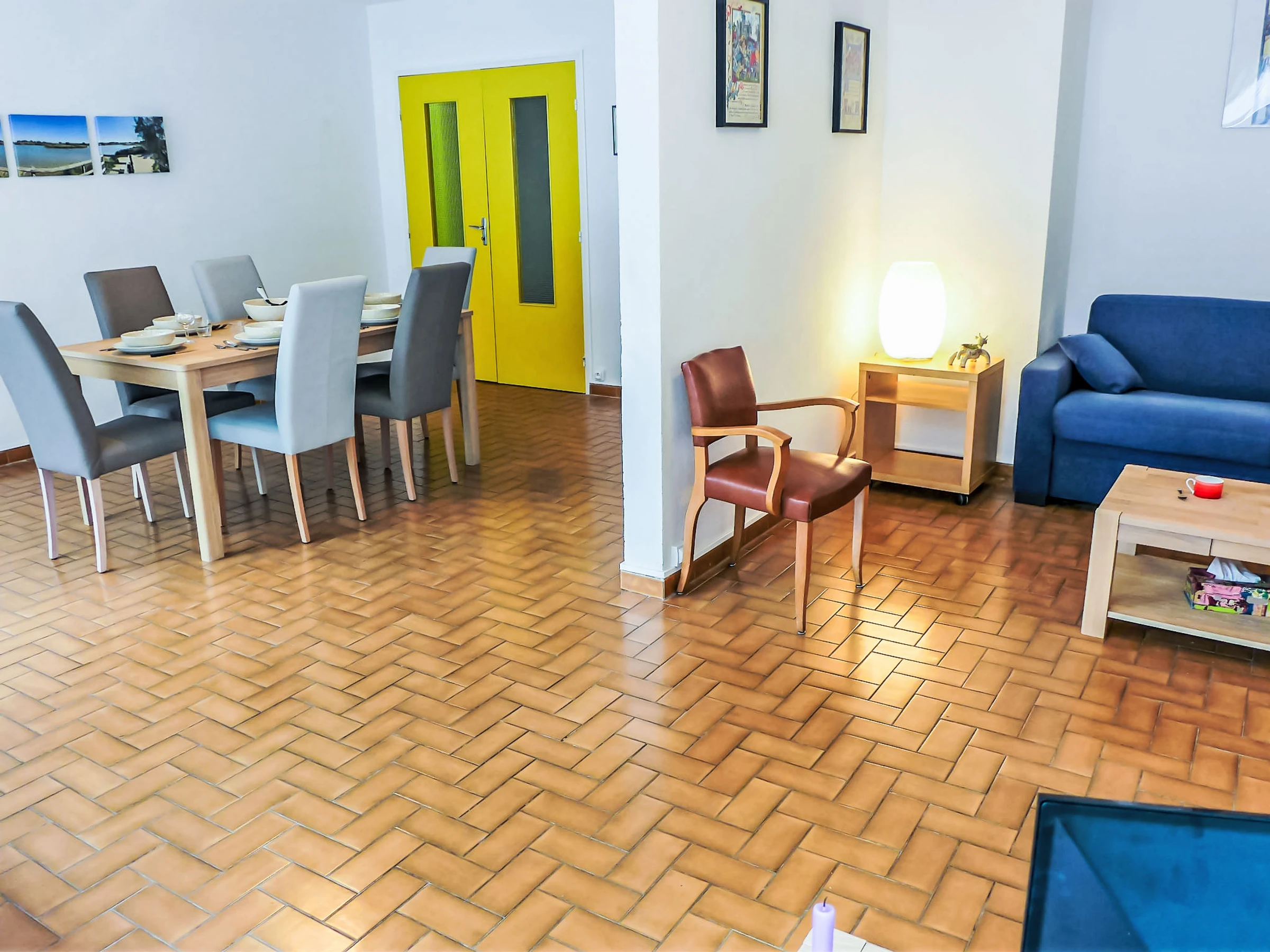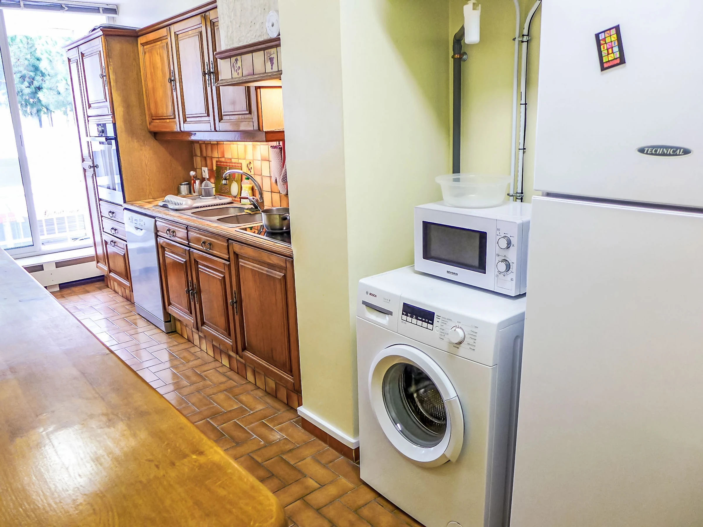 Apt 3 pièces 76 m2 au 2ème étage. Aménagement confortable: séjour/salle à manger avec 1 divan-lit double (140 cm, longueur 190 cm), TV (écran plat). Sortie sur la terrasse. 1 chambre avec 1 grand-lit (160 cm, longueur 190 cm). 1 chambre avec 2 lits (90 cm, longueur 190 cm). Cuisine (four, lave-vaisselle, 4 plaques à induction, micro-ondes, congélateur). Douche, WC séparé. Chauffage. 2 balcons, situation nord-ouest, 2 terrasses 6 m2, situation sud-est. Meubles de terrasse. A disposition: lave-linge. Internet (Connexion WIFI, gratuit). Veuillez noter: logement côté rue. Pas de parking. Maximum 1 animal/ chien autorisé. Détecteur de fumée.