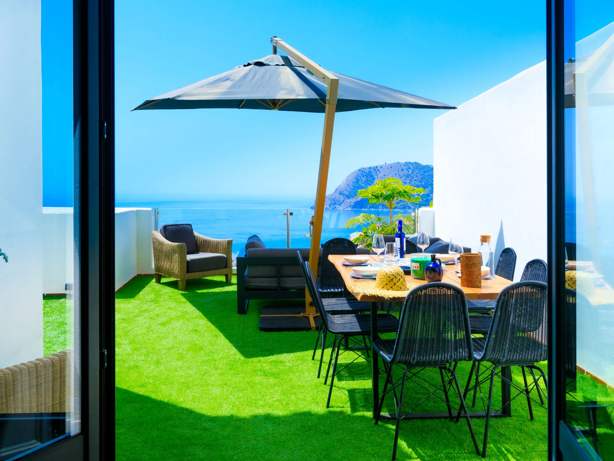 "Creativo", maison mitoyenne 4 pièces [hidden] m2, situation sud. Spacieux et clair, aménagement fonctionnel et confortable: séjour/salle à manger avec TV et air-conditionné. Sortie sur la terrasse. Cuisine (four, lave-vaisselle, 4 plaques vitrocéramiques, micro-ondes, congélateur, cafetière électrique). Douche/WC. Pas de chauffage. À l'étage inférieur: chambre avec passage avec air-conditionné. À l'étage supérieur: 1 chambre avec 1 grand-lit ([hidden] cm, longueur [hidden] cm), air-conditionné. 1 chambre avec 1 grand-lit ([hidden] cm, longueur [hidden] cm), air-conditionné. 1 chambre avec 1 grand-lit ([hidden] cm, longueur [hidden] cm), air-conditionné. Douche/WC. Grande terrasse. Superbe vue panoramique sur l'océan et la baie. A disposition: lave-linge, sèche-linge, fer à repasser, chaise haute pour enfant, lit bébé jusqu'à 3 ans, sèche-cheveux. Internet (Connexion WIFI, gratuit). Place de parking No 14/19. Adapté(e) aux familles. [hidden] // Reg. Nr.: ESFCTU[hidden][hidden][hidden]0