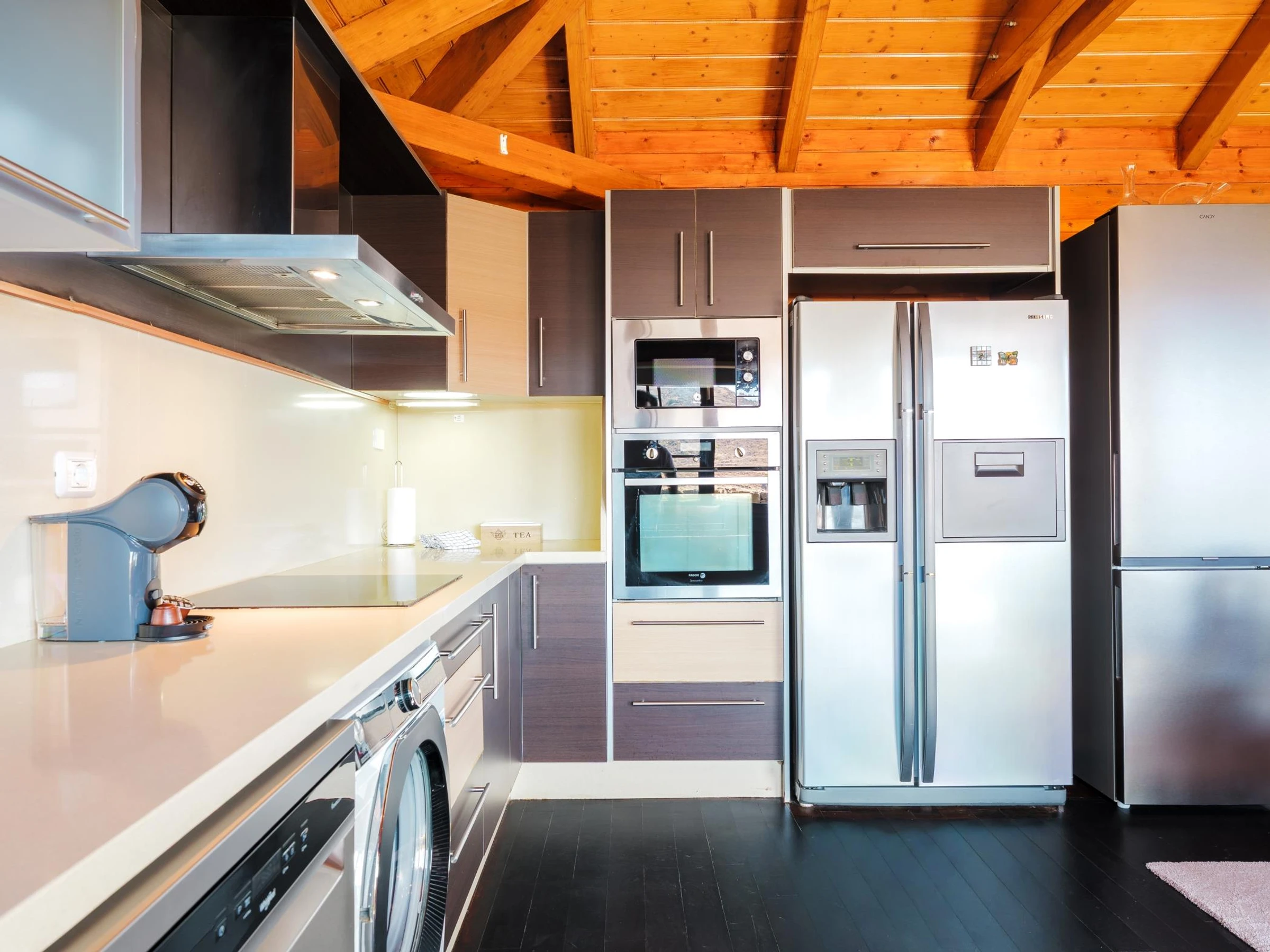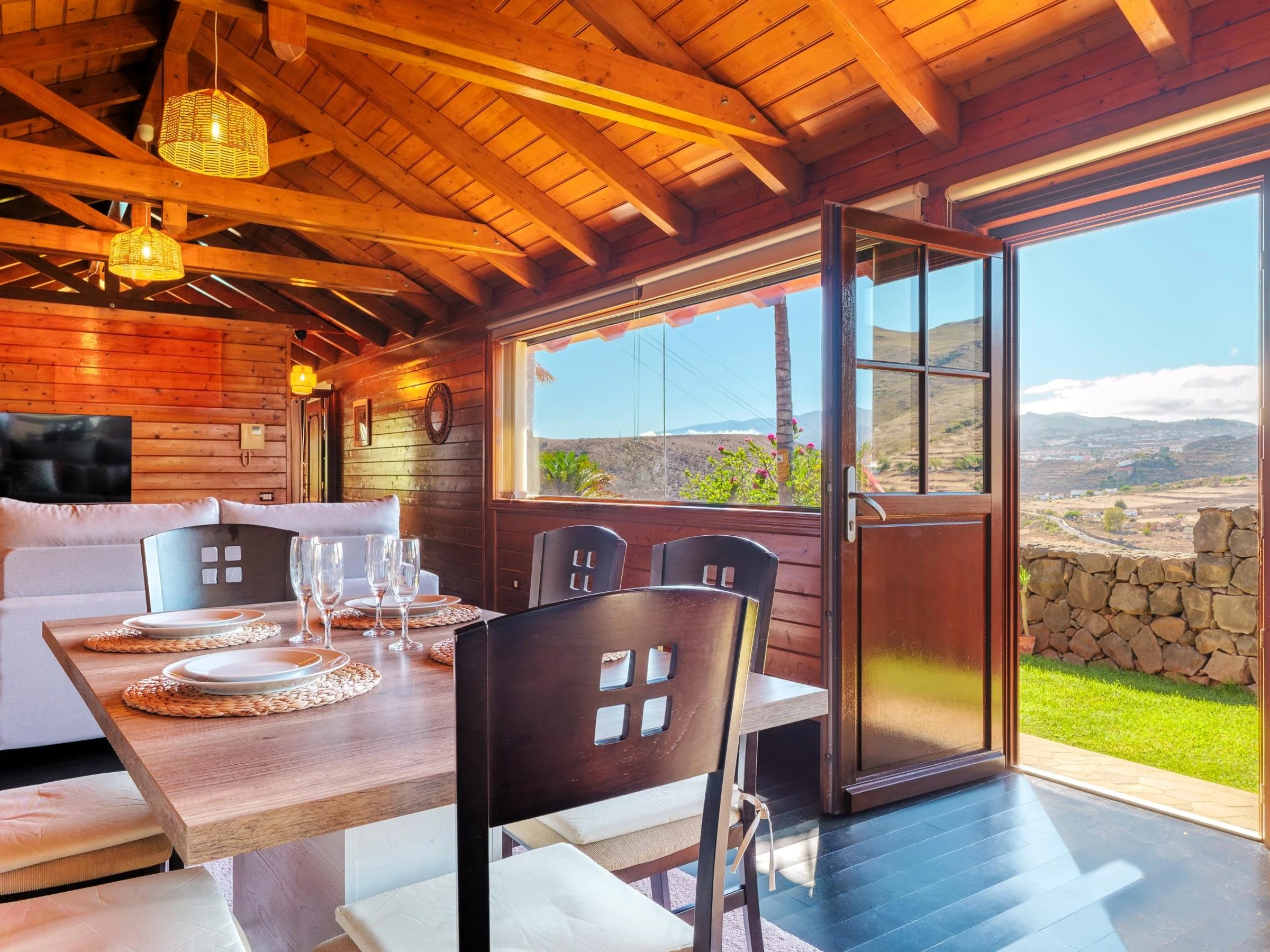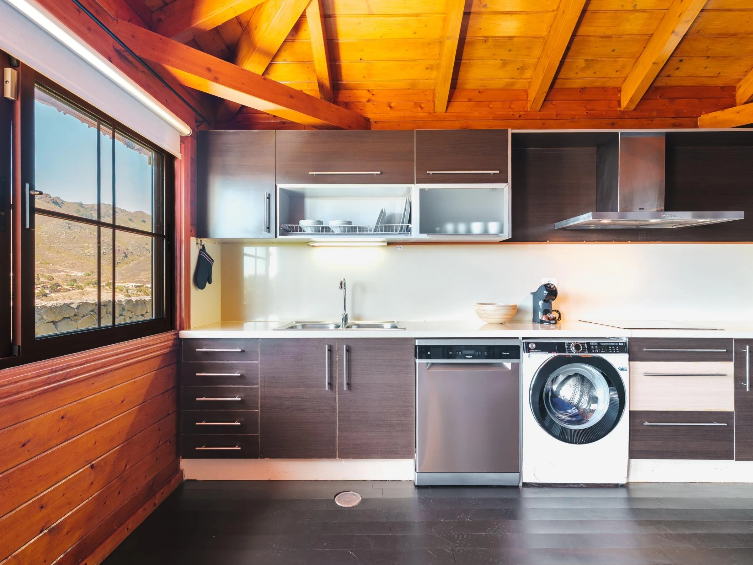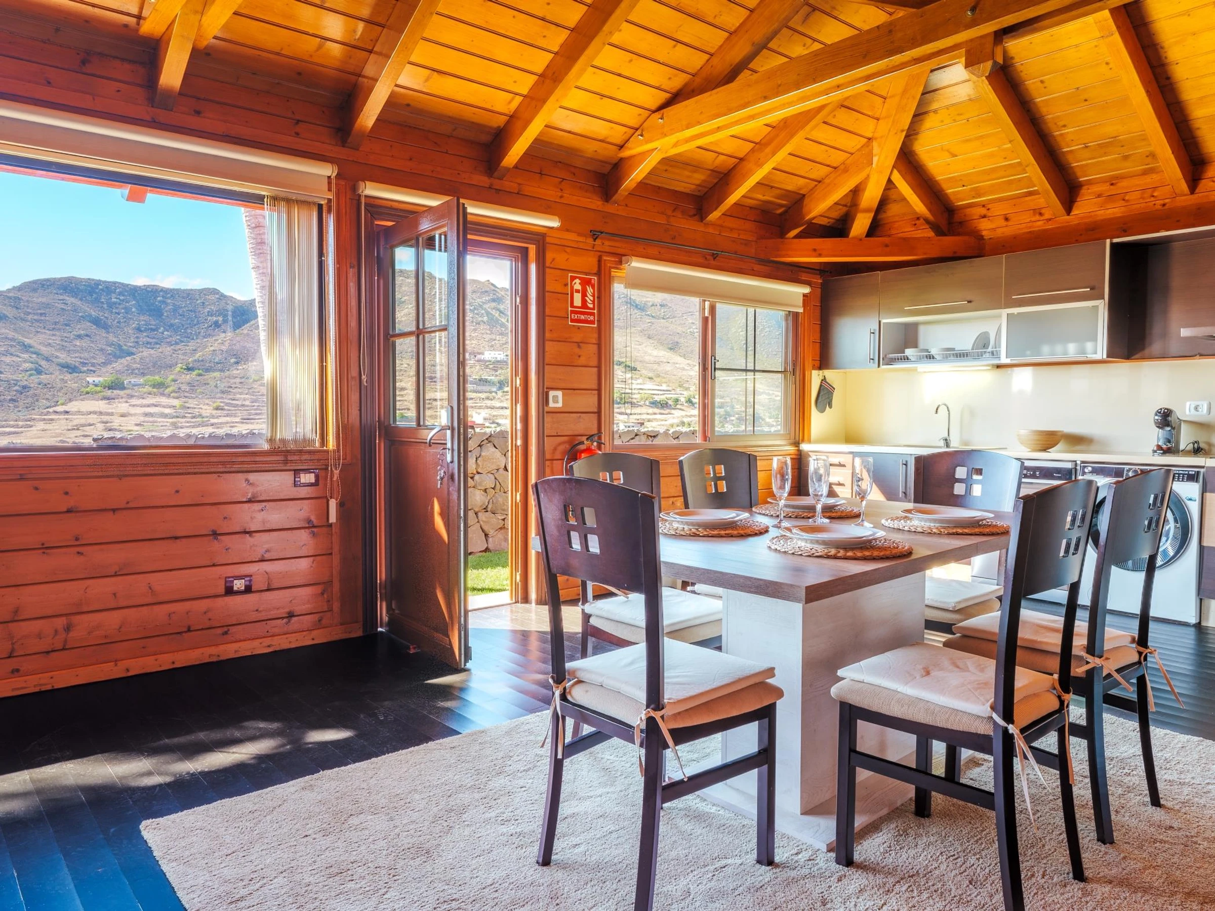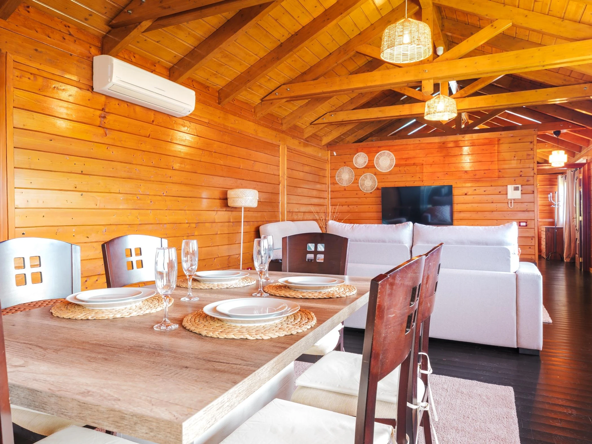 Entrez dans la cabane en bois dans la cuisine entièrement équipée et le coin repas. L'espace décloisonné dispose également d'un salon avec des canapés et une Smart TV. L'un des canapés se transforme en canapé-lit.