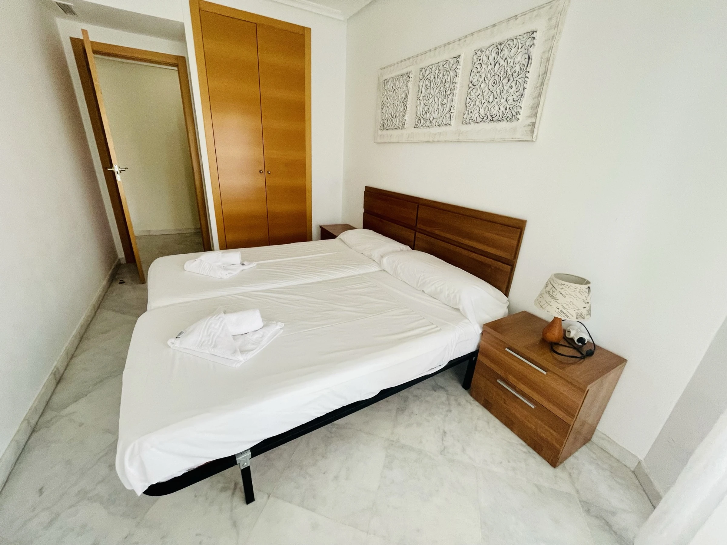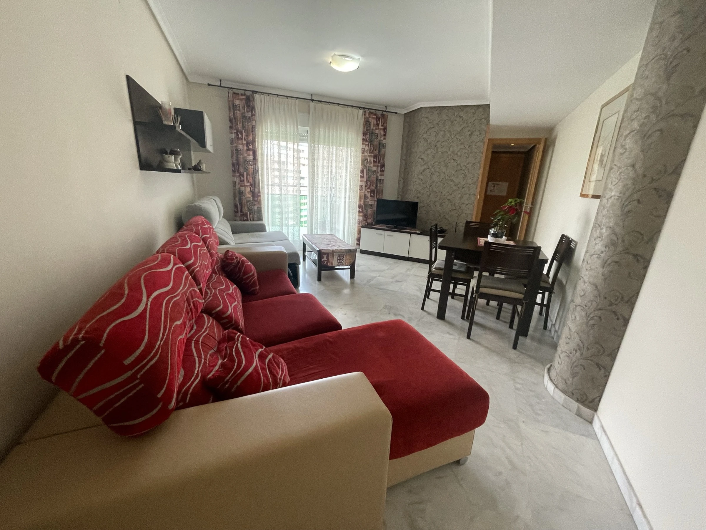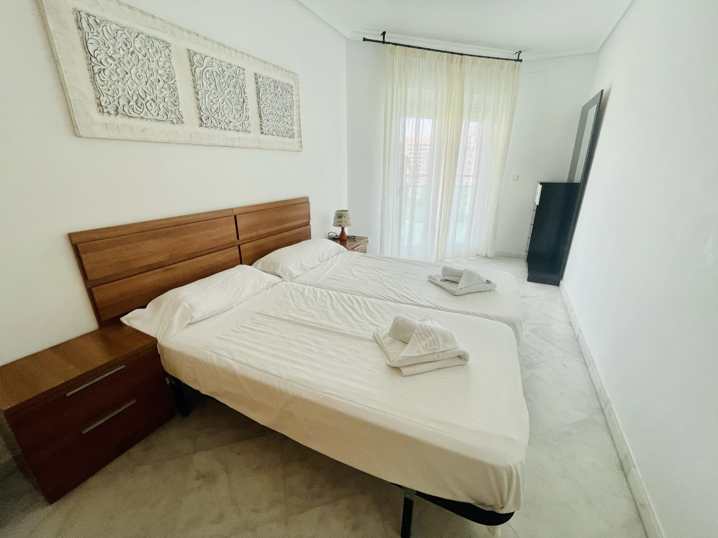 Appartement spacieux avec grande terrasse dans l’immeuble Vila Park, Cala de Villajoyosa, Benidorm. 4ème étage, 80 m², capacité pour 6 personnes, 2 chambres, l’une avec un lit double et l’autre avec deux lits simples. Canapé-lit double dans le salon. Salle de bains avec baignoire et une autre avec douche. Cuisine entièrement équipée avec plaque vitrocéramique, réfrigérateur, congélateur, four, lave-linge, micro-ondes, vaisselle, bouilloire, presse-agrumes, cafetière, grille-pain et ustensiles de cuisine. Fer à repasser, TV et WIFI. Climatisation et chauffage par pompe à chaleur. Animaux acceptés jusqu’à 20 kg. Parking privé dans le même immeuble inclus dans le prix. Immeuble avec jardin, barbecue, court de padel, aire de jeux pour enfants et piscine commune + pour enfants. À 800 m de la plage Cala de Finestrat, 650 m du supermarché et 800 m de l’arrêt de bus.