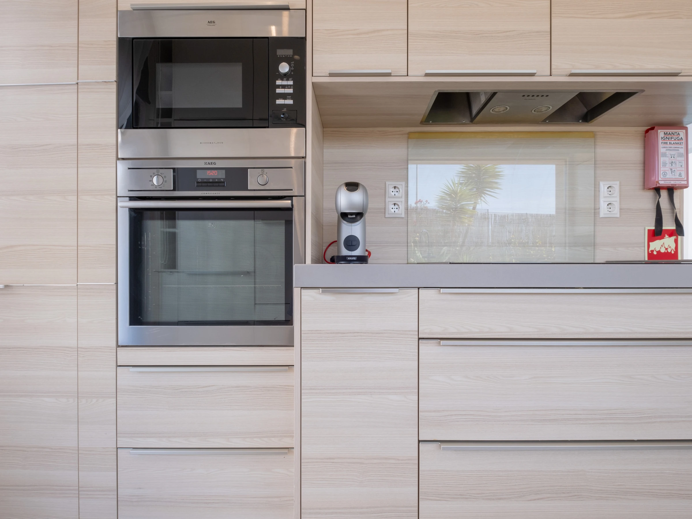 La cuisine américaine, à induction, est équipée avec réfrigérateur, micro-ondes, four, congélateur, lave-vaisselle, vaisselle/couverts, ustensiles/cuisine, cafetière, grille pain, bouilloire et equipement de cuisine.