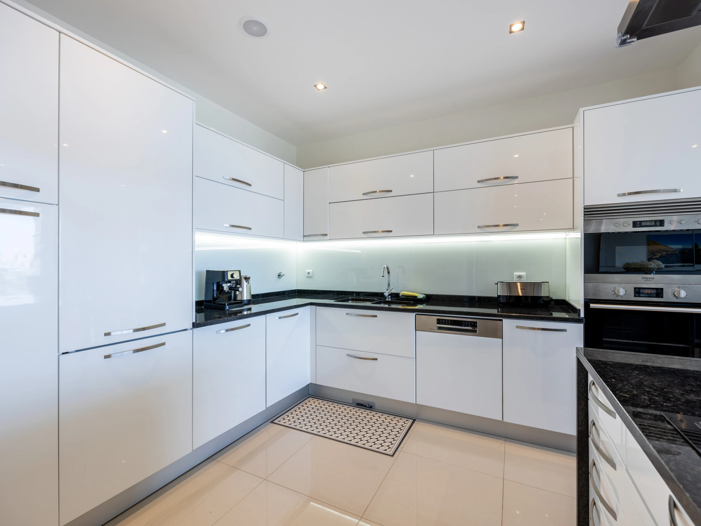 La cuisine américaine, à induction, est équipée avec réfrigérateur, micro-ondes, four, congélateur, lave-vaisselle, vaisselle/couverts, ustensiles/cuisine, cafetière, grille pain, bouilloire et cuisinière.