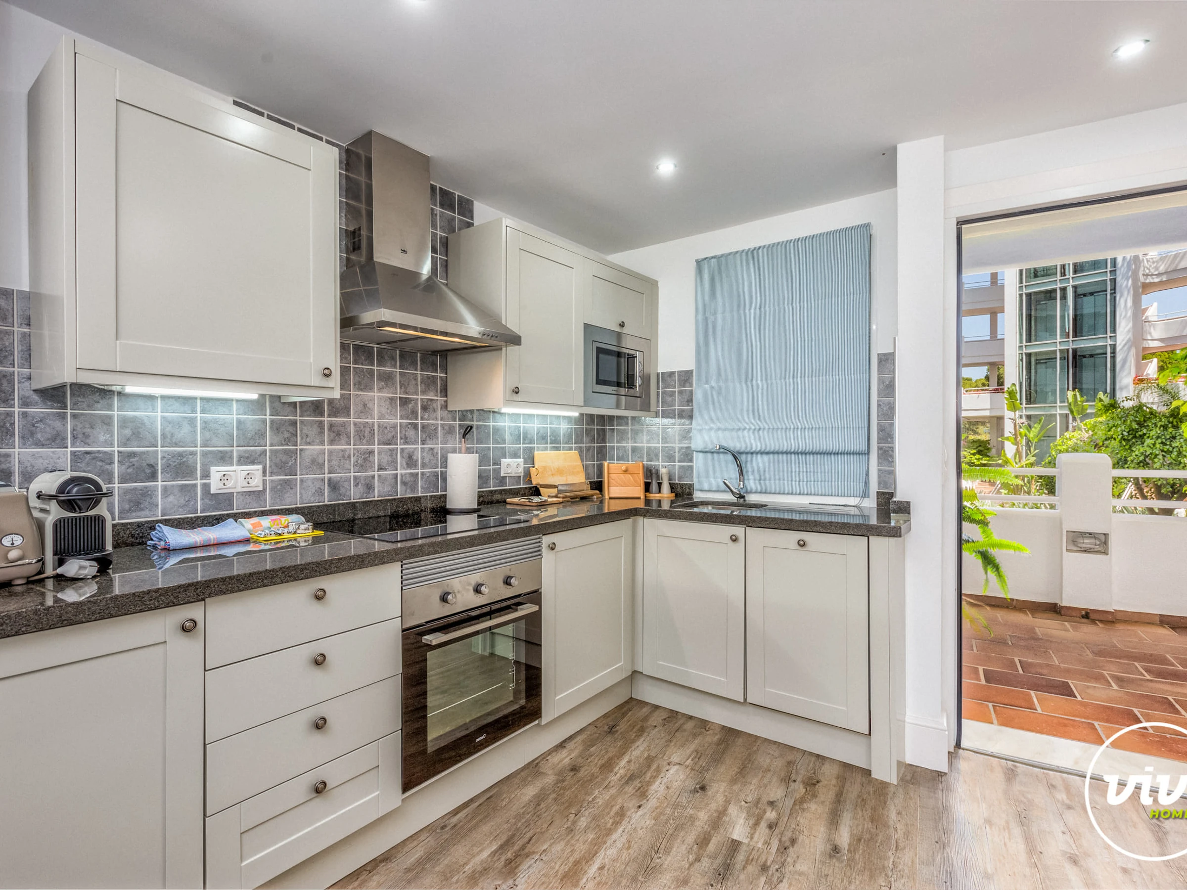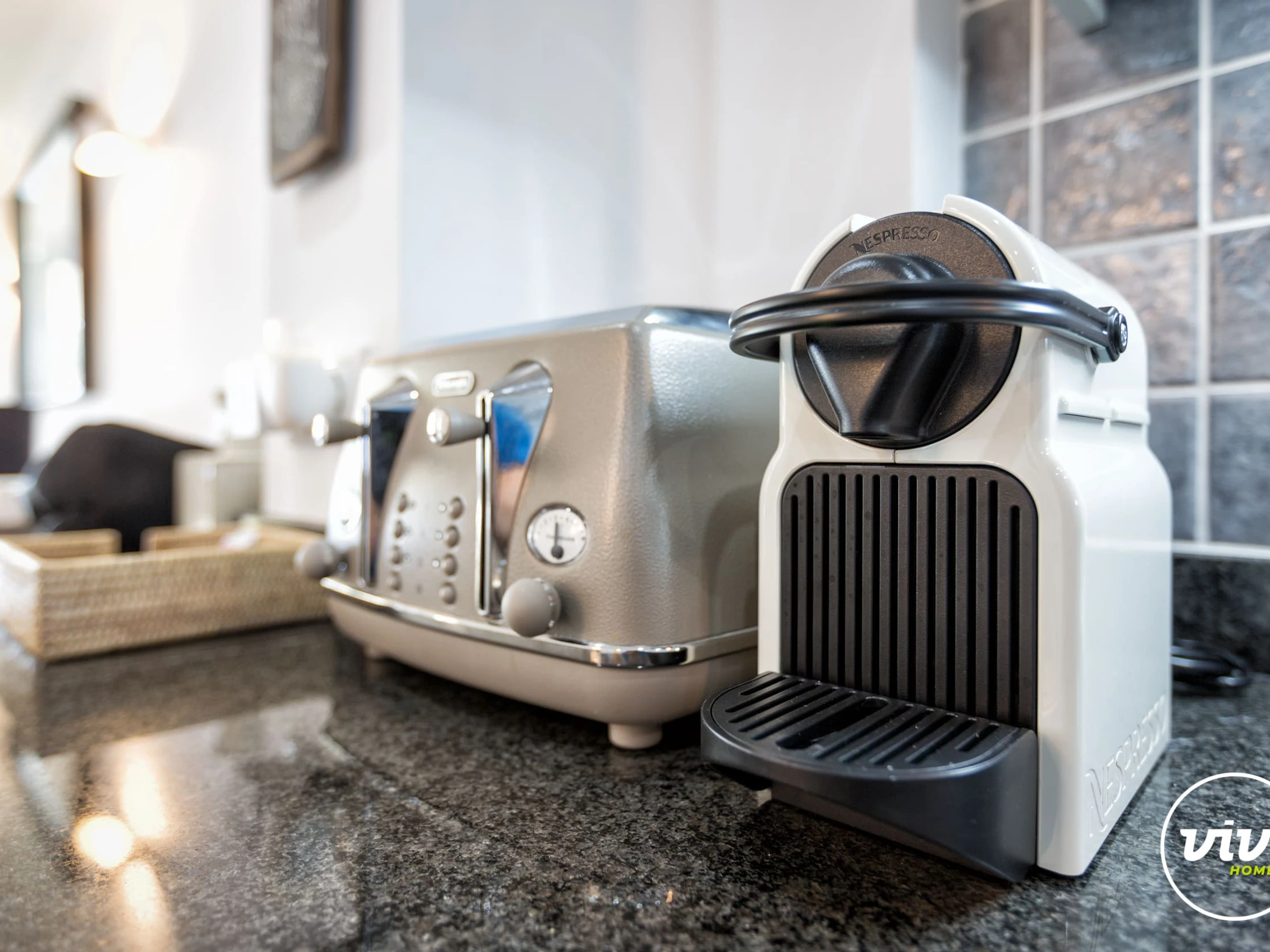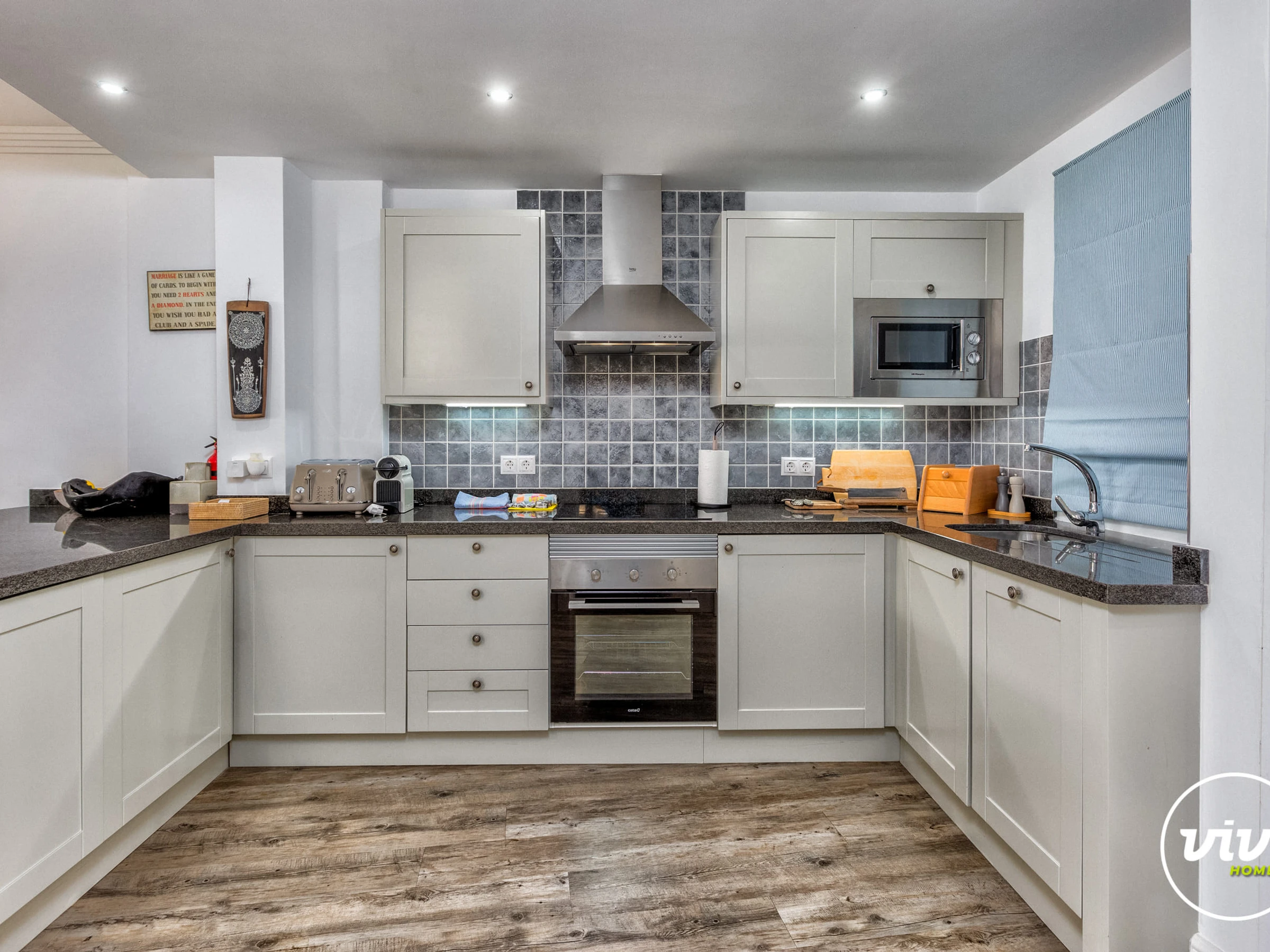 La cuisine américaine, à induction, est équipée avec réfrigérateur, micro-ondes, four, congélateur, lave-vaisselle, vaisselle/couverts, ustensiles/cuisine, cafetière, grille pain, bouilloire, equipement de cuisine, assiettes et bols.