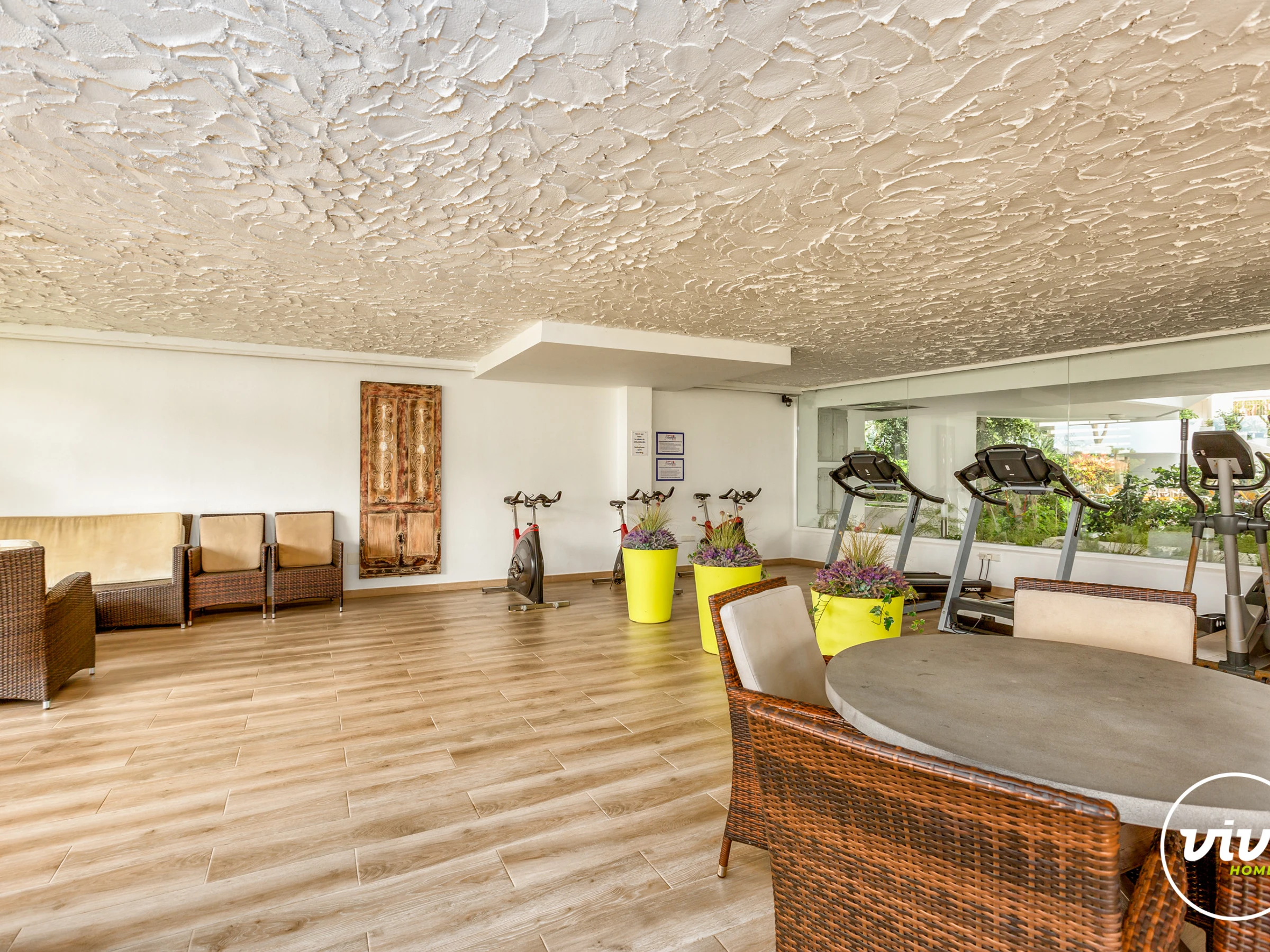 Elle dispose de ascenseur, mobilier de jardin, clôture, 30 m² de terrasse, lave-linge, sèche-linge, barbecue, fer à repasser, coffre-fort, accès internet (wifi), sèche-cheveux, salle de sport, alarme, chauffage central, climatisation dans le salon et certaines chambres, piscine collective+infantile, parking extérieur bâtiment proche, 1 Télévision.