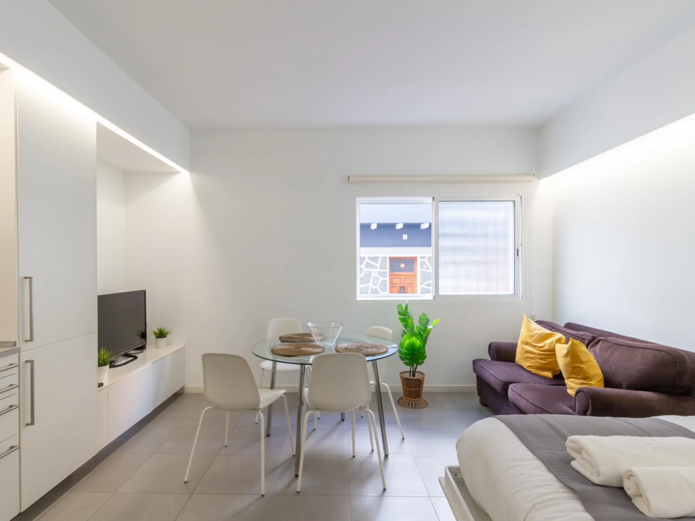 Studio récemment rénové à 200 mètres de la plage de Las Canteras. Cuisine, salon et chambre sont intégrés dans un espace unique, cosy et lumineux. Le salon dispose d'un canapé confortable et d'une table où vous pourrez prendre vos repas. La Smart TV a accès à Apple TV pour que vous puissiez entrer vos mots de passe et accéder à vos séries et films préféré[hidden] cuisine est PARFAITEMENT ÉQUIPÉE avec un four, un micro-onde, un très grand réfrigérateur, laveuse/sécheuse, etc. La CHAMBRE intégrée au séjour dispose d'un lit de 150 cm qui peut être relevé et laissé ouvert. La salle de bain est indépendante et dispose d'une douche et de toilettes.