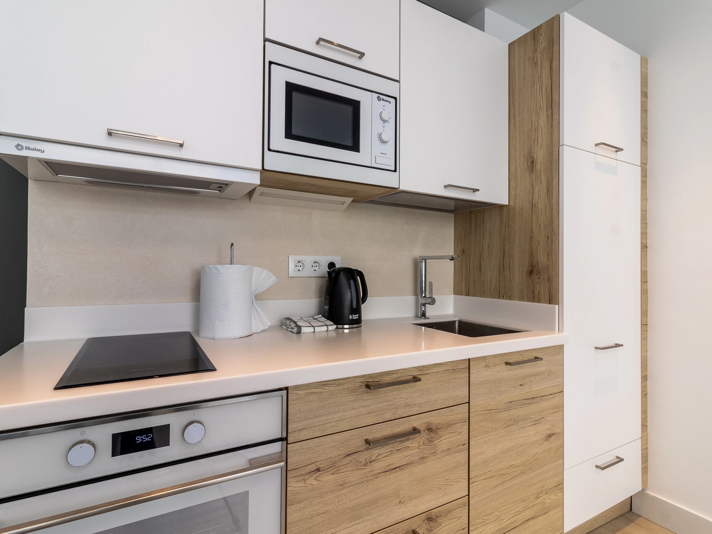 La cuisine, est équipée avec micro-ondes, four et grille pain.