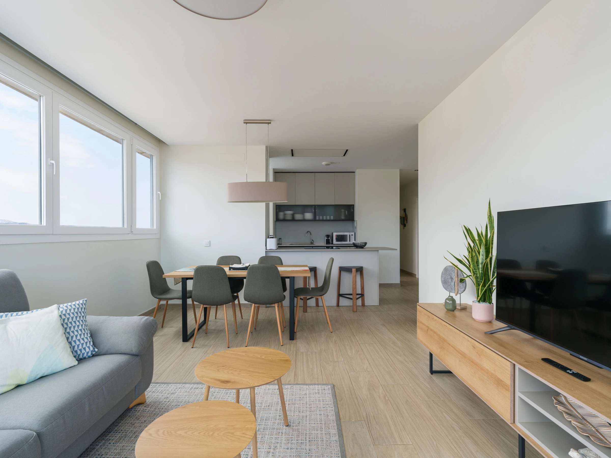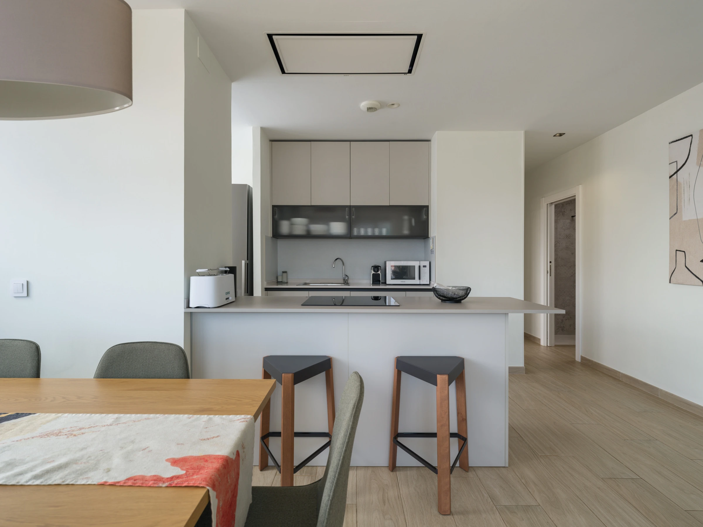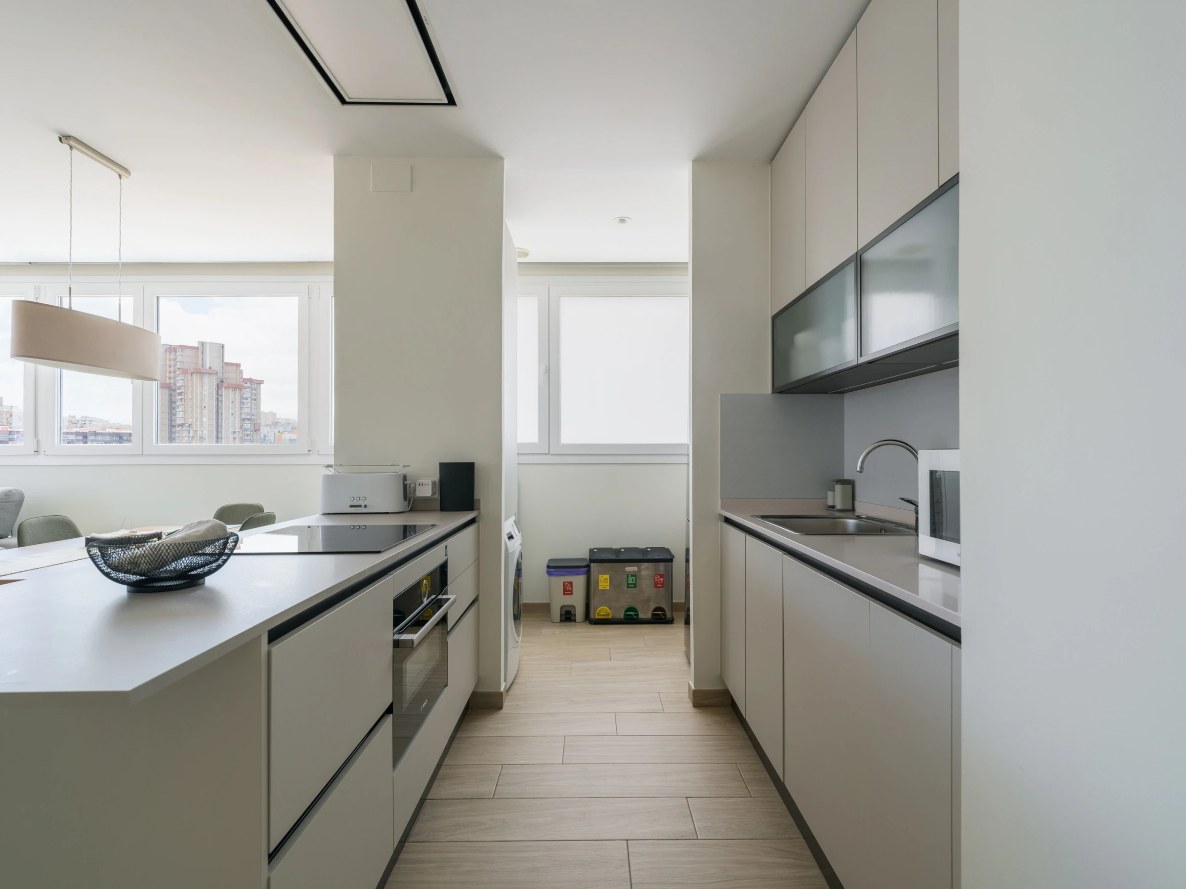 Parmi ses caractéristiques, on peut noter un balcon avec vue sur la mer et la ville, un salon avec canapé, une zone de repas, une télévision HD, une connexion WiFi, un bureau de travail et une zone de repassage. Le logement est décoré avec goût et dispose de détails tels que des porte-manteaux, des placards intégrés et de la literie de qualité.