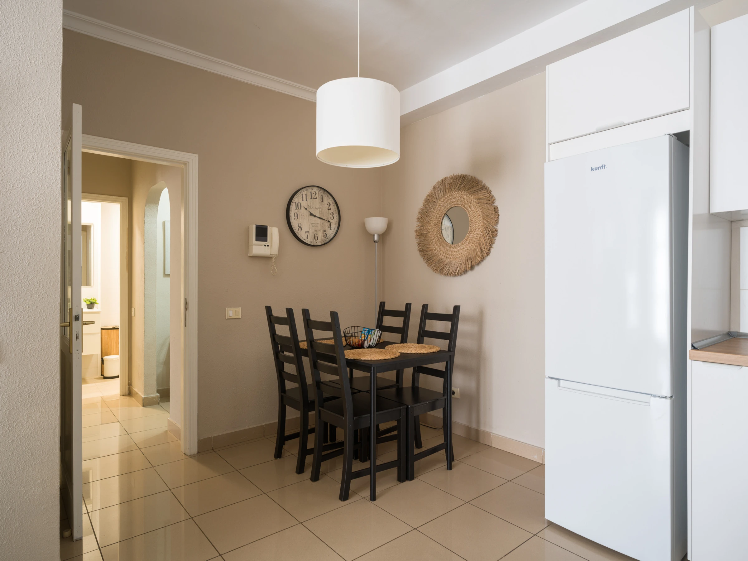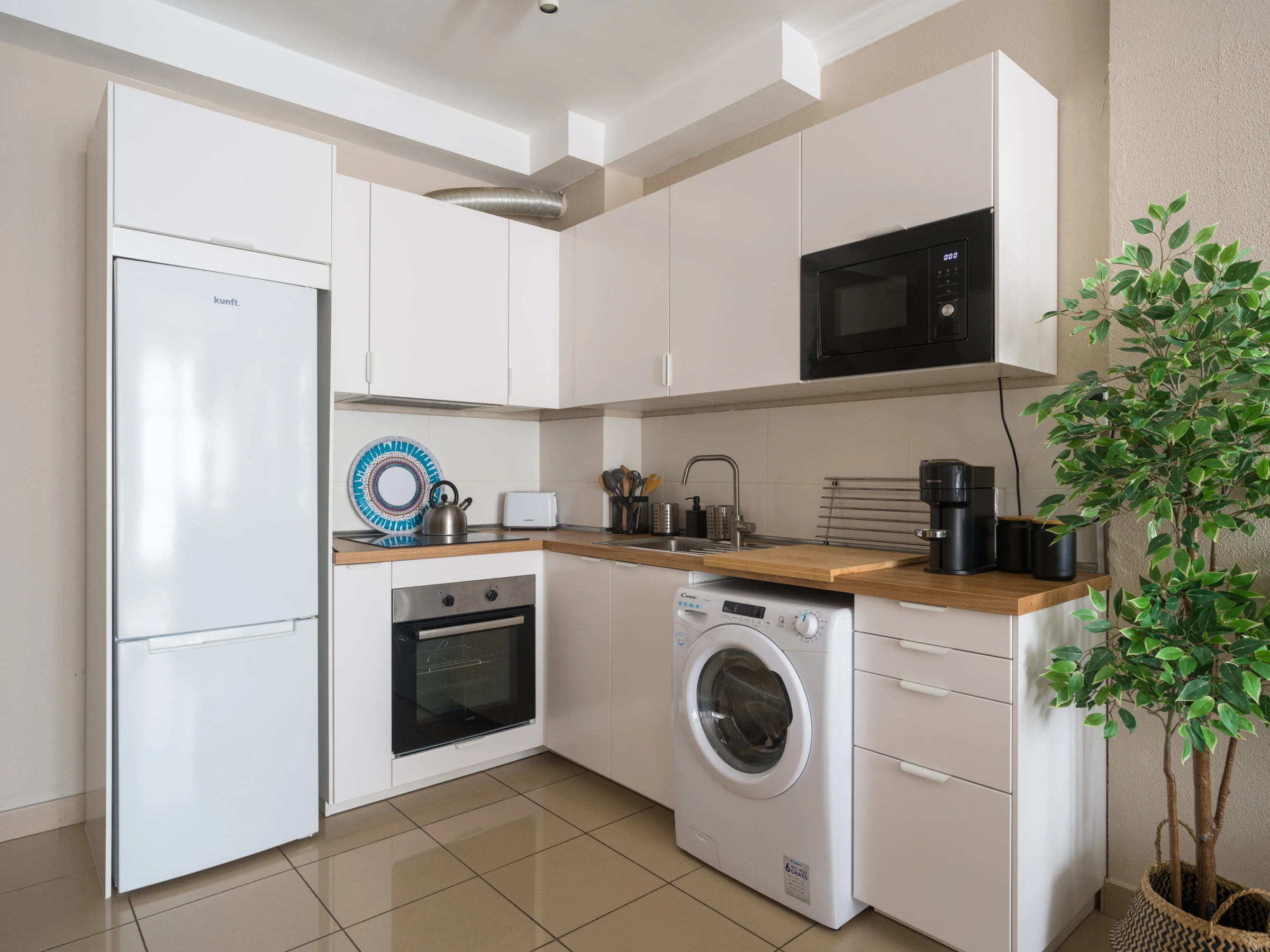 La cuisine américaine est entièrement équipée d'appareils électroménagers modernes, y compris un réfrigérateur, un congélateur, un lave-linge, un four et un équipement de cuisine complet. Parfaite pour préparer de délicieux repas et profiter de moments gastronomiques en famille ou entre amis.