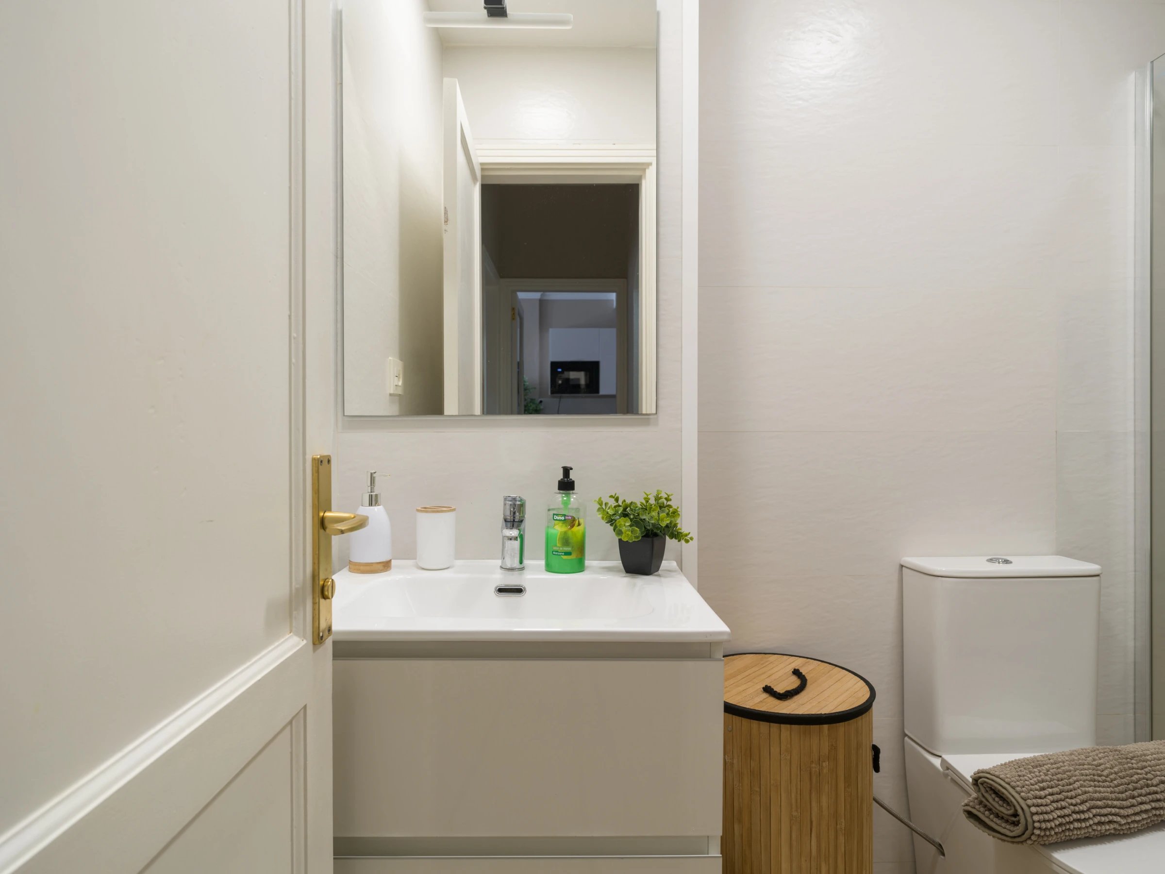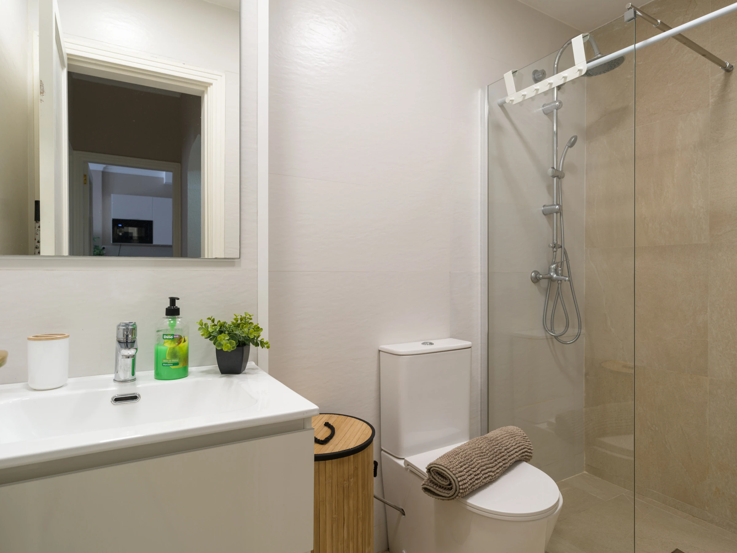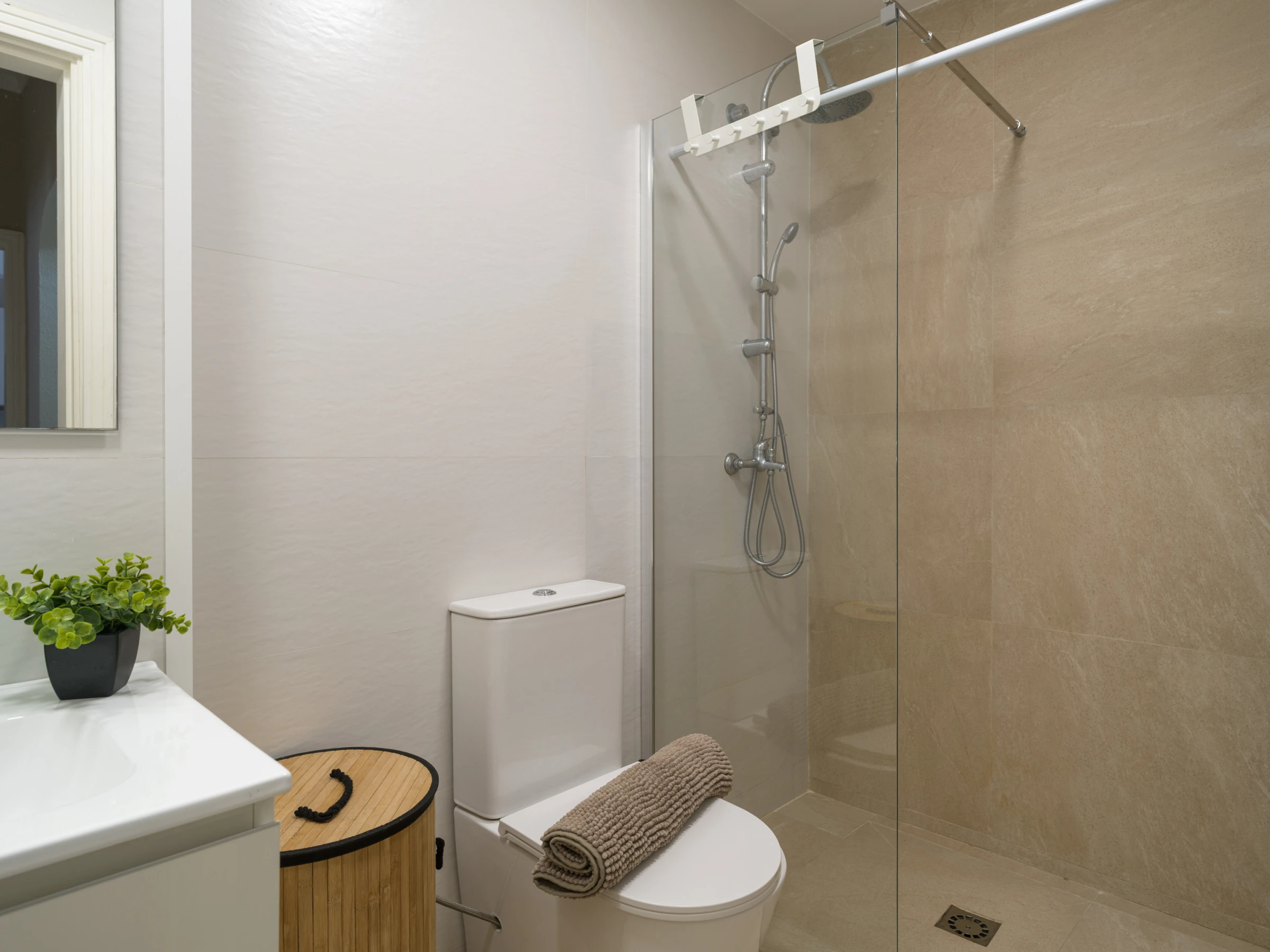 La salle de bain avec douche est conçue pour répondre à tous les besoins, offrant confort et fonctionnalité. De plus, l'appartement comprend des services tels que le WiFi, la climatisation, un fer à repasser et une Smart TV pour rendre votre séjour plus agréable.