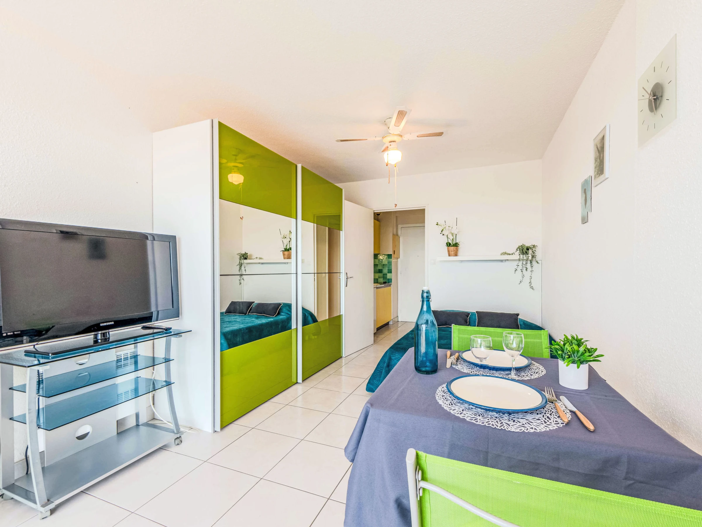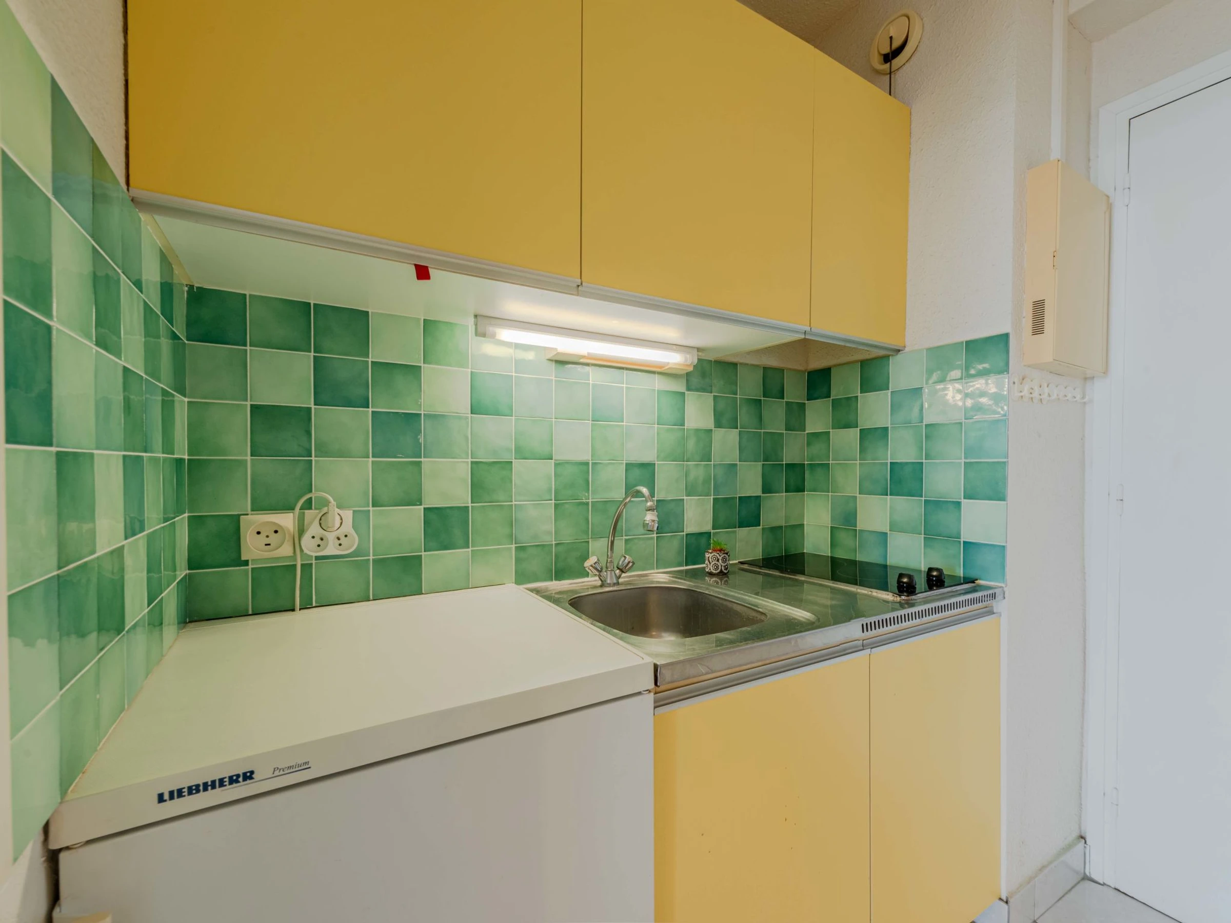 Studio 23 m2 au 5ème étage. Séjour/salle à manger avec 1 grand-lit (1 x 140 cm, longueur 190 cm), TV (écran plat). Dans l'entrée (2 plaques de cuisson, mini-four, grille-pain, bouilloire électrique, micro-ondes, cafetière électrique). Douche/WC. Très belle vue sur la mer. A disposition: Internet (Connexion WIFI, en sus). Place de parking. Annonce d'un professionnel (art 155, IV du CGI)