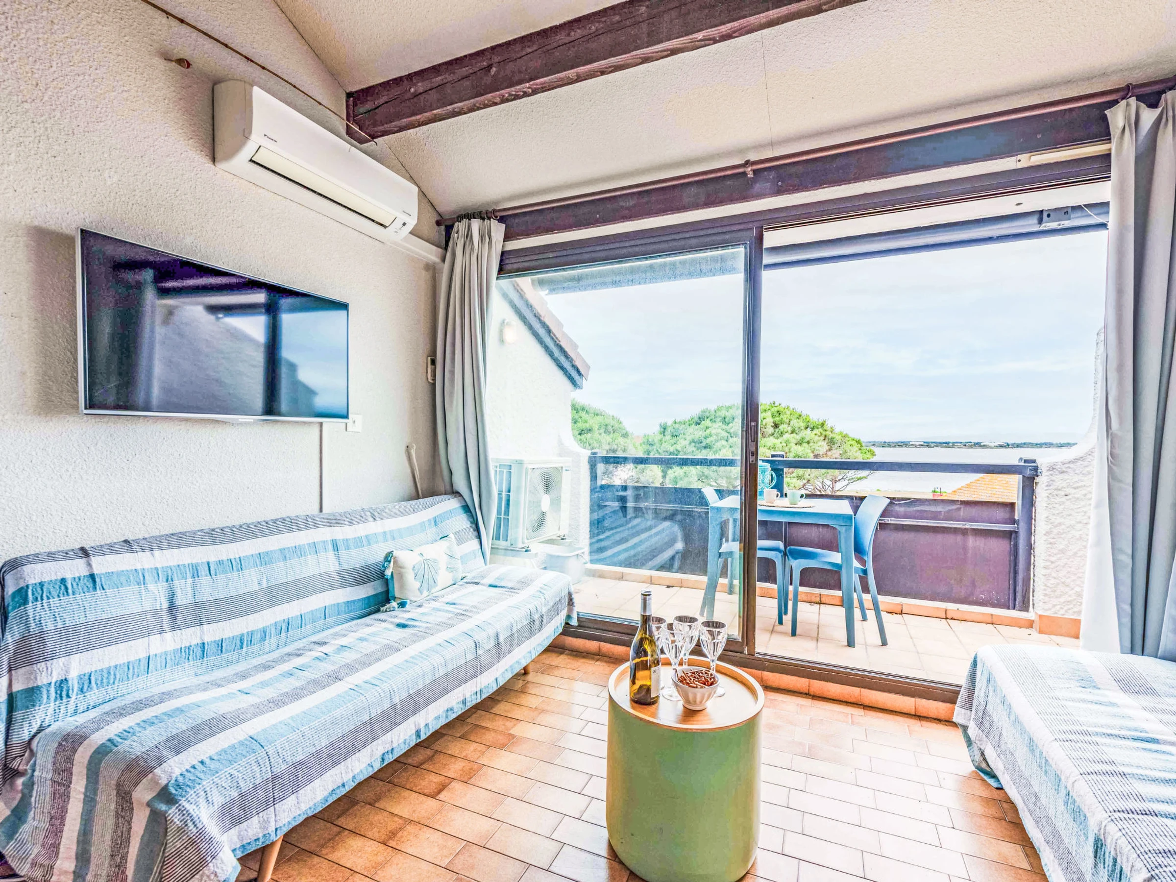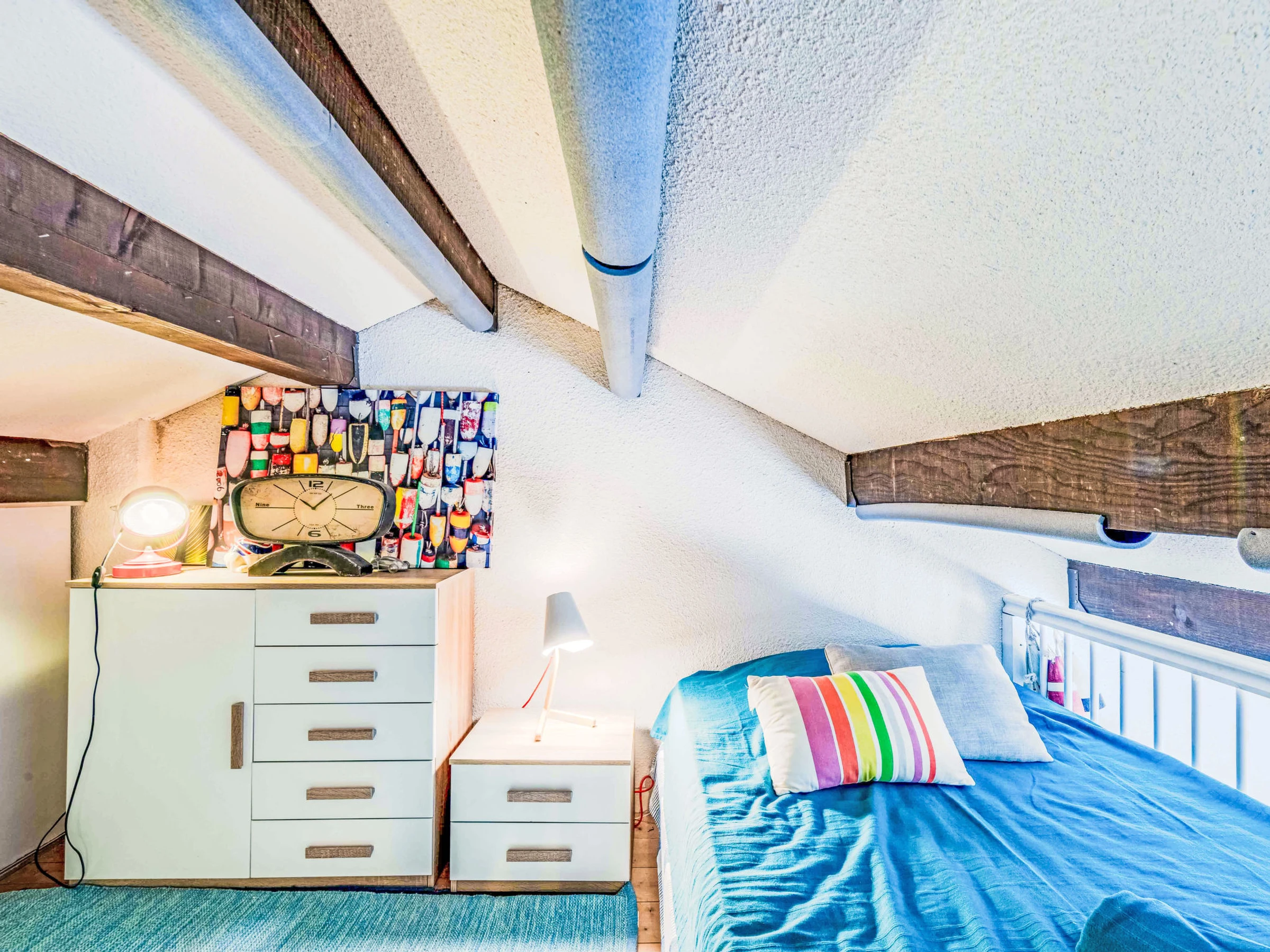 Apt 2 pièces 38 m2 au 3ème étage, situation sud-ouest. Séjour/salle à manger avec 1 divan-lit double (1 x 120 cm, longueur 190 cm), TV (écran plat). Sortie sur la terrasse. 1 chambre avec 1 grand-lit (1 x 160 cm, longueur 200 cm). Coin cuisine (mini-four, lave-vaisselle, 4 plaques vitrocéramiques, cafetière électrique). Douche/WC. Air-conditionné. À l'étage supérieur: (escalier en colimaçon) galerie avec 1 grand-lit (1 x 130 cm, longueur 190 cm). Terrasse 7 m2. Meubles de terrasse. Belle vue sur le lac et les montagnes. A disposition: lave-linge. Internet (Connexion WIFI, en sus). Veuillez noter: maximum 1 animal/ chien autorisé. Détecteur de fumée. Annonce d'un particulier  (art 155, IV du CGI).