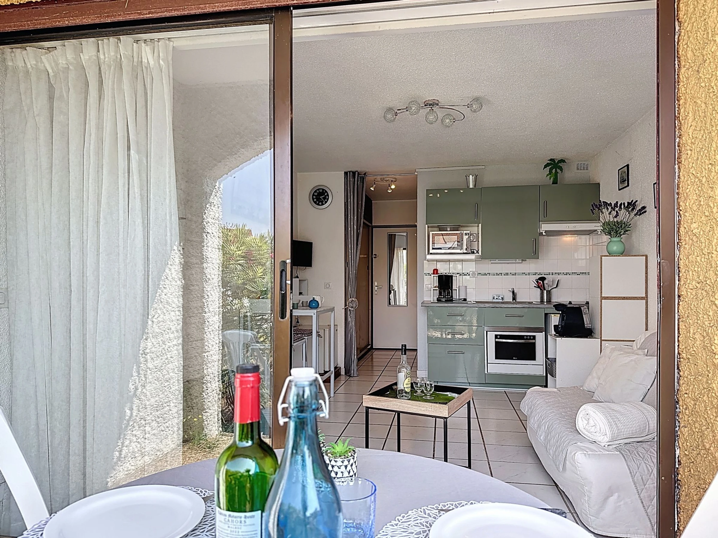 Studio 22 m2, au rez-de-chaussée, situation sud. Séjour/salle à manger avec 1 divan-lit double (1 x 140 cm, longueur 190 cm), TV (écran plat). Sortie sur la terrasse. Coin cuisine (four, lave-vaisselle, 2 plaques vitrocéramiques, bouilloire électrique, micro-ondes, congélateur, cafetière électrique). Salle de bains, WC séparé. Terrasse 7 m2. Meubles de terrasse. Vue sur le jardin. A disposition: Internet (Connexion WIFI, en sus). Place de parking à 150 m. Veuillez noter: détecteur de fumée. Annonce d'un particulier (art 155, IV du CGI).