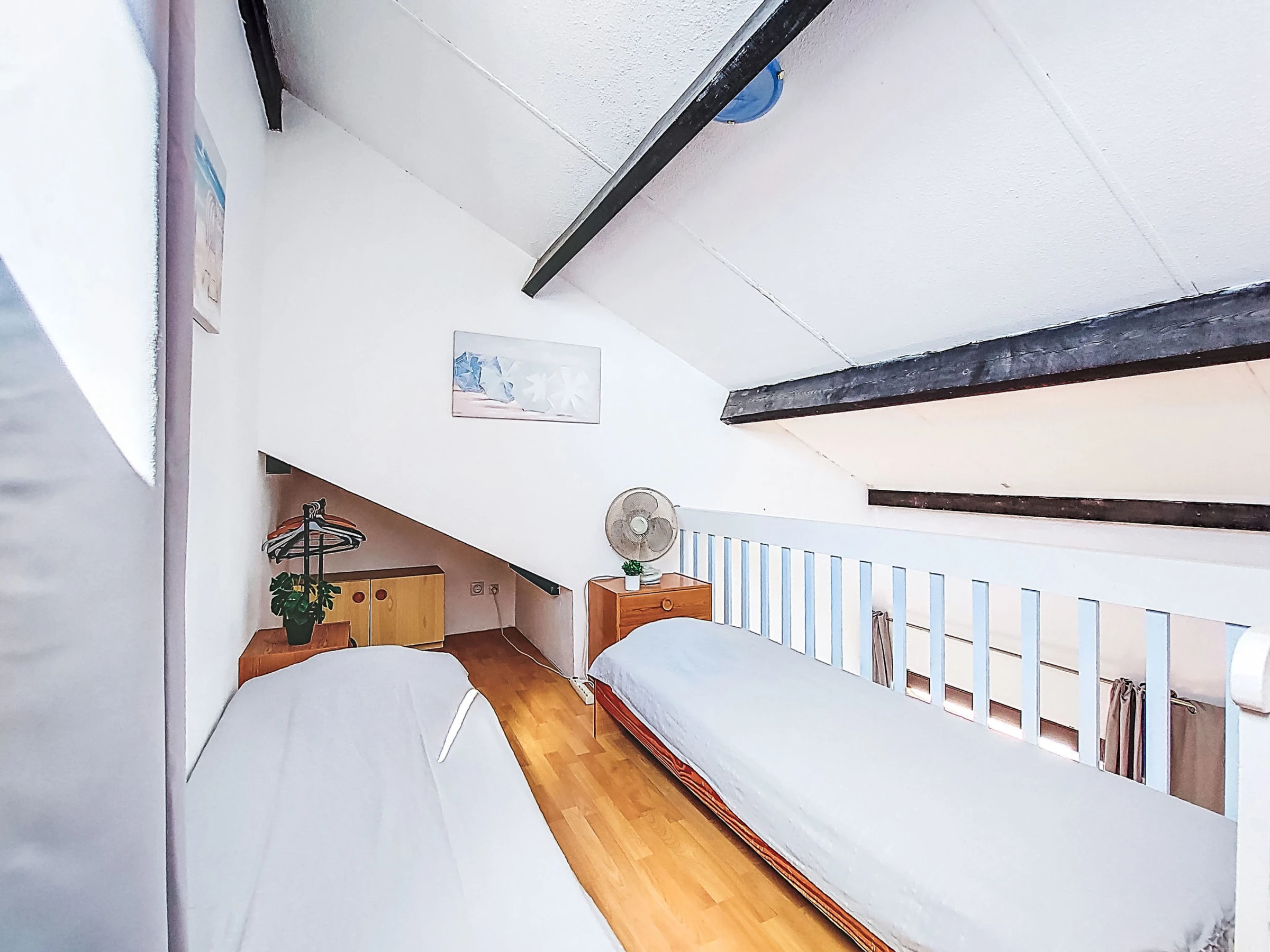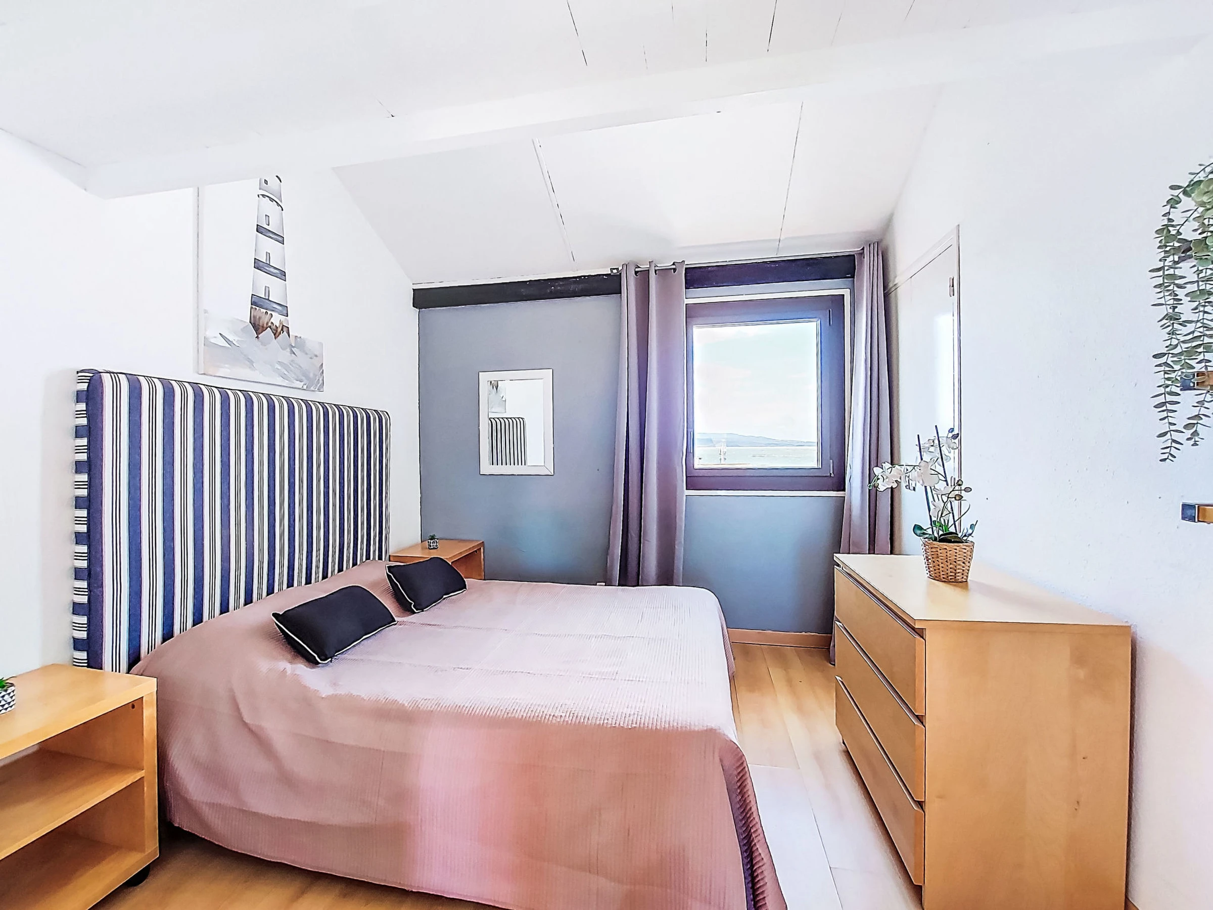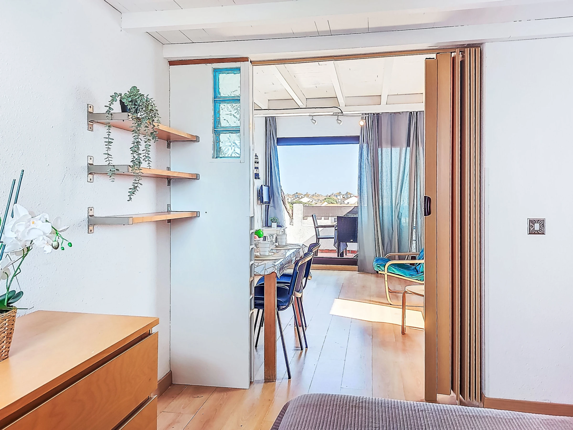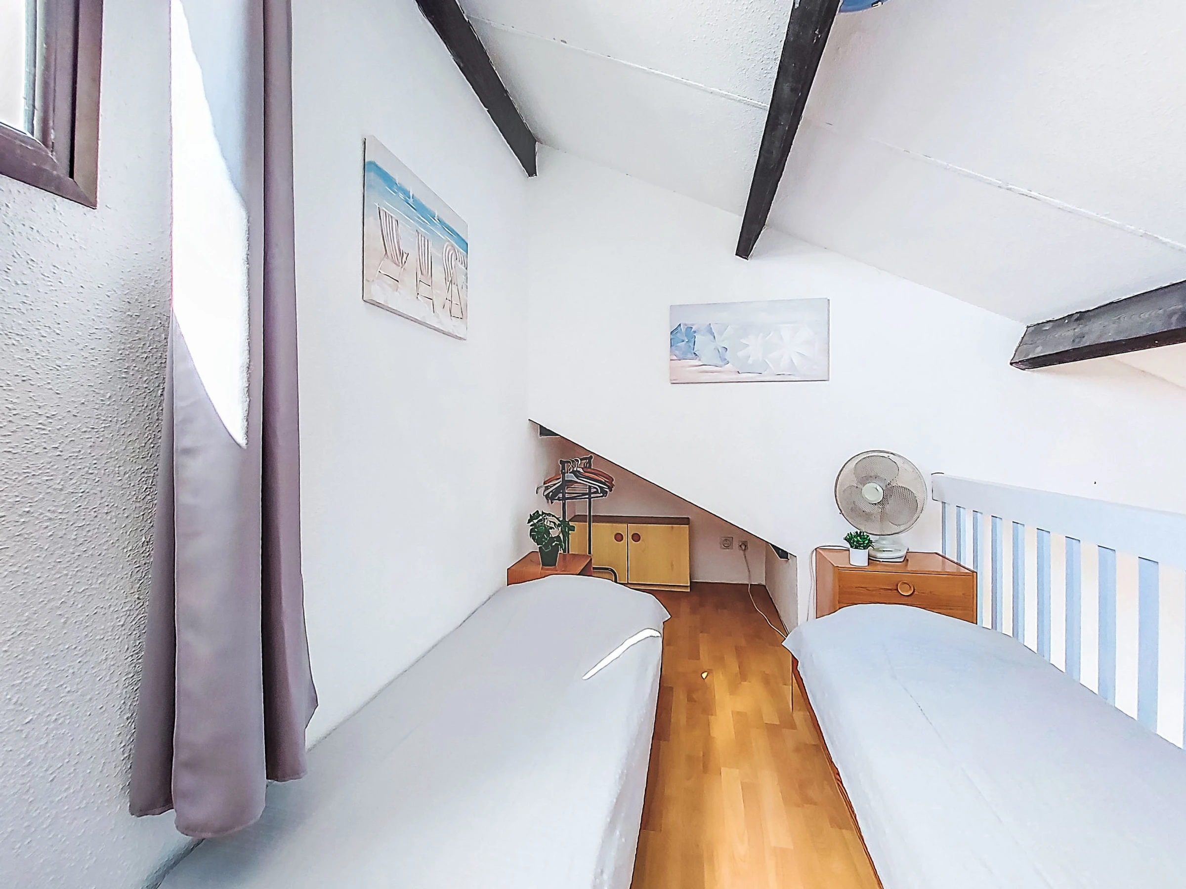 Apt 2 pièces 35 m2 au 3ème étage, situation sud-ouest. Séjour/salle à manger avec 1 divan-lit double (1 x 120 cm, longueur 190 cm), TV (écran plat), air-conditionné. Sortie sur la terrasse. 1 chambre avec 1 grand-lit (1 x 140 cm, longueur 190 cm). (4 plaques vitrocéramiques, congélateur, cafetière électrique, combiné micro-ondes). Douche/WC. À l'étage supérieur: (escalier raide) galerie avec 2 lits (80 cm, longueur 190 cm). Terrasse 7 m2. Meubles de terrasse, barbecue électrique. Belle vue sur le lac et les montagnes. A disposition: lave-linge. Internet (Connexion WIFI, en sus). Place de parking à 100 m. Veuillez noter: détecteur de fumée.