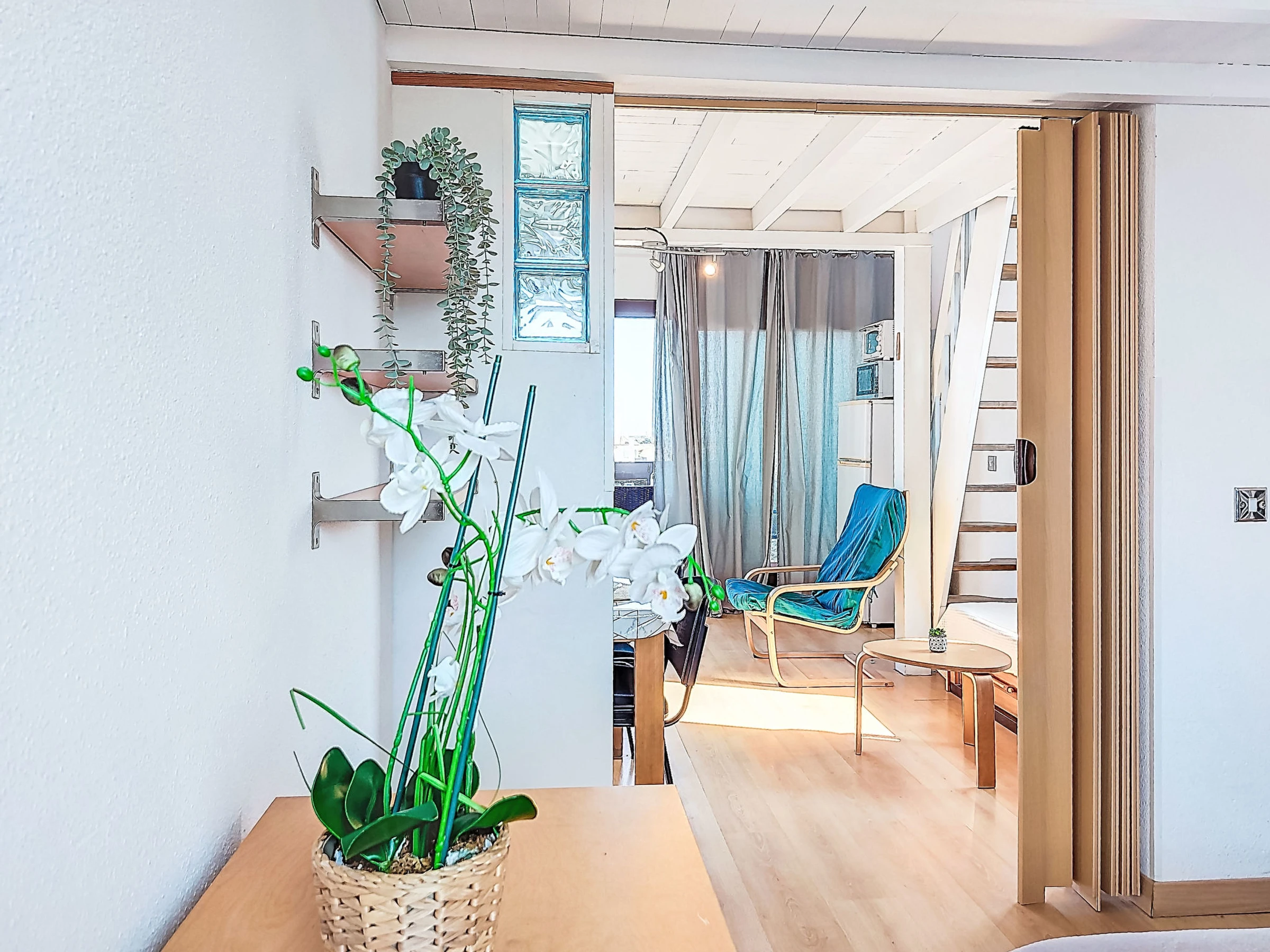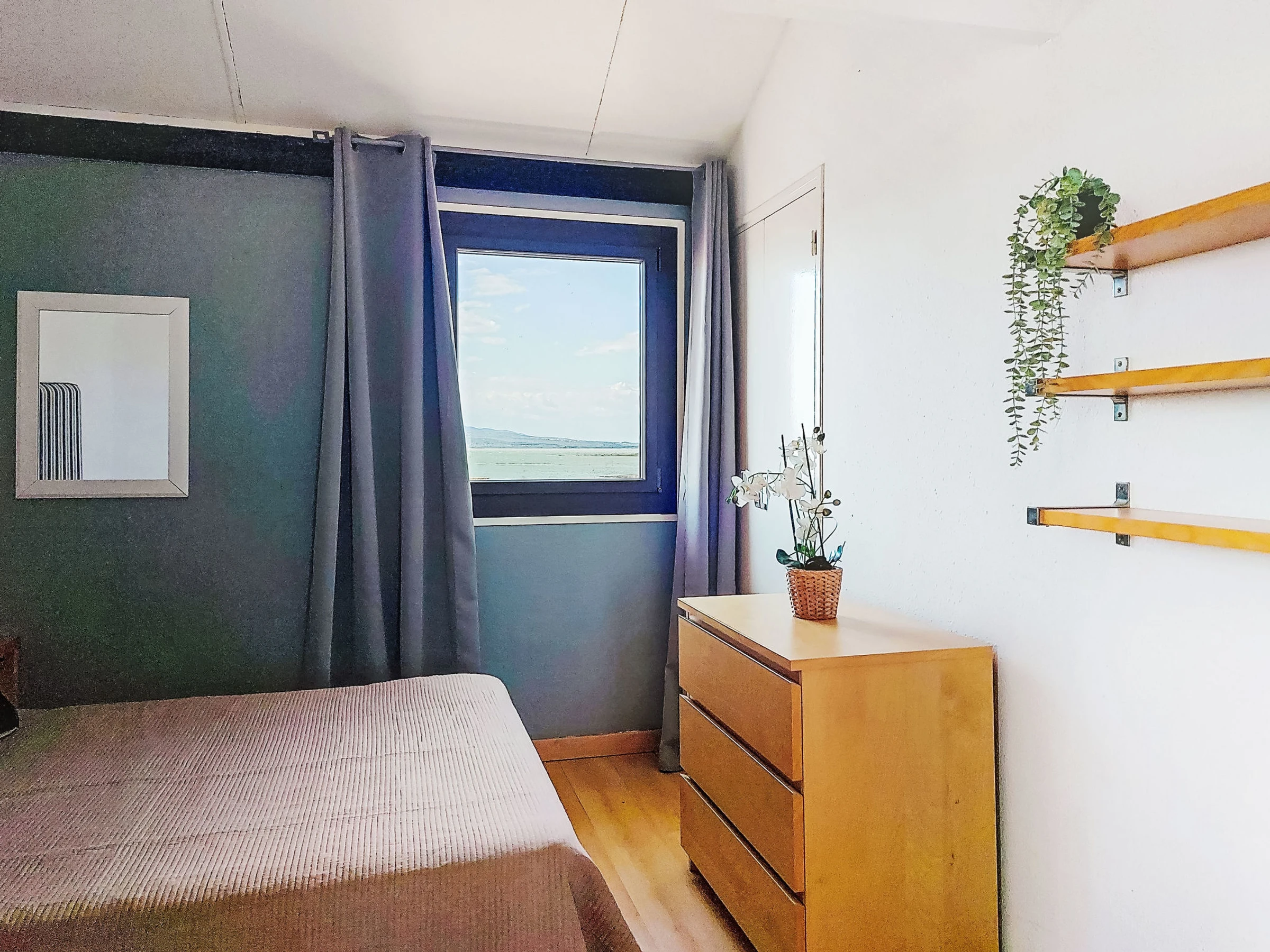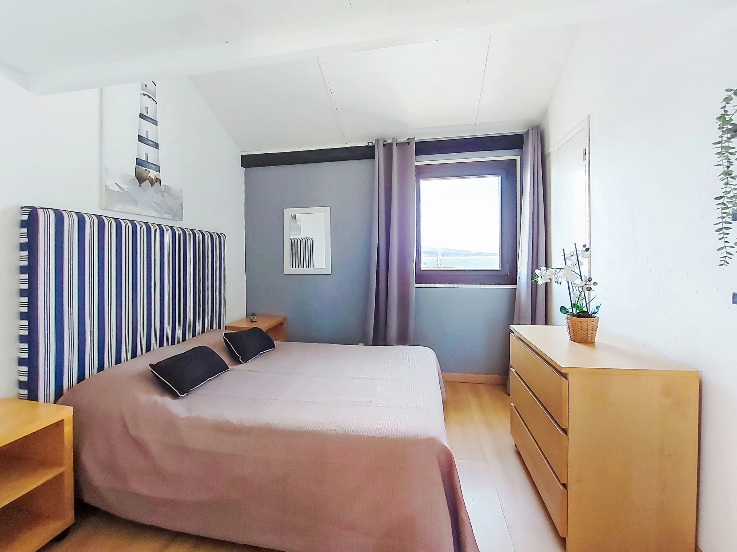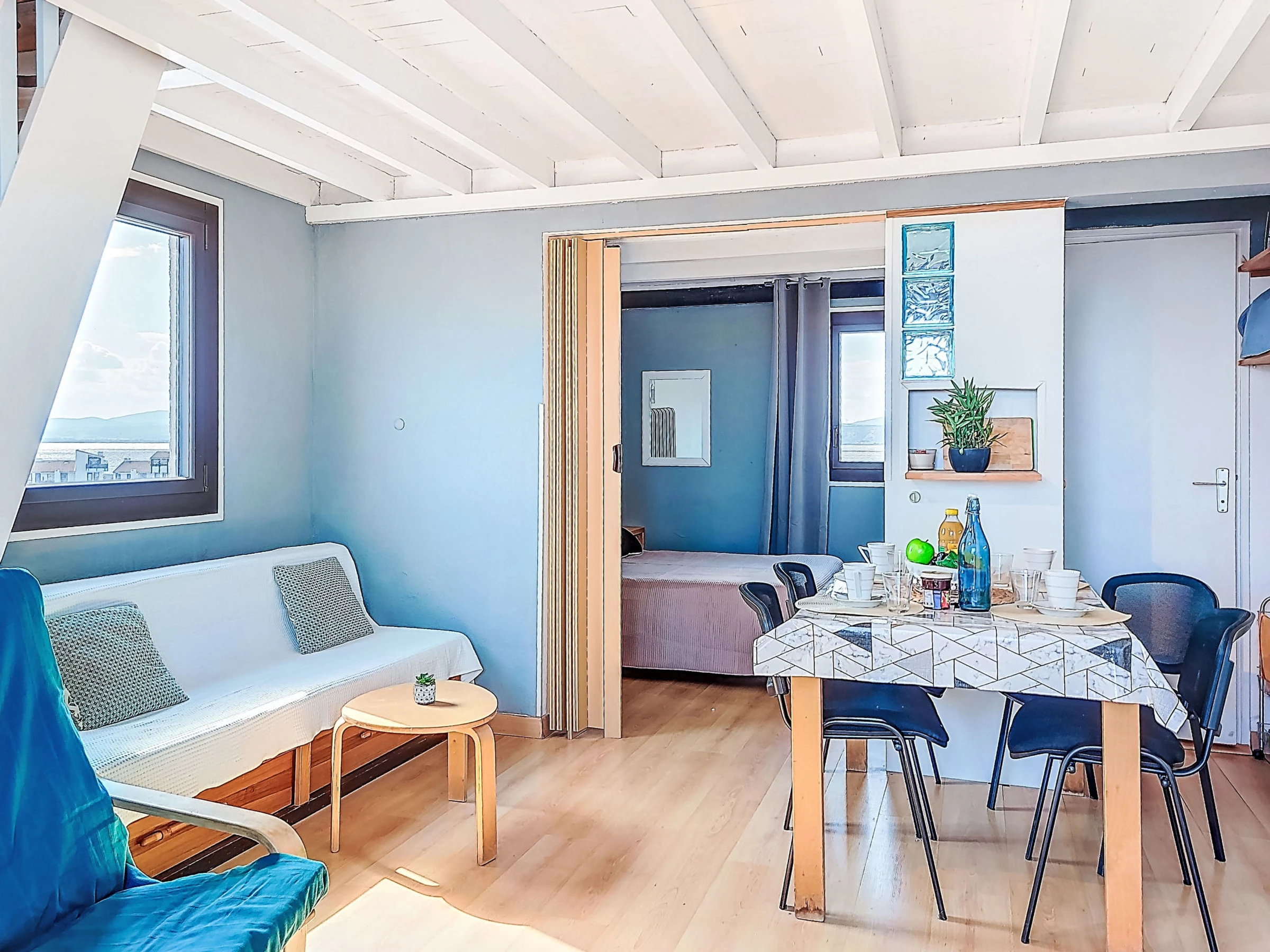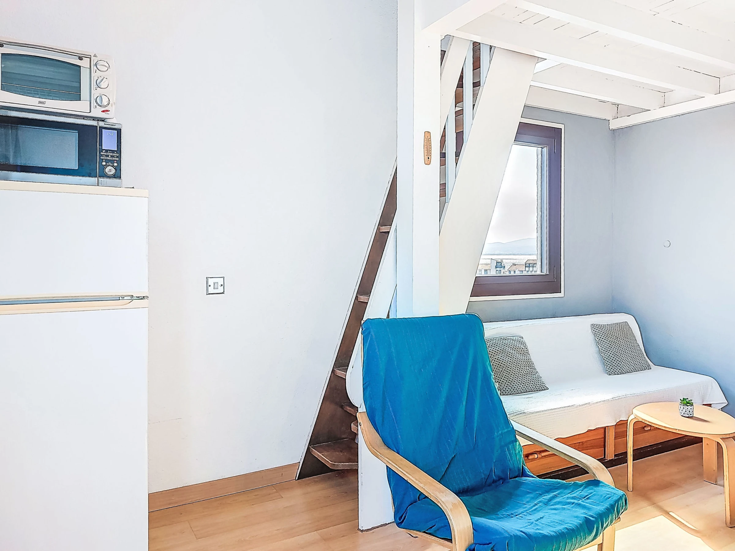 Apt 2 pièces 35 m2 au 3ème étage, situation sud-ouest. Séjour/salle à manger avec 1 divan-lit double (1 x 120 cm, longueur 190 cm), TV (écran plat), air-conditionné. Sortie sur la terrasse. 1 chambre avec 1 grand-lit (1 x 140 cm, longueur 190 cm). (4 plaques vitrocéramiques, congélateur, cafetière électrique, combiné micro-ondes). Douche/WC. À l'étage supérieur: (escalier raide) galerie avec 2 lits (80 cm, longueur 190 cm). Terrasse 7 m2. Meubles de terrasse, barbecue électrique. Belle vue sur le lac et les montagnes. A disposition: lave-linge. Internet (Connexion WIFI, en sus). Place de parking à 100 m. Veuillez noter: détecteur de fumée.