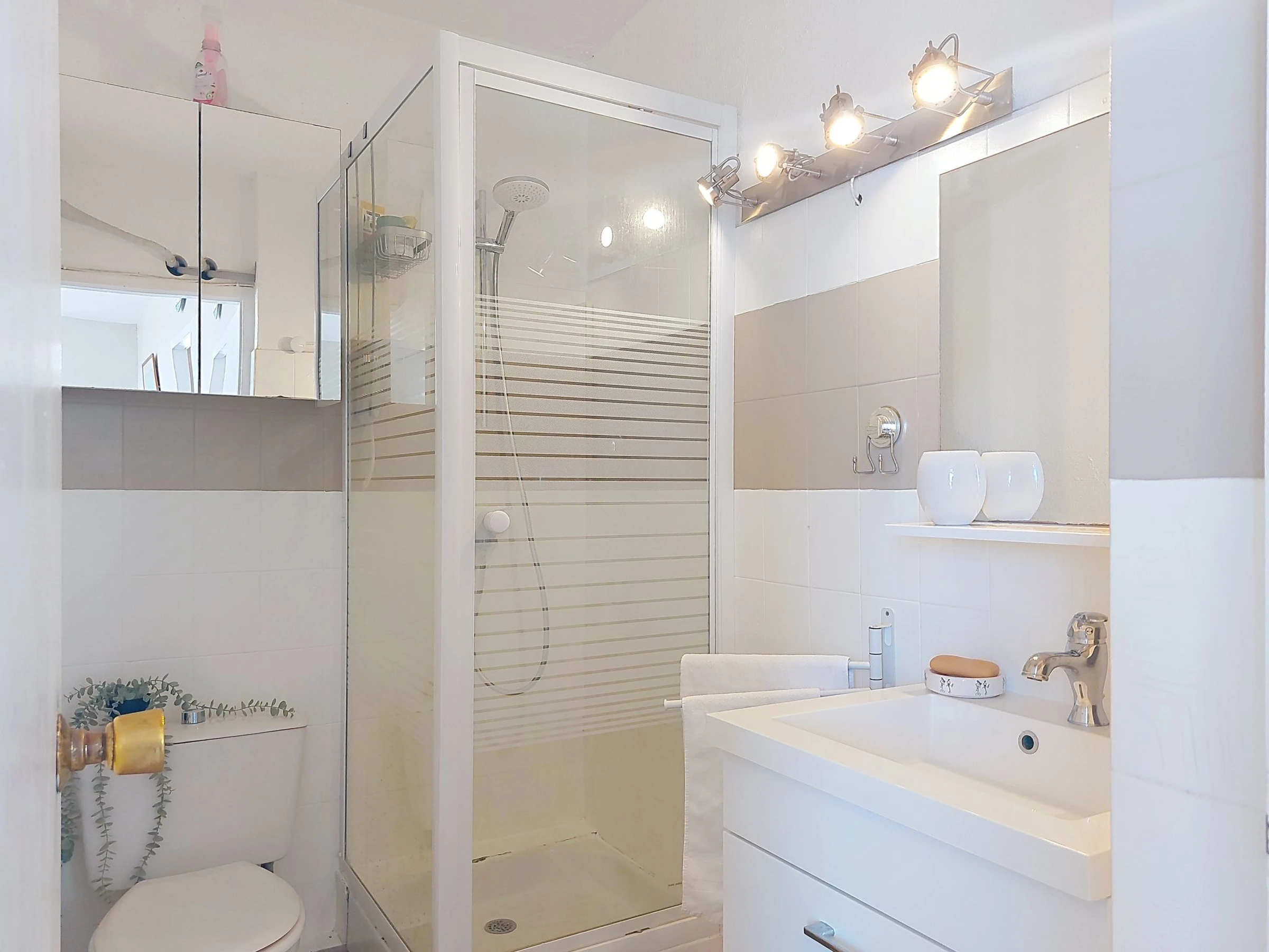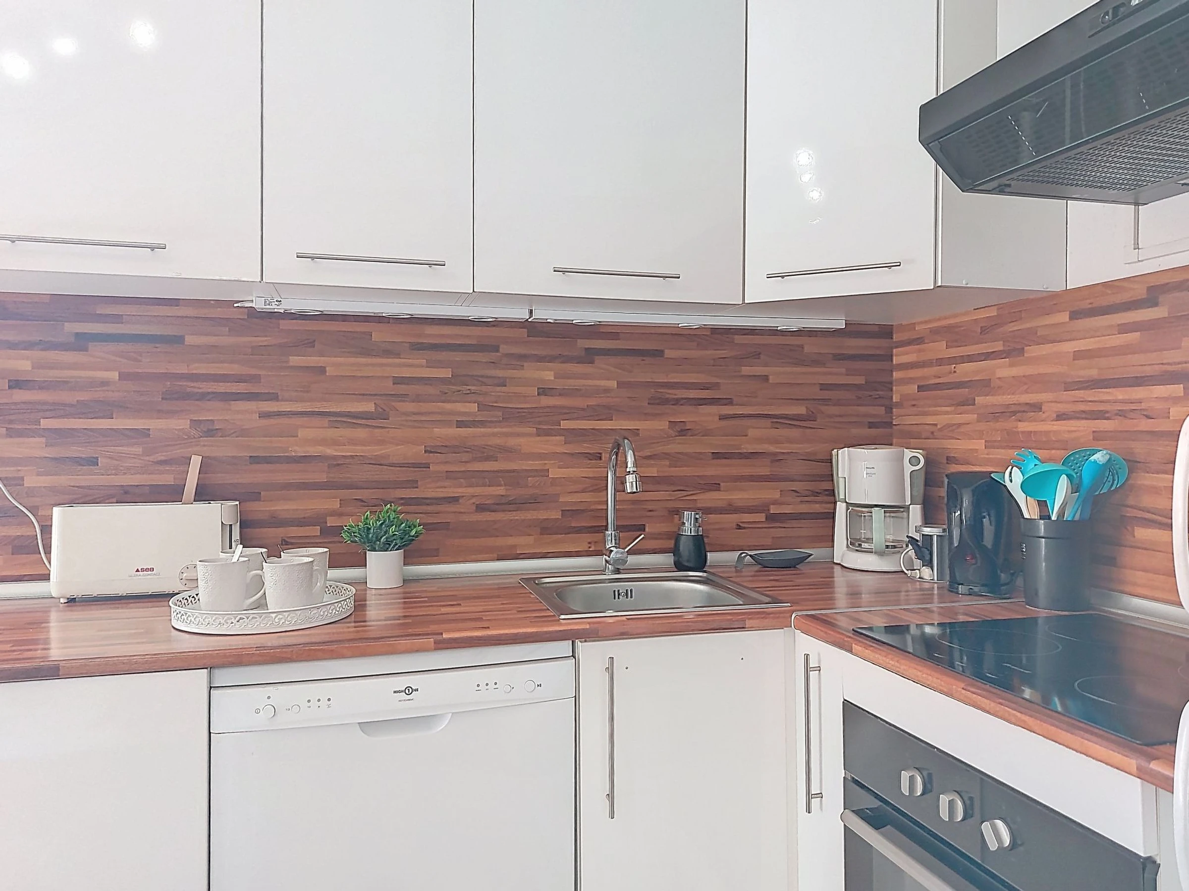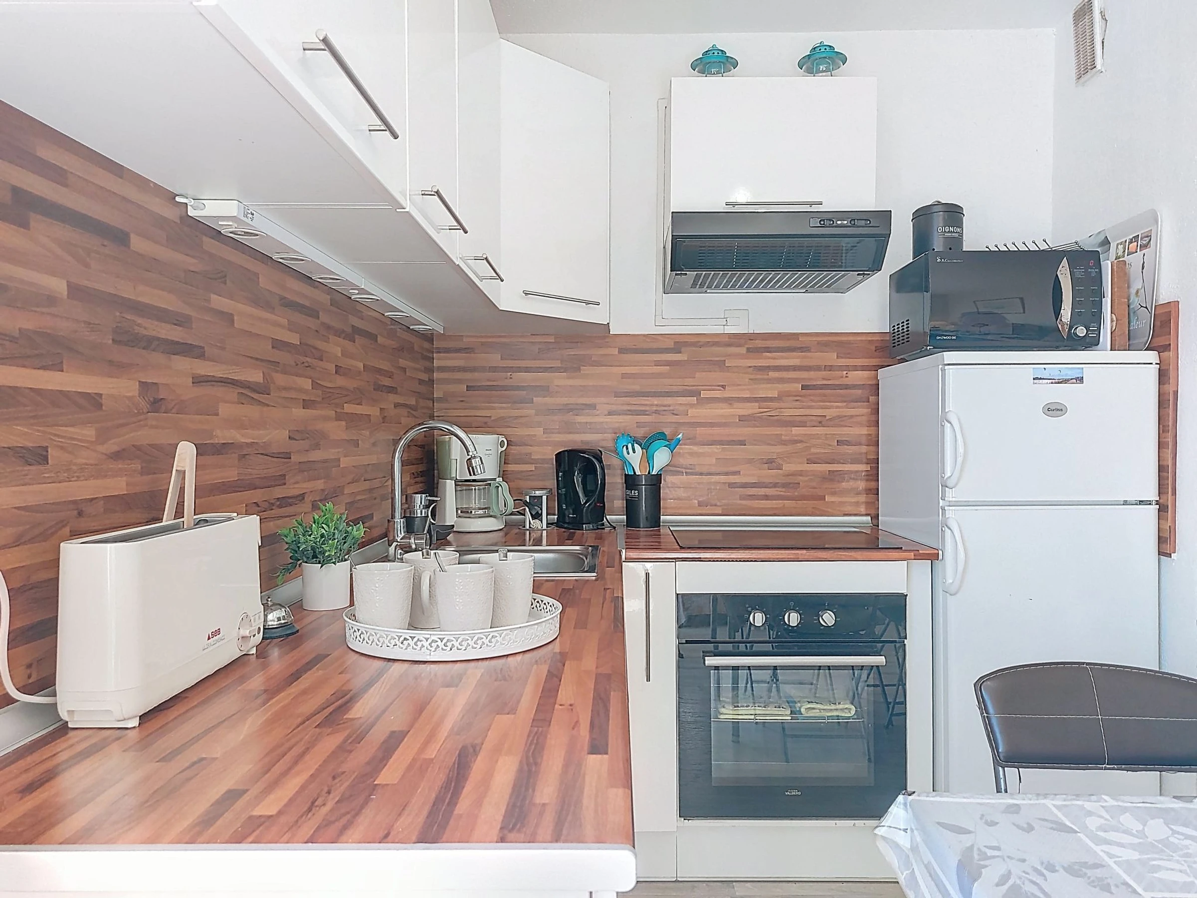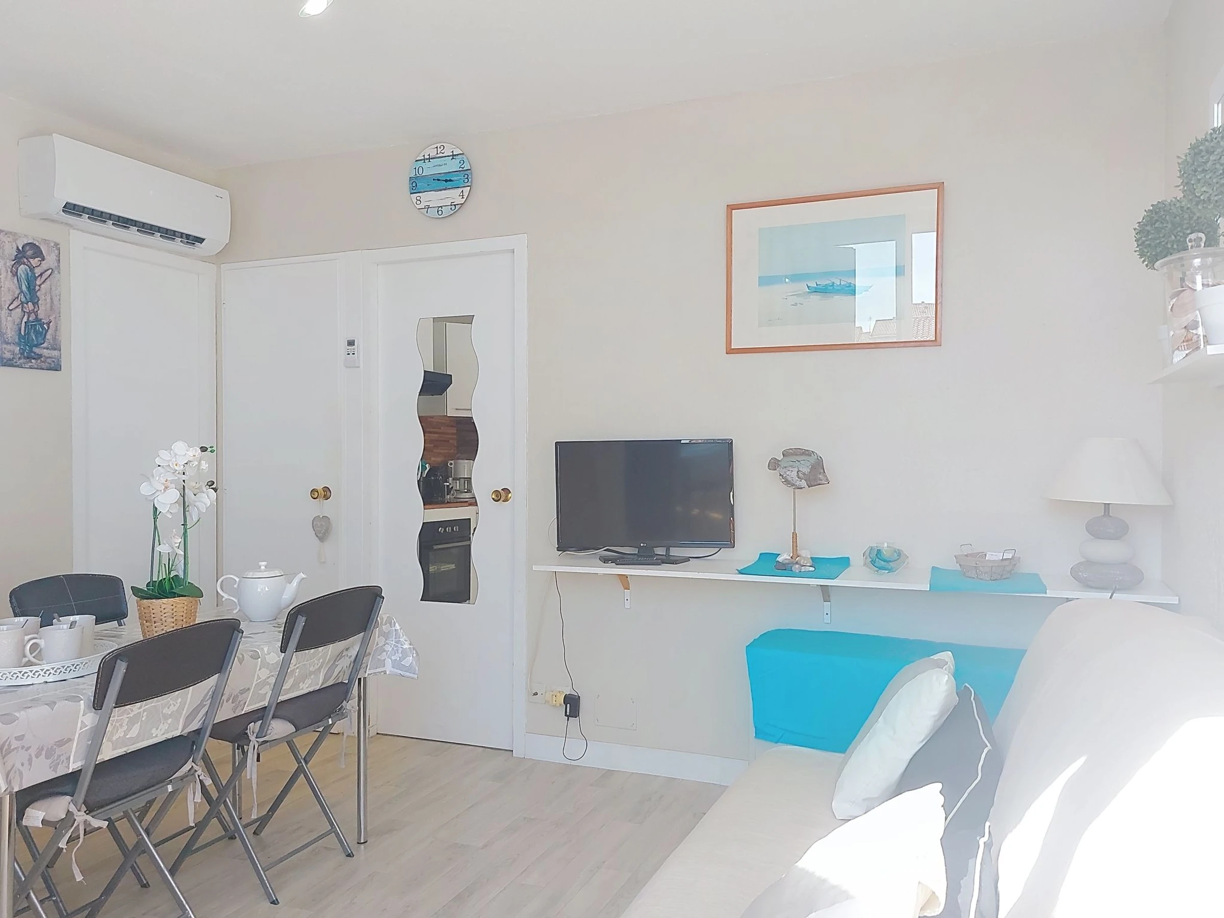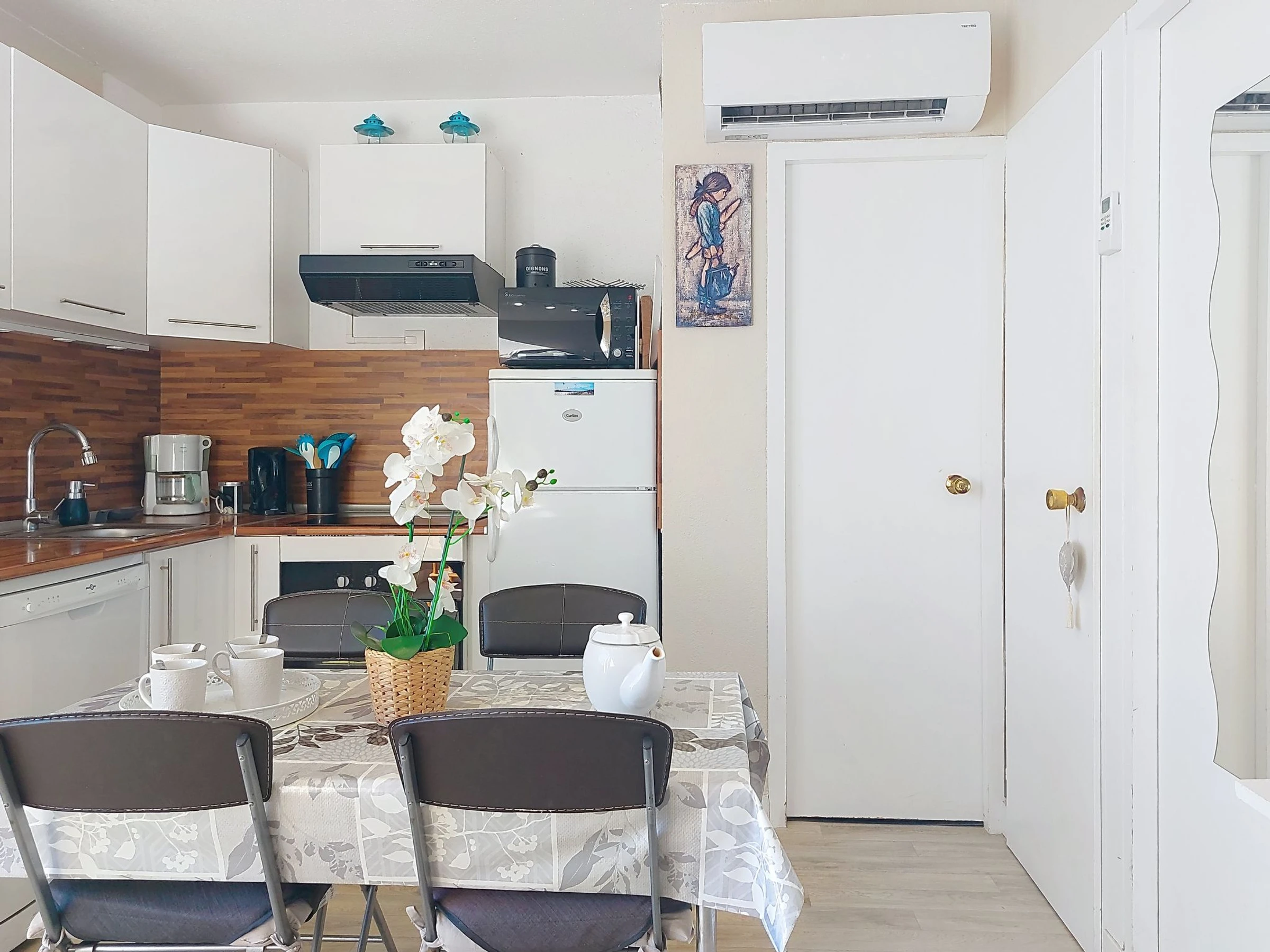 Apt 2 pièces 30 m2 au 1er étage, situation est. Séjour/salle à manger avec 1 divan-lit double (1 x 140 cm, longueur 190 cm), TV (écran plat). Sortie sur la terrasse. 1 chambre avec 1 divan-lit double (1 x 140 cm, longueur 190 cm), TV (écran plat). Cuisine ouverte (lave-vaisselle, 4 plaques à induction, grille-pain, bouilloire électrique, micro-ondes, cafetière électrique). Douche/WC. Air-conditionné. Terrasse 7 m2. Meubles de terrasse, barbecue électrique. Vue. A disposition: lave-linge. Internet (Connexion WIFI, en sus). Place de parking. Veuillez noter: détecteur de fumée. Annonce d'un particulier (art 155, IV du CGI).