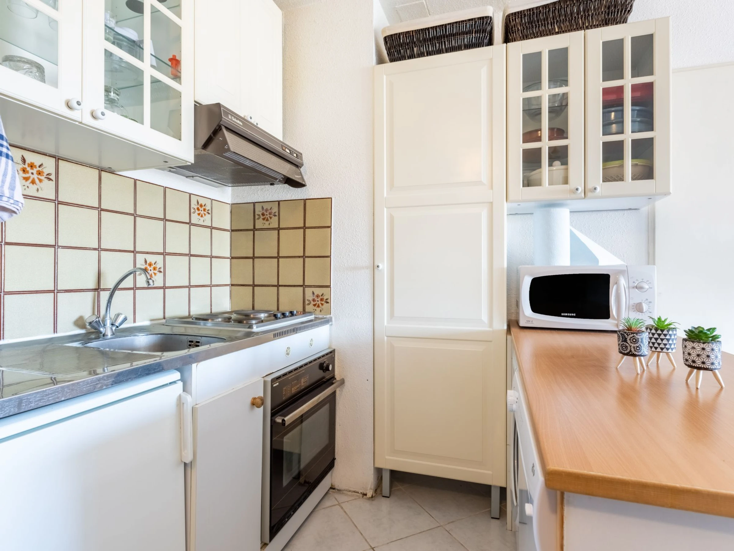 Apt 2 pièces 28 m2 au 3ème étage. Séjour/salle à manger avec 1 divan-lit double (1 x 140 cm, longueur 190 cm), TV (écran plat). Sortie sur la loggia. Cabine avec 1 x 2 lits superposés (90 cm, longueur 190 cm). 1 chambre avec 1 grand-lit (1 x 140 cm, longueur 190 cm). Coin cuisine (3 plaques de cuisson, four, lave-vaisselle, grille-pain, bouilloire électrique, micro-ondes, cafetière électrique). Bain/WC. Chauffage électrique. Vue latérale sur la mer et le lac. A disposition: lave-linge, sèche-linge. Internet (Connexion WIFI, en sus). Place de parking. Veuillez noter: détecteur de fumée. Au lieu d'une chambre fermée, des espaces de couchage sont situés dans une zone ouverte (galerie, alcôve...). Annonce d'un particulier  (art 155, IV du CGI).
