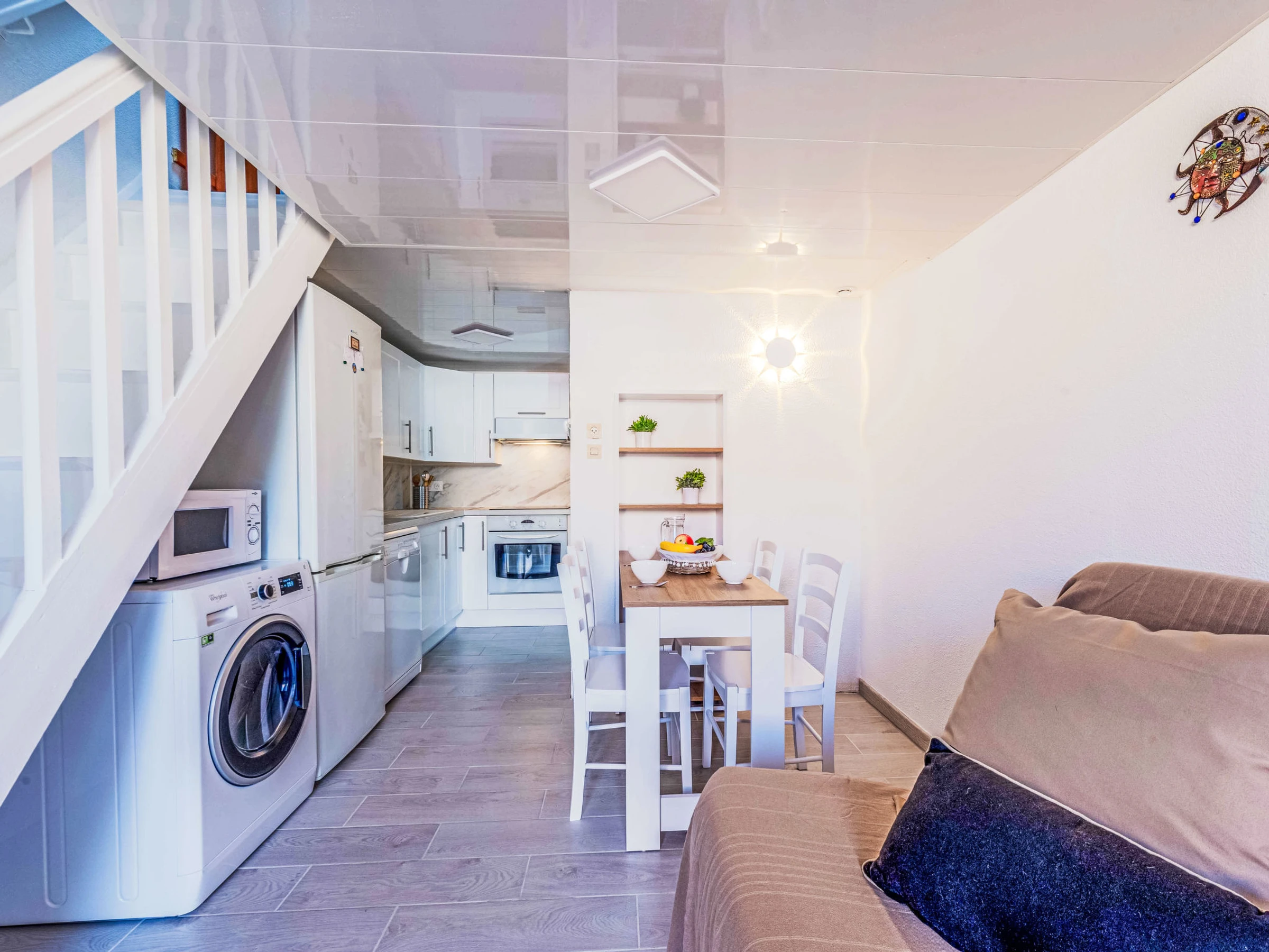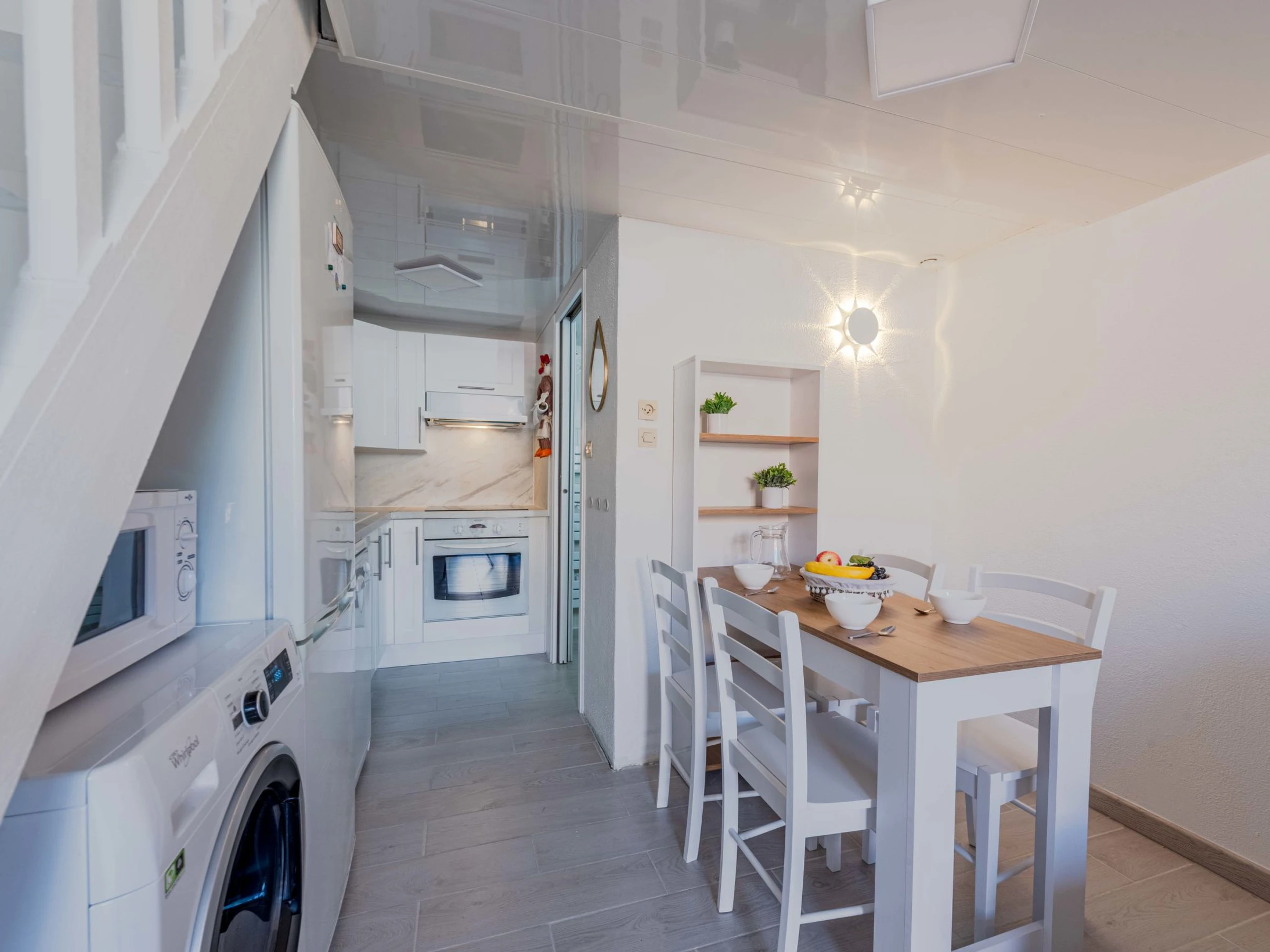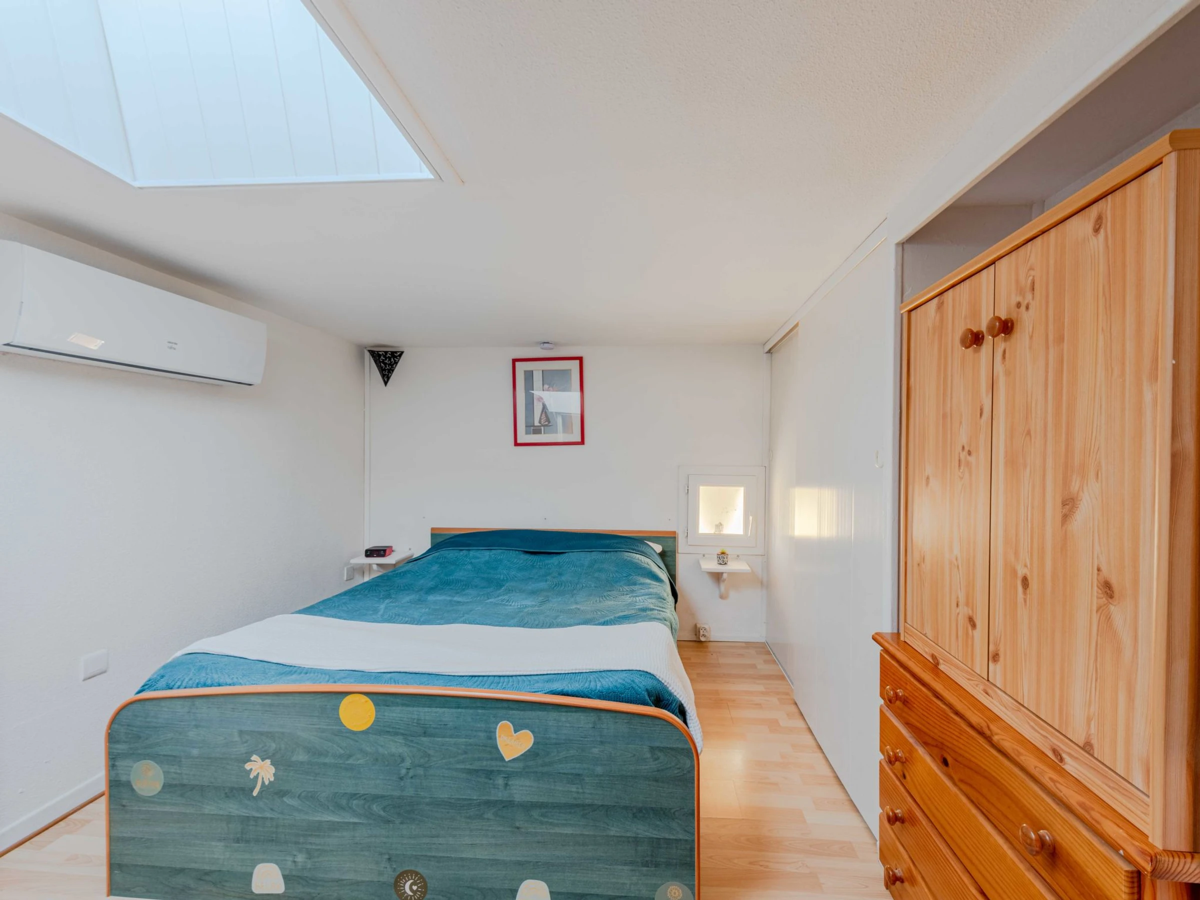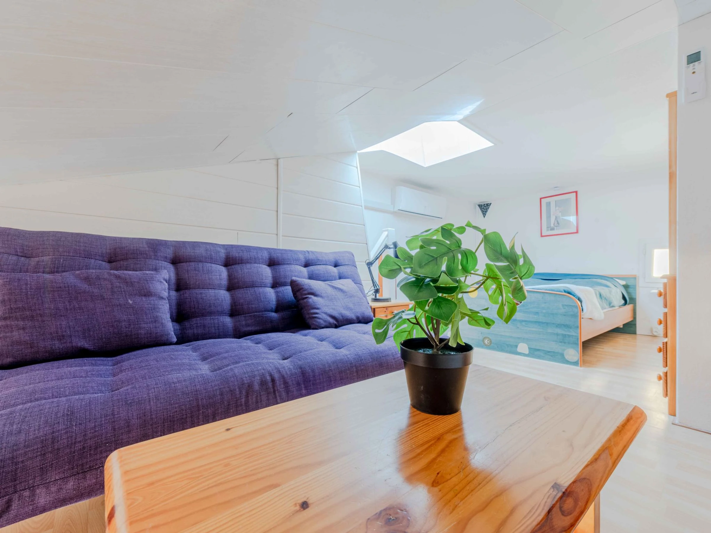Studio 22 m2 sur 2 niveaux. Séjour/salle à manger avec 1 divan-lit double (1 x 140 cm, longueur 190 cm), TV (écran plat), air-conditionné. Sortie sur la terrasse. Cuisine ouverte (mini-four, lave-vaisselle, 3 plaques vitrocéramiques, grille-pain, bouilloire électrique, micro-ondes, cafetière électrique). Douche/WC. Chauffage, air-conditionné. À l'étage supérieur: galerie ouverte avec 1 grand-lit (1 x 140 cm, longueur 190 cm), air-conditionné. Terrasse 15 m2. Meubles de terrasse, barbecue électrique. A disposition: lave-linge, sèche-linge, fer à repasser. Internet (Connexion WIFI, en sus). Place de parking. Veuillez noter: détecteur de fumée. Au lieu d'une chambre fermée, des espaces de couchage sont situés dans une zone ouverte (galerie, alcôve...). Annonce d'un particulier (art 155, IV du CGI).