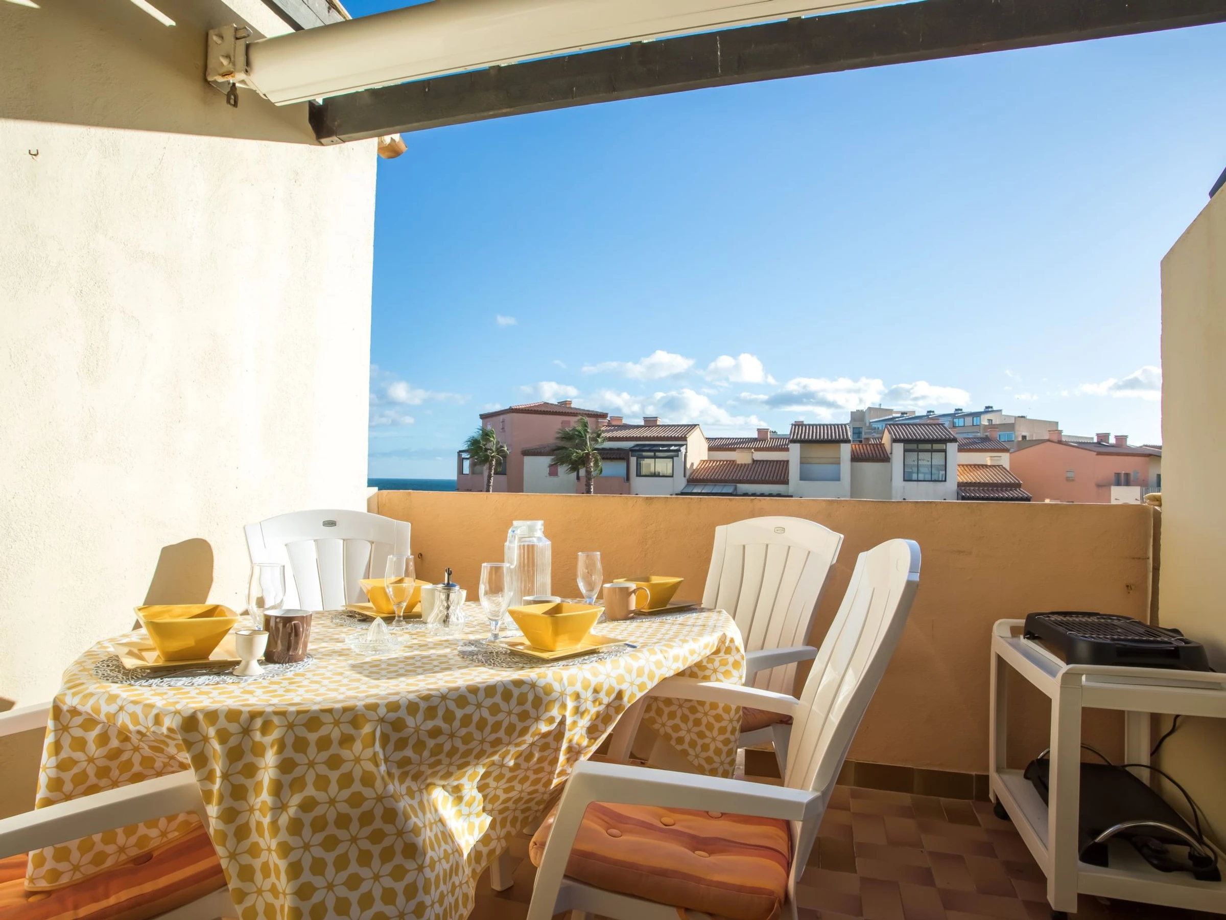 Apt 2 pièces 28 m2 au 3ème étage. Séjour/salle à manger avec TV (écran plat). Sortie sur la terrasse. 1 chambre avec 1 grand-lit (1 x 140 cm, longueur 190 cm). Coin cuisine (4 plaques de cuisson, lave-vaisselle, micro-ondes, cafetière électrique). Douche/WC. Chauffage électrique. À l'étage supérieur: (escalier raide) galerie 13 m2, mansardée avec 1 grand-lit (1 x 140 cm, longueur 190 cm), TV (écran plat), DVD. Terrasse 6 m2. Meubles de terrasse, barbecue électrique (portable). Belle vue sur la mer et les montagnes. A disposition: lave-linge, fer à repasser. Internet (Connexion WIFI, gratuit). Place de parking. Veuillez noter: détecteur de fumée. Au lieu d'une chambre fermée, des espaces de couchage sont situés dans une zone ouverte (galerie, alcôve...). Annonce d'un particulier  (art 155, IV du CGI).