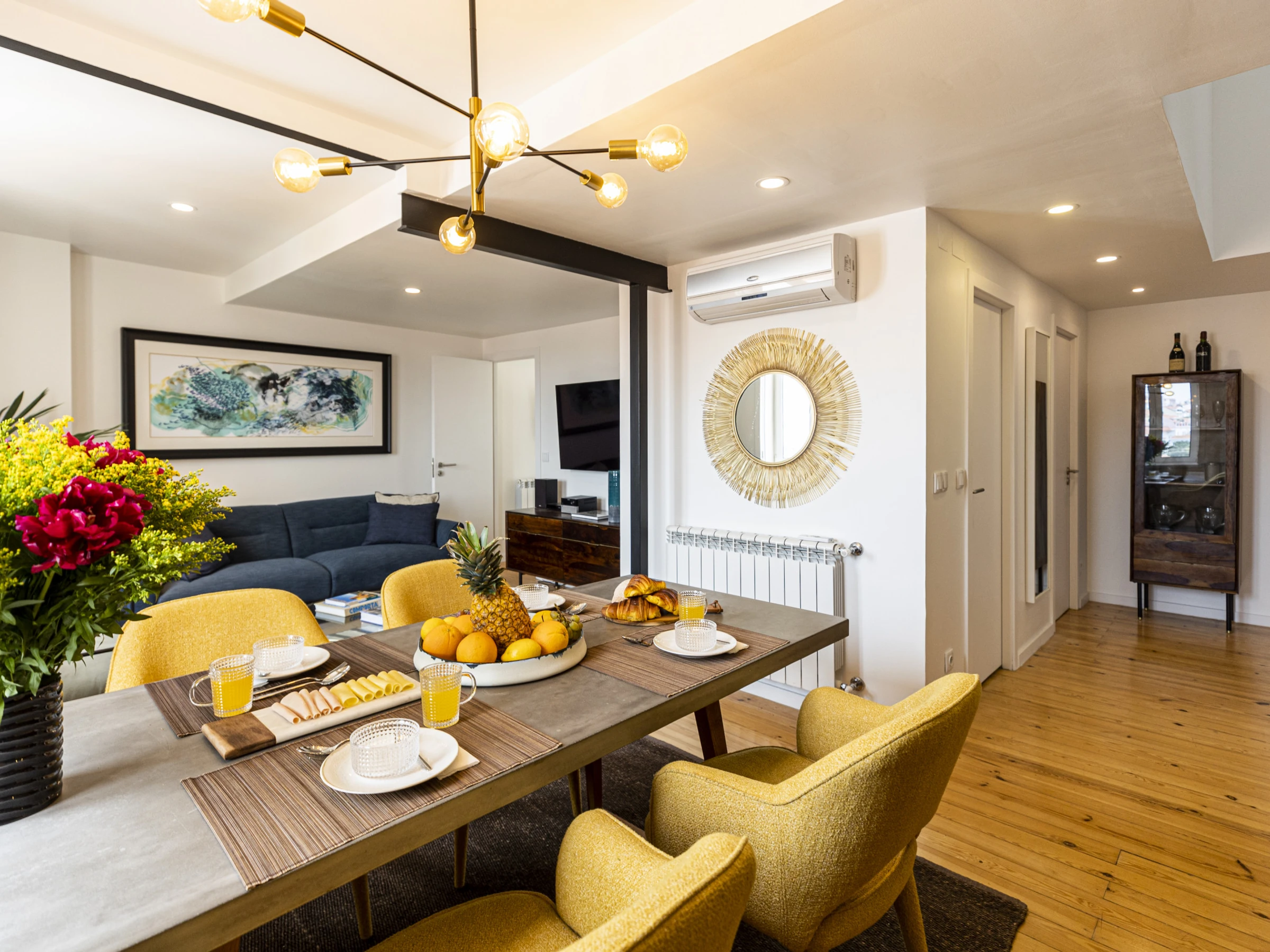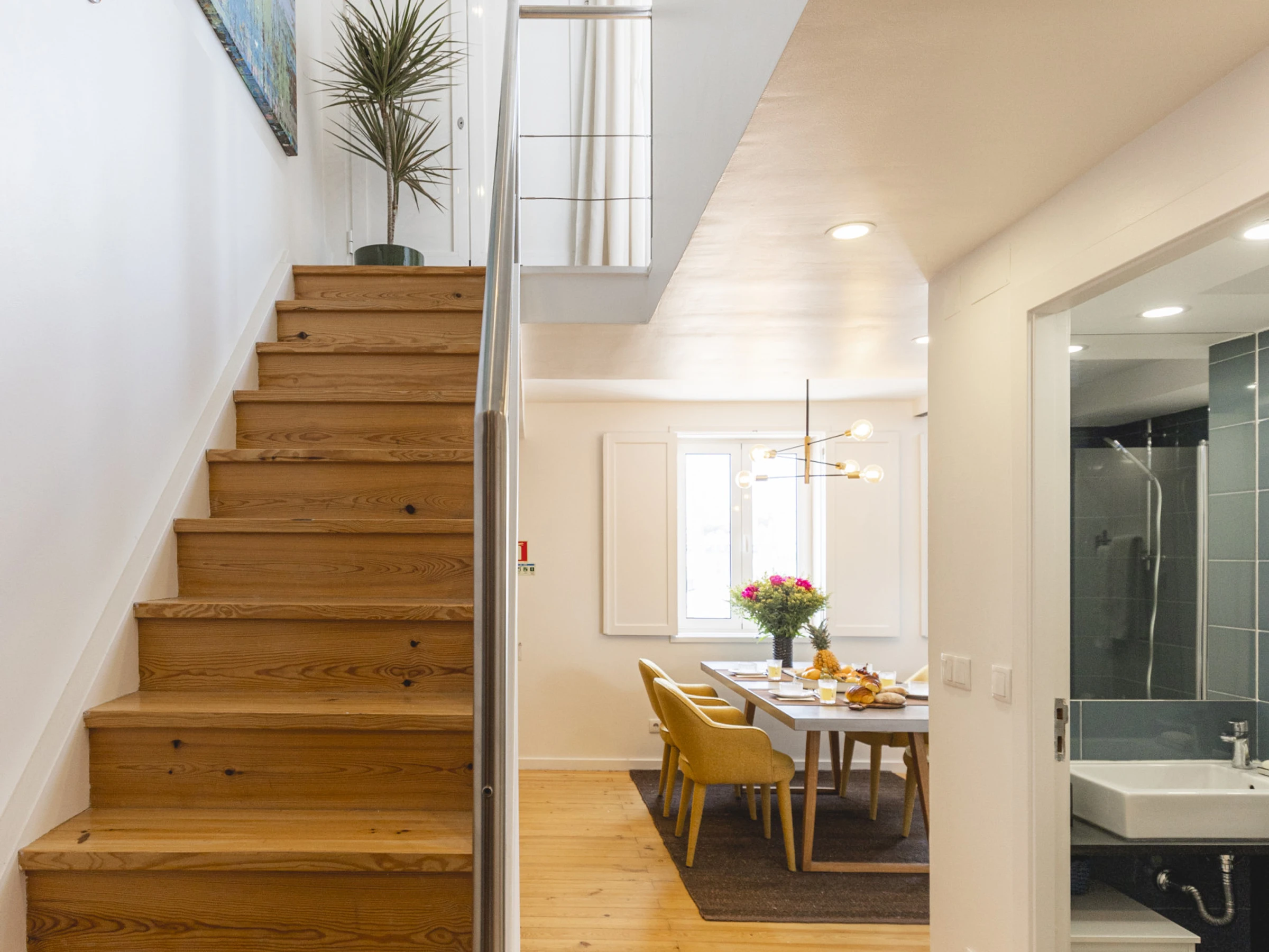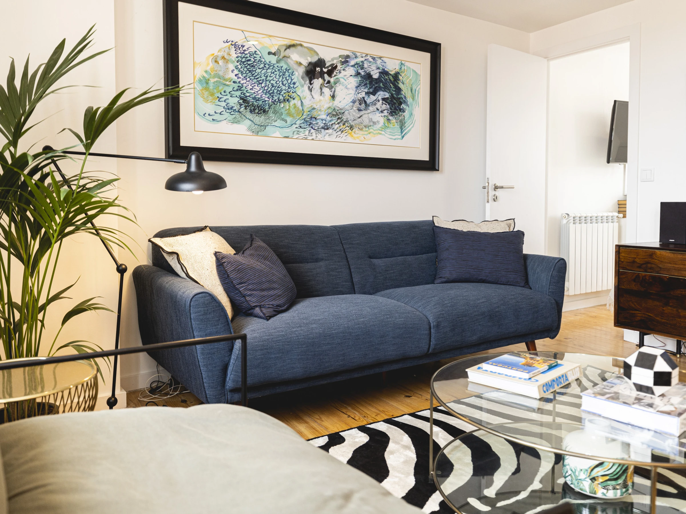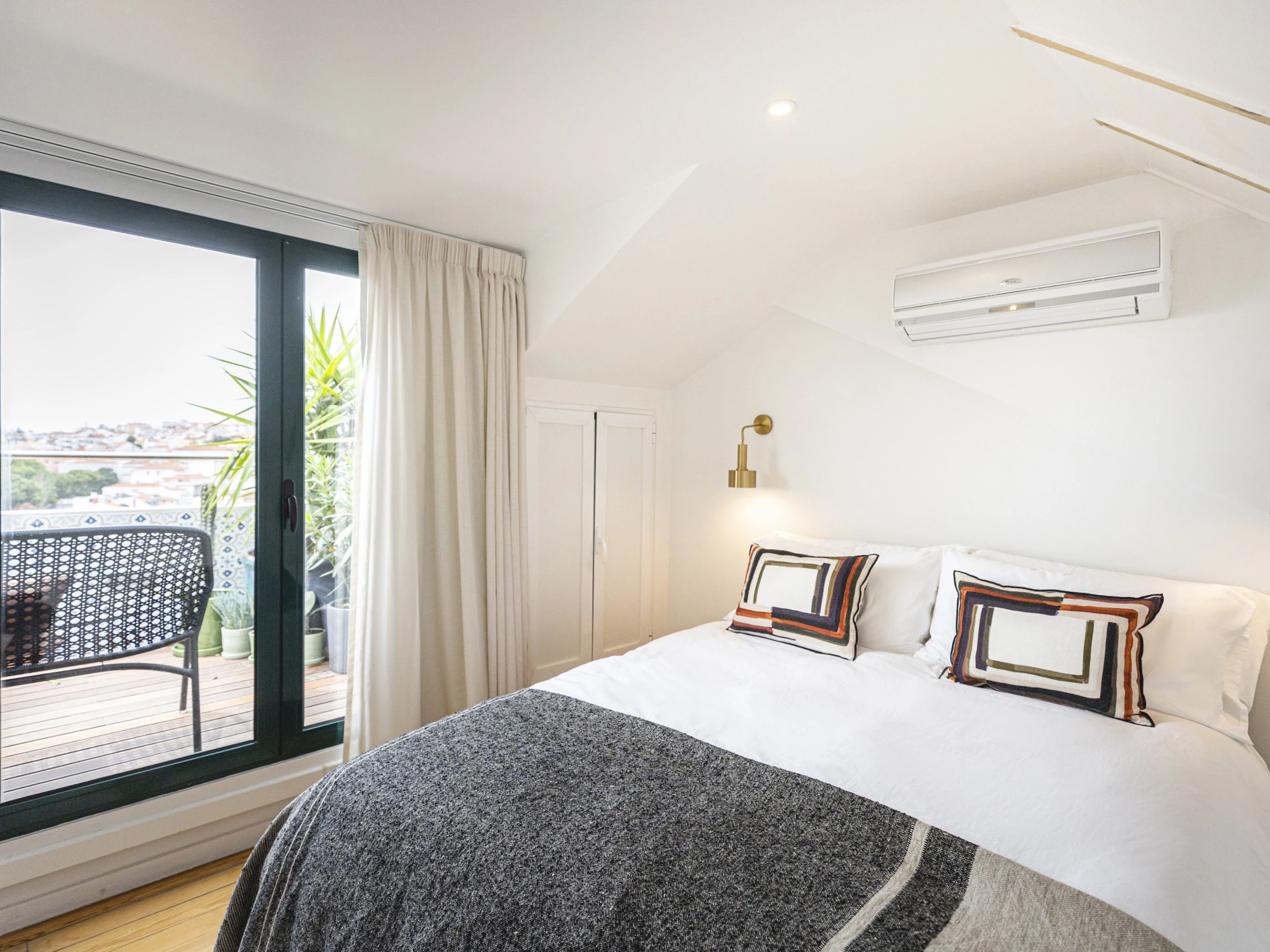 Soft yellow chairs are positioned around the table, adding a cheerful feeling to the apartment. The bathrooms are in keeping the rest of the flat: modern, comfortable and stylish. Different shades of blue tiling are juxtaposed with the white amenities to create a feeling of utter cleanliness. The roof terrace is arguably this flat’s most amazing feature, with a bench for you to sit on and enjoy your morning coffee or an evening sundowner whilst watching the world go past and the sea in the background. This apartment is comfortable, chic and accessible, and offers the most unforgettable spot to explore Lisbon from.